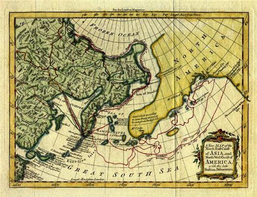 Alaska Unknown. "A new map of the North East Coast of Asia as North West Coast of America with the late Russian Discoveries." Published 1764. About 7 x 9. What is now Alaska is shown as an empty, nameless mass. Attractively handcolored, with decorate cartouche at lower right. Also shown are tracks of Bering and other explorers. Light original folds, else very fine.