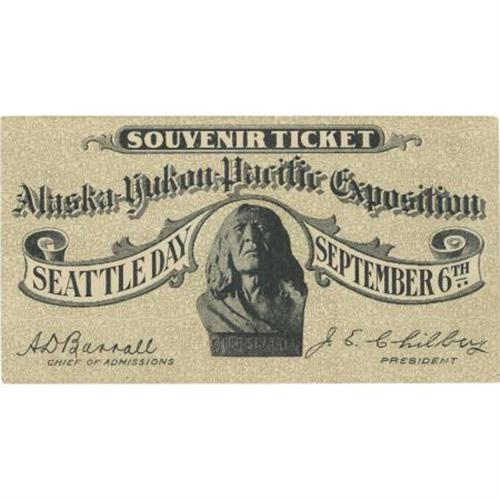 <B>Alaska-Yukon-Pacific Exposition, Seattle Day Souvenir Ticket,</B></I> 4 x 2.25, September 6, 1906. Featuring a bust of Chief Seattle. Clean in fine condition. <BR><BR><b>Shipping:</b> Flat Material, Small (<a target="_blank" href="http://www.heritageauctions.com/common/shipping.php">view shipping information</a>)