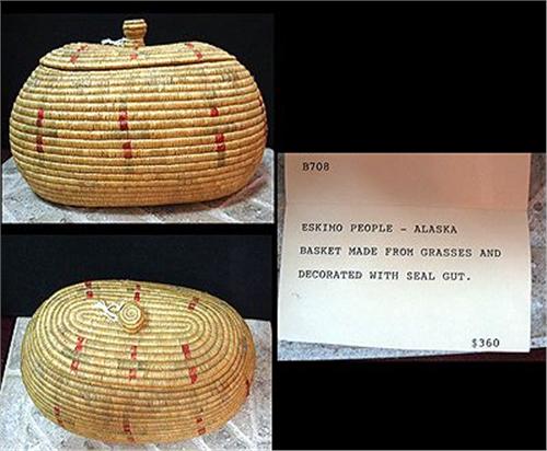 Alaska basket made from grasses and decorated with seal gut. Basket is in good condition with original info card on it. Stands 5 1/2" tall and measures 8" across the bottom
