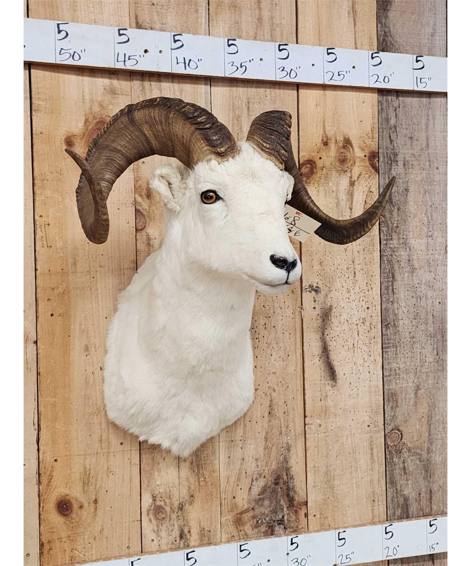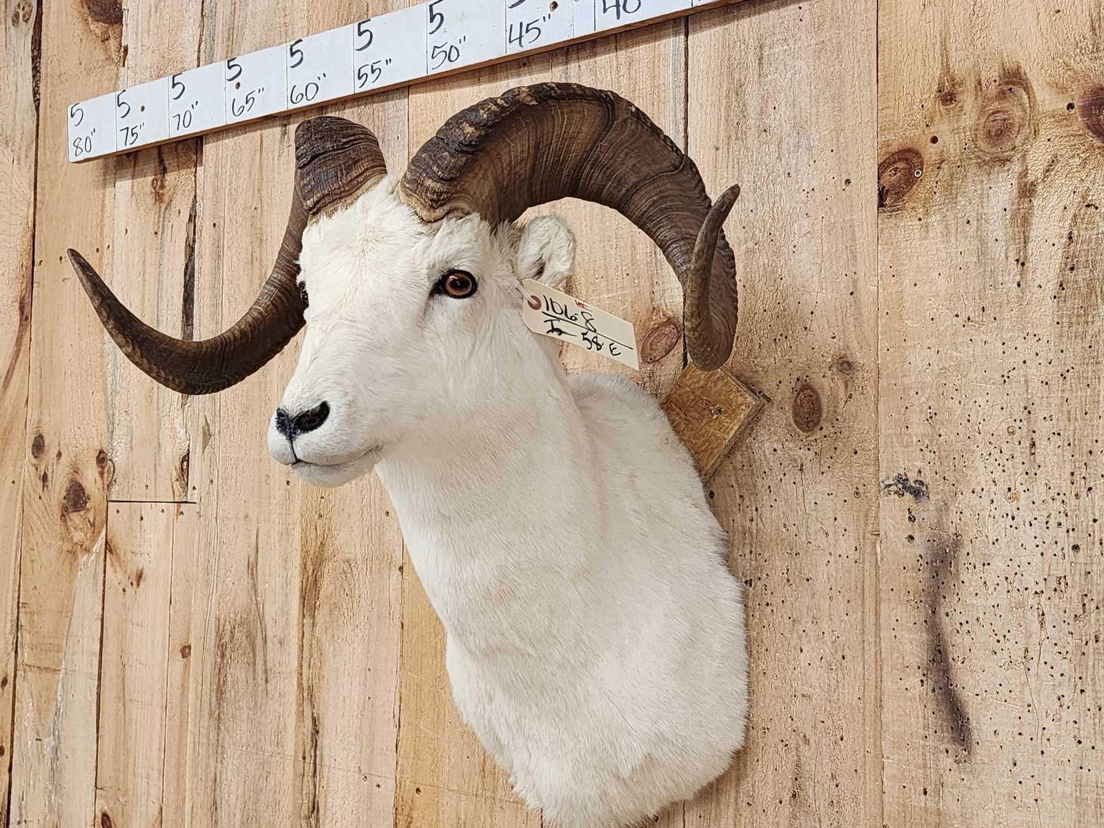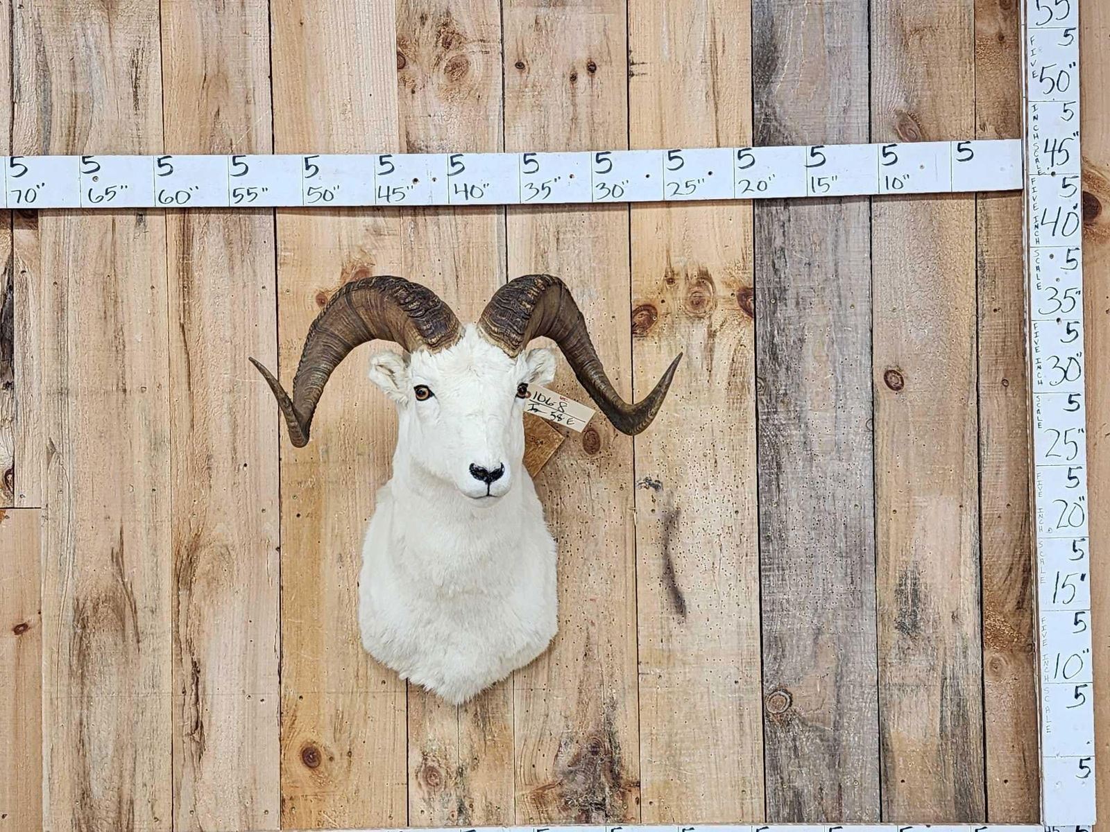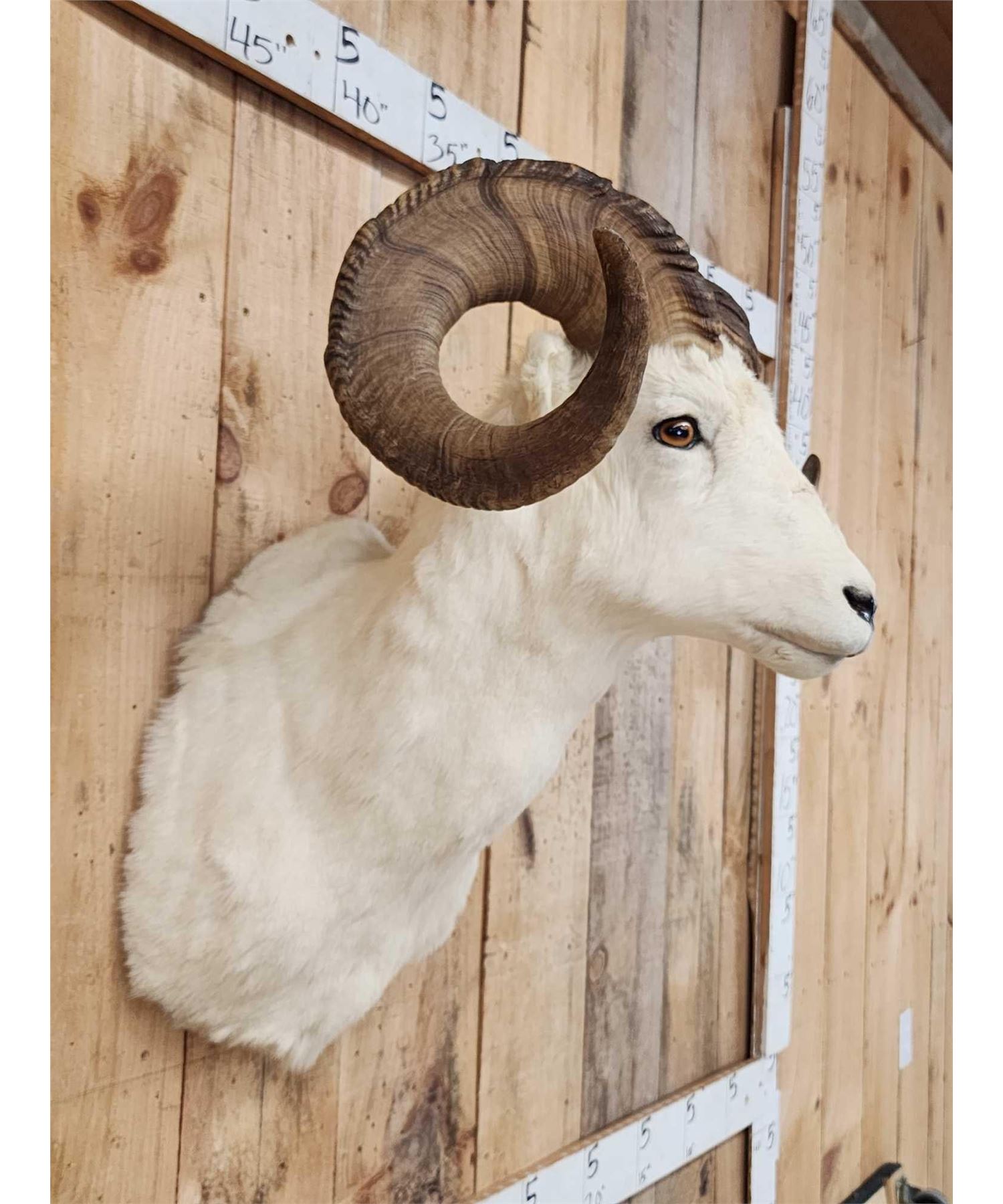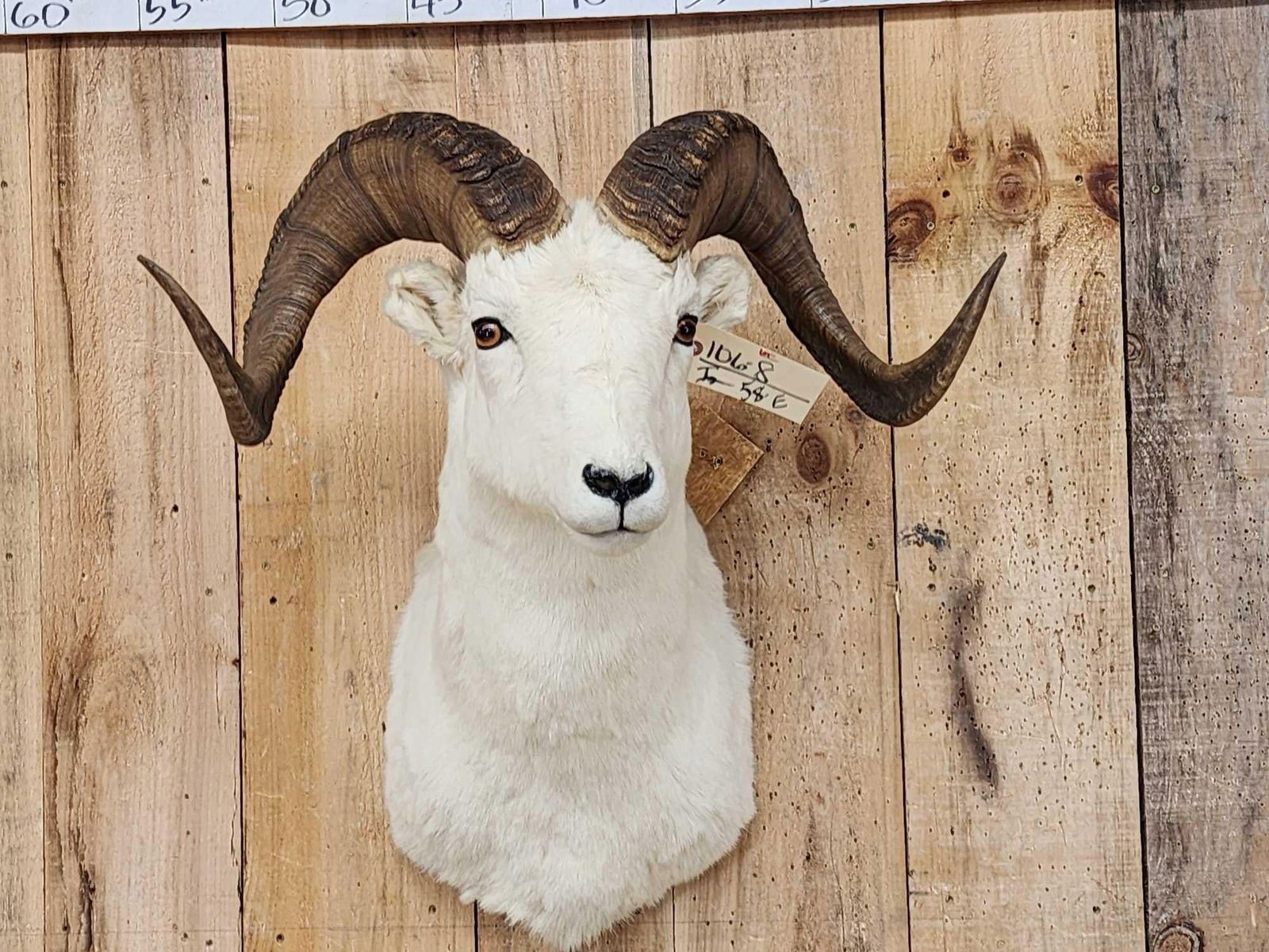 106.8 Solid mount pretty hair full curl horns with plug Right horn length about 33 4/8" with a 12 2/8" base Left 33 7/8" with a 12 5/8" base