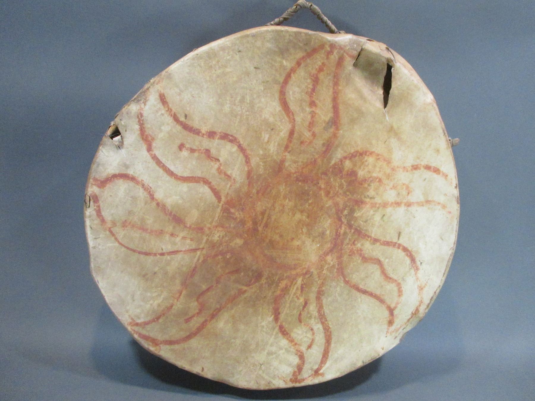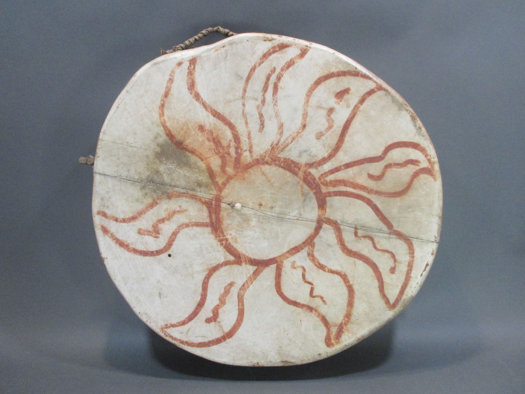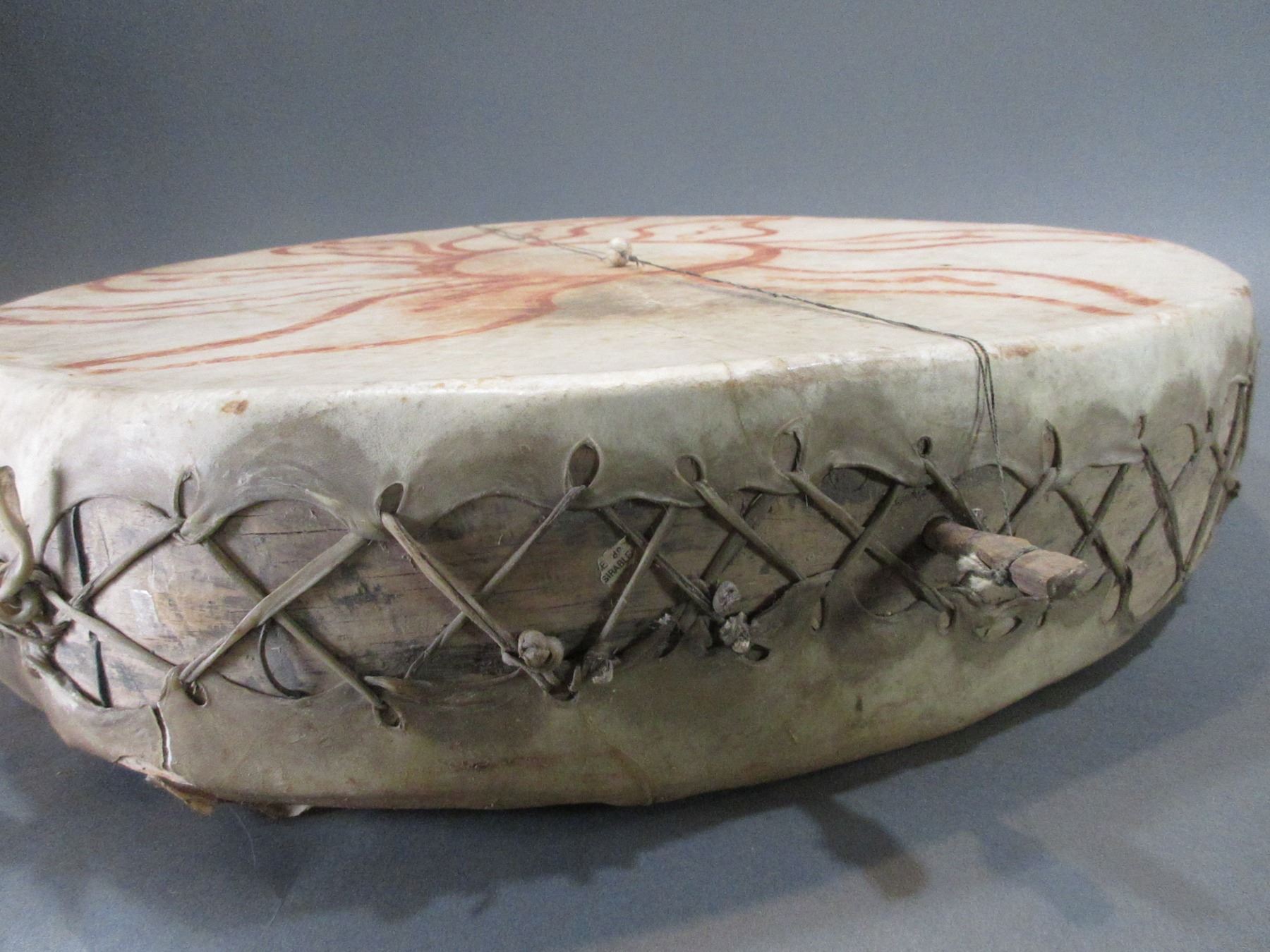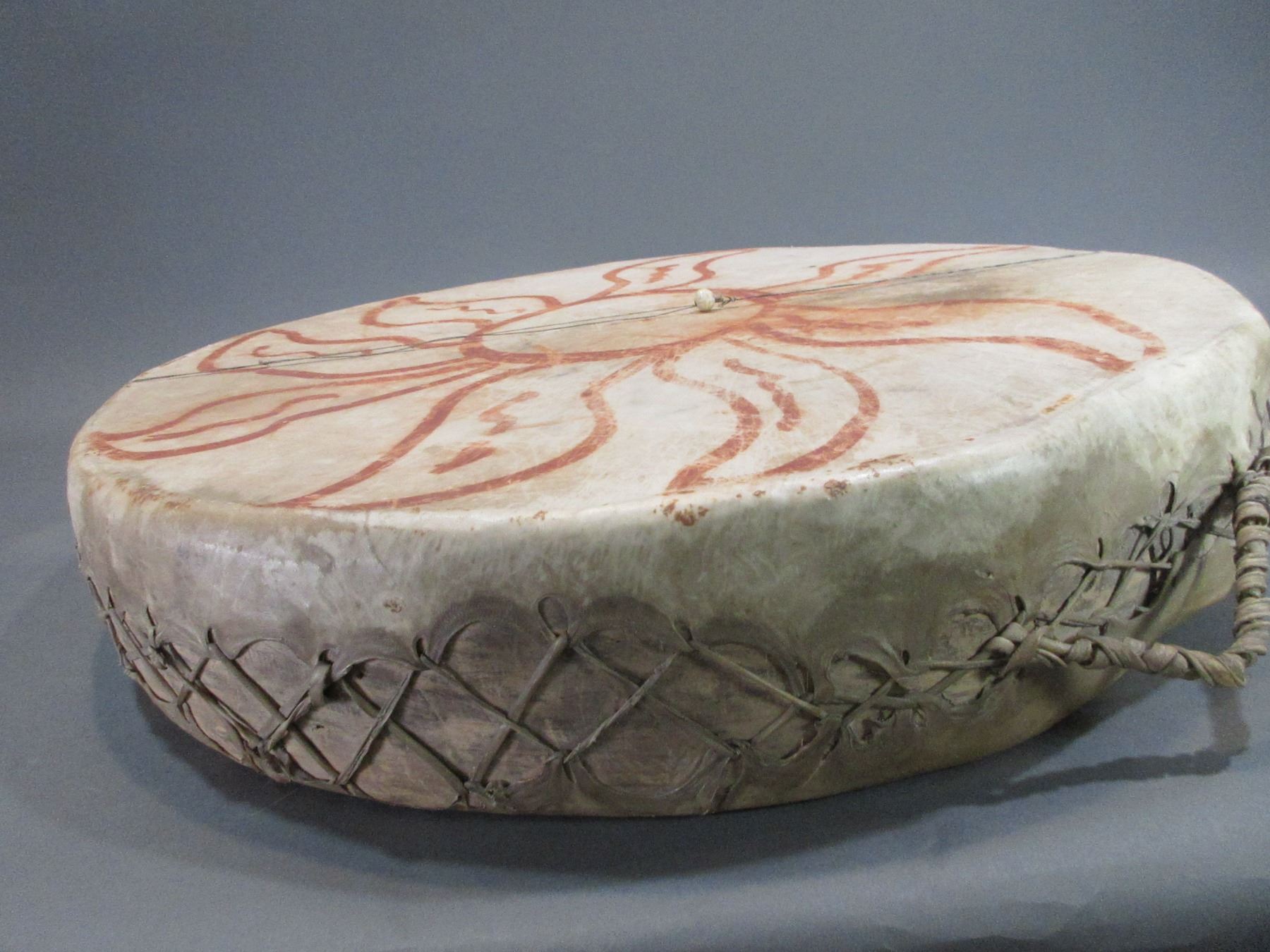 Alaskan Eskimo Caribou Hide Drum- Caribou Rawhide Strung- Hand Painted- 26"- Back Is Damaged- Cool Piece