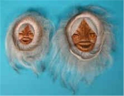 These masks have been carved by hand from the bark of the black cottonwood tree, which occurs in the lowlands of Alaska's south-central and southern coastal forests. The bark comes from trees that have been dead for five to six years. It is then possible to remove the bark which can measure up to six inches thick. The masks are trimmed with real fur, either reindeer, beaver, fox, or Icelandic sheepskin.
