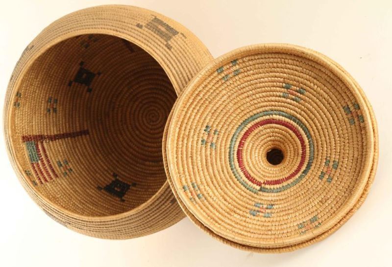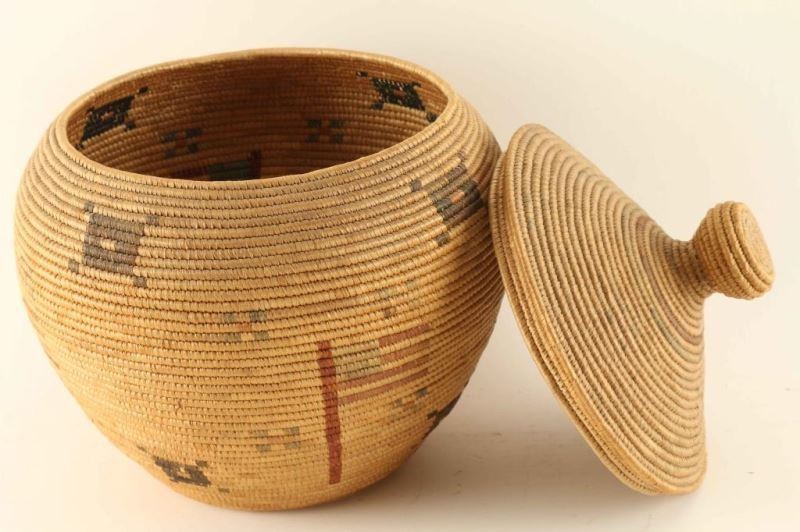 Coiled rod basket with lid. Jar shape with four American flags and geometric designs in red, white, blue and black. Measures 10"x10" good condition.