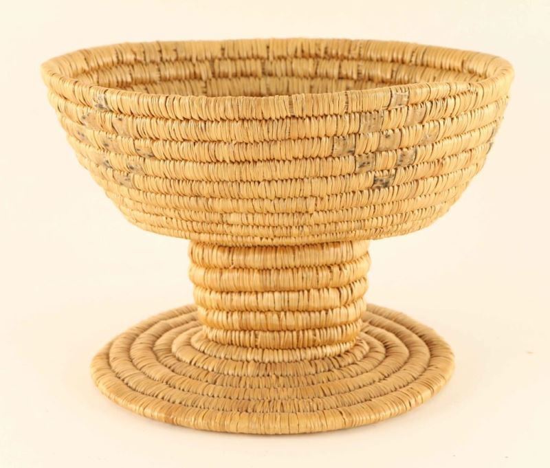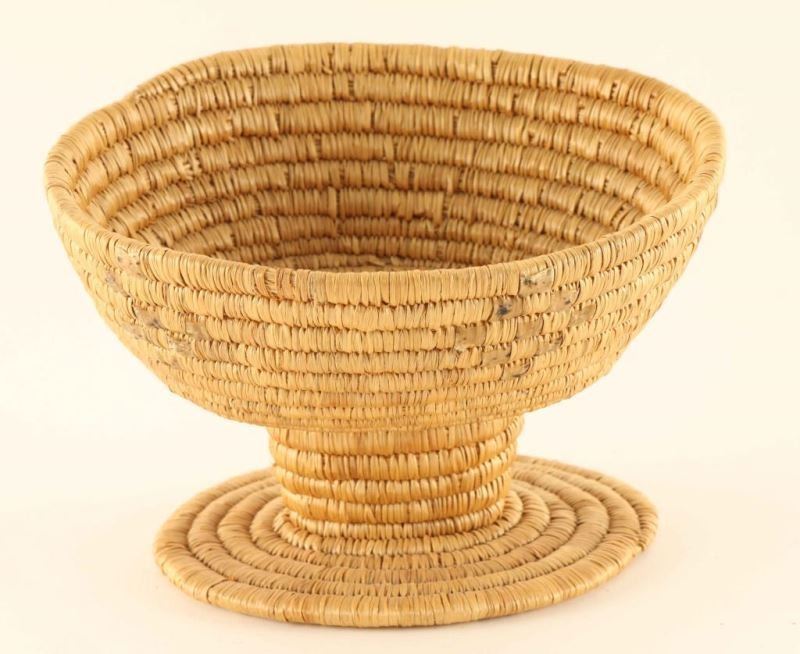 Rare bowl type basket with single foot made of wild grass with fish skin diamond design on upper half. Some scattered loses otherwise good.