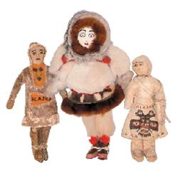 Alaskan Indian dolls (3); 2 early 1900's deerskin dolls, one has painted face, other is embroidered w/beaded dress & 1930's vinyl & fur doll w/embroidered face, Good to Exc. condition, 9.5" to 13"H.