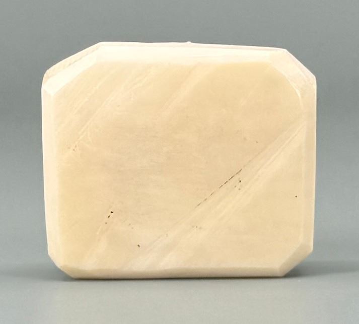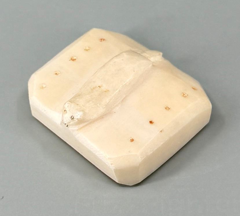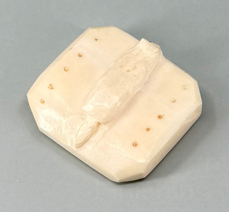 1" by 1" by 3/8". Carved walrus material. Native made prior to 1972. This item cannot be shipped to Oregon, California, Hawaii, New York, New Jersey, Internationally, or any other state that prohibits.