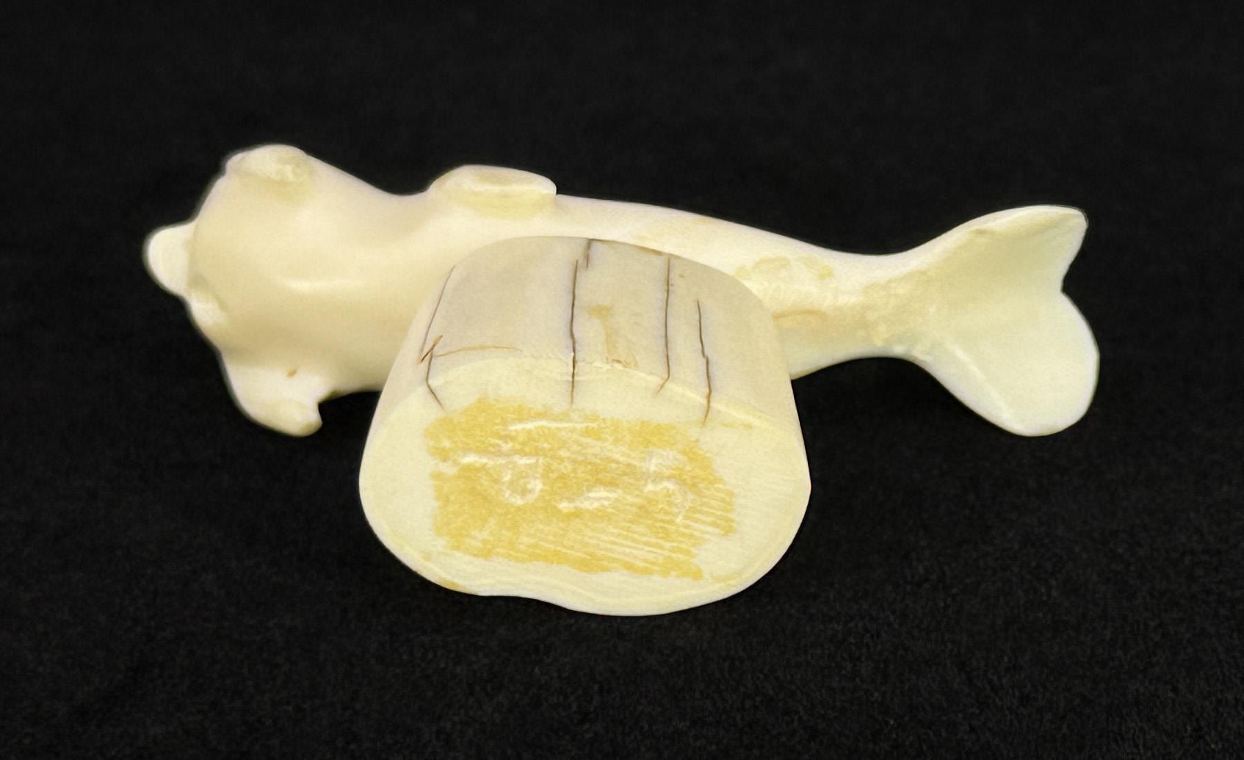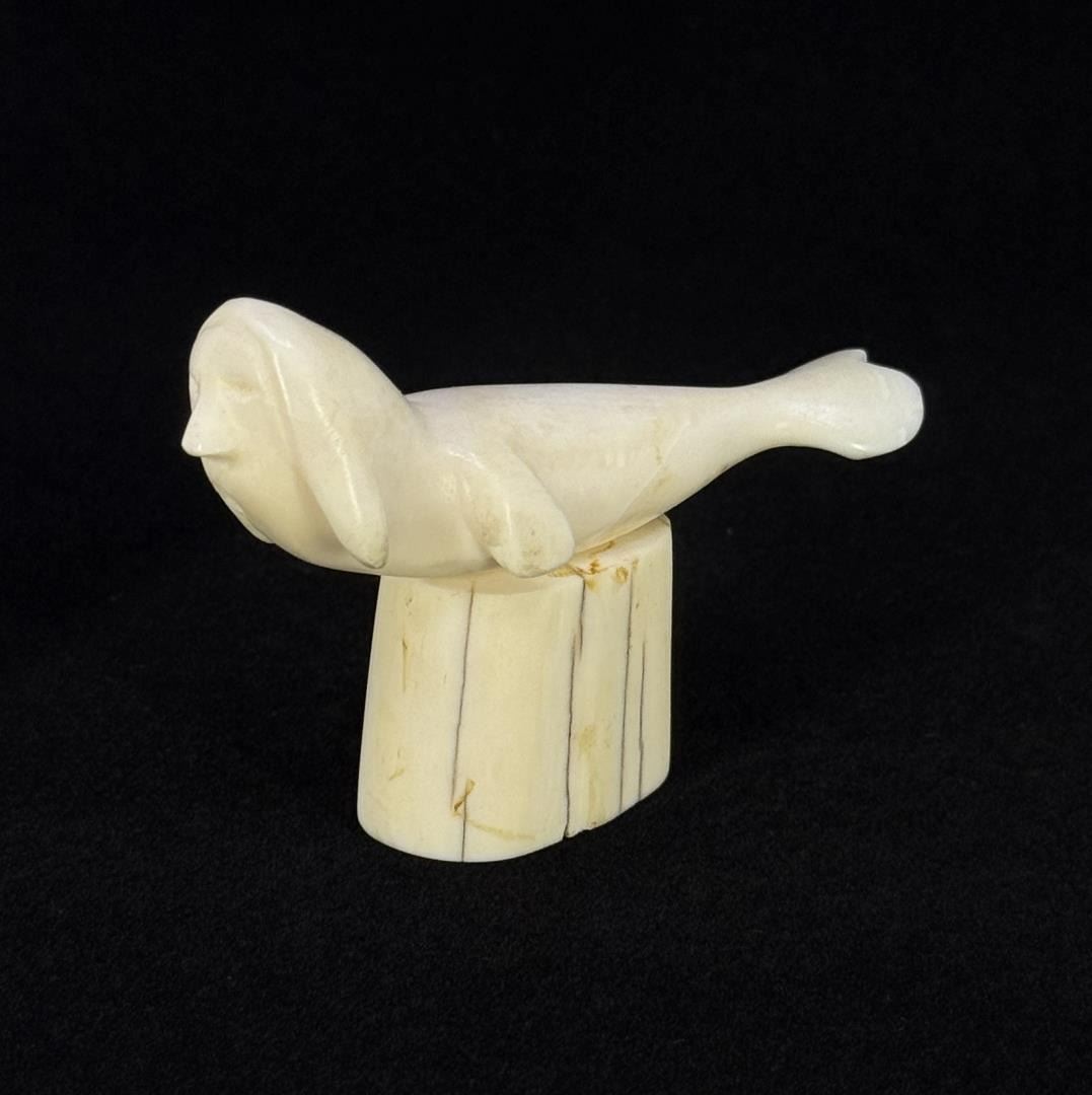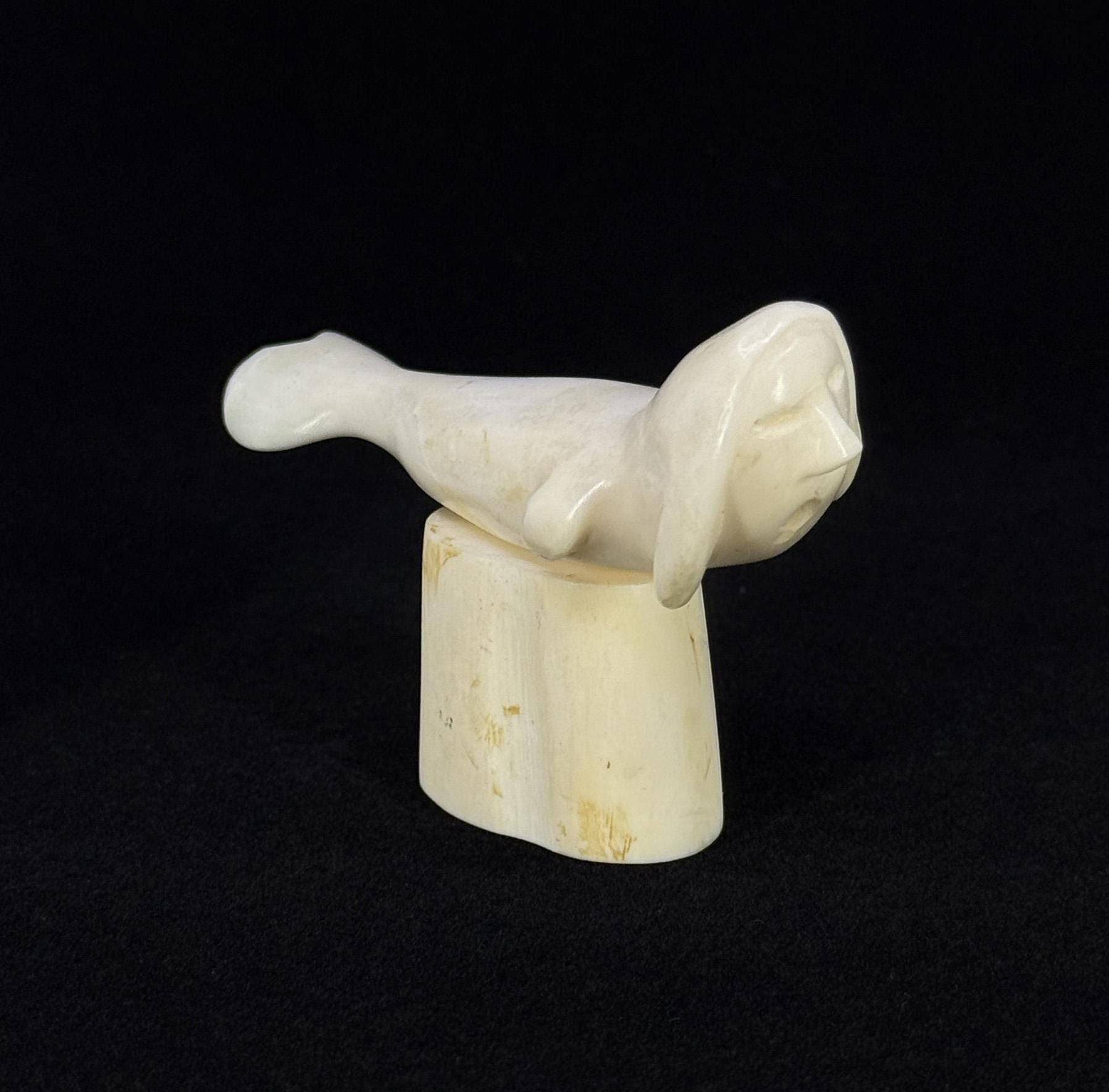 3 1/8" by 2 1/8" by 1". Carved Walrus Ivory. Native made prior to 1972. This item cannot be shipped to Oregon, California, Hawaii, New York, New Jersey, Internationally, or any other state that prohibits. Provenance: Heard Museum, Arizona; Private Collection, New York. Sedna is the goddess of the sea and marine animals in Inuit religion, also known as the Mother of the Sea or Mistress of the Sea. The story of Sedna, which is a creation myth, describes how she came to rule over Adlivun, the Inuit equivalent of the underworld. In sculptures, Sedna is often depicted with the head and upper body of a woman and the tail of a marine mammal, similar to a mermaid.