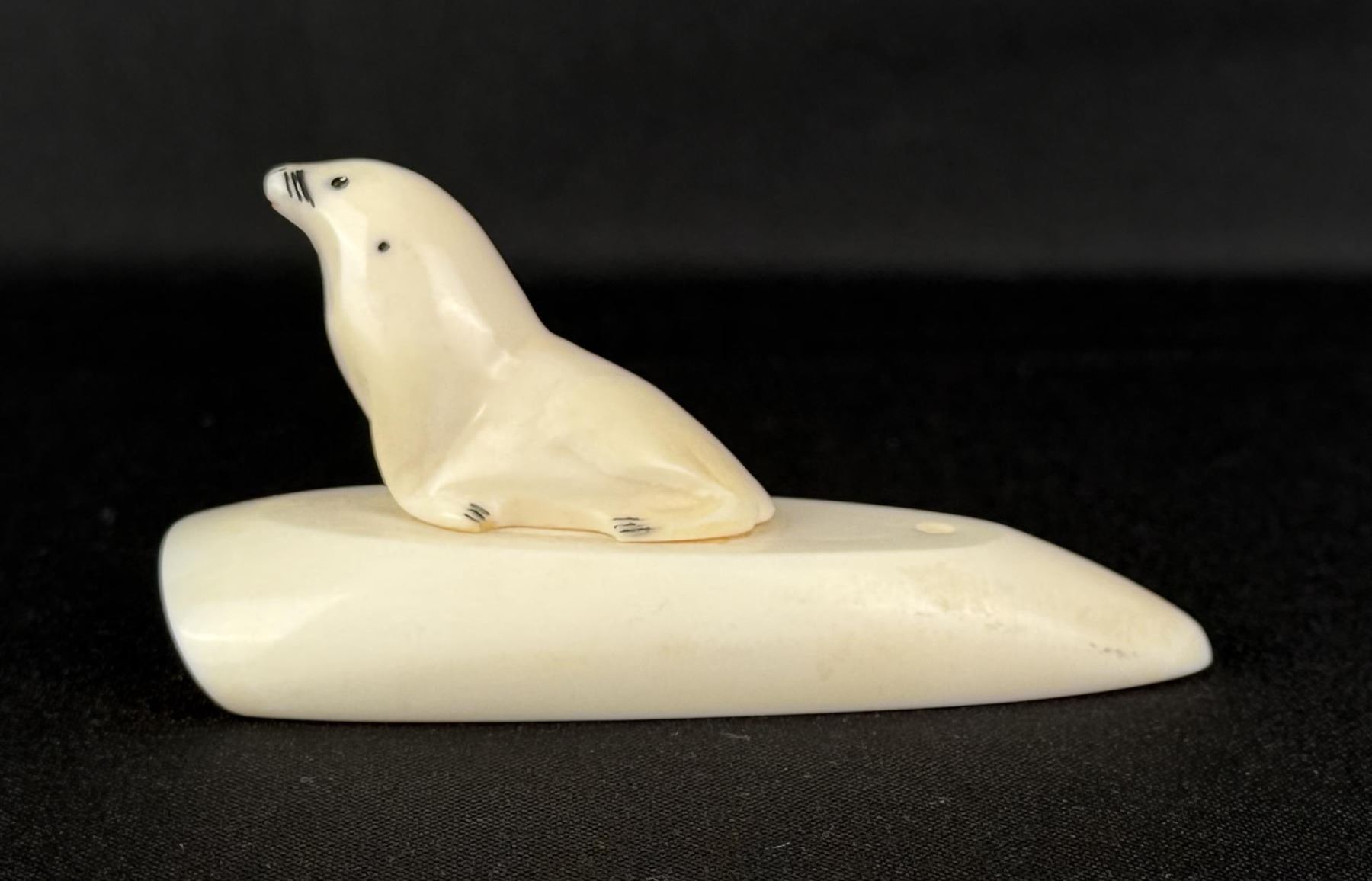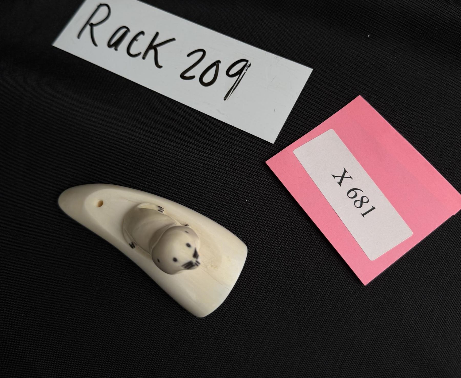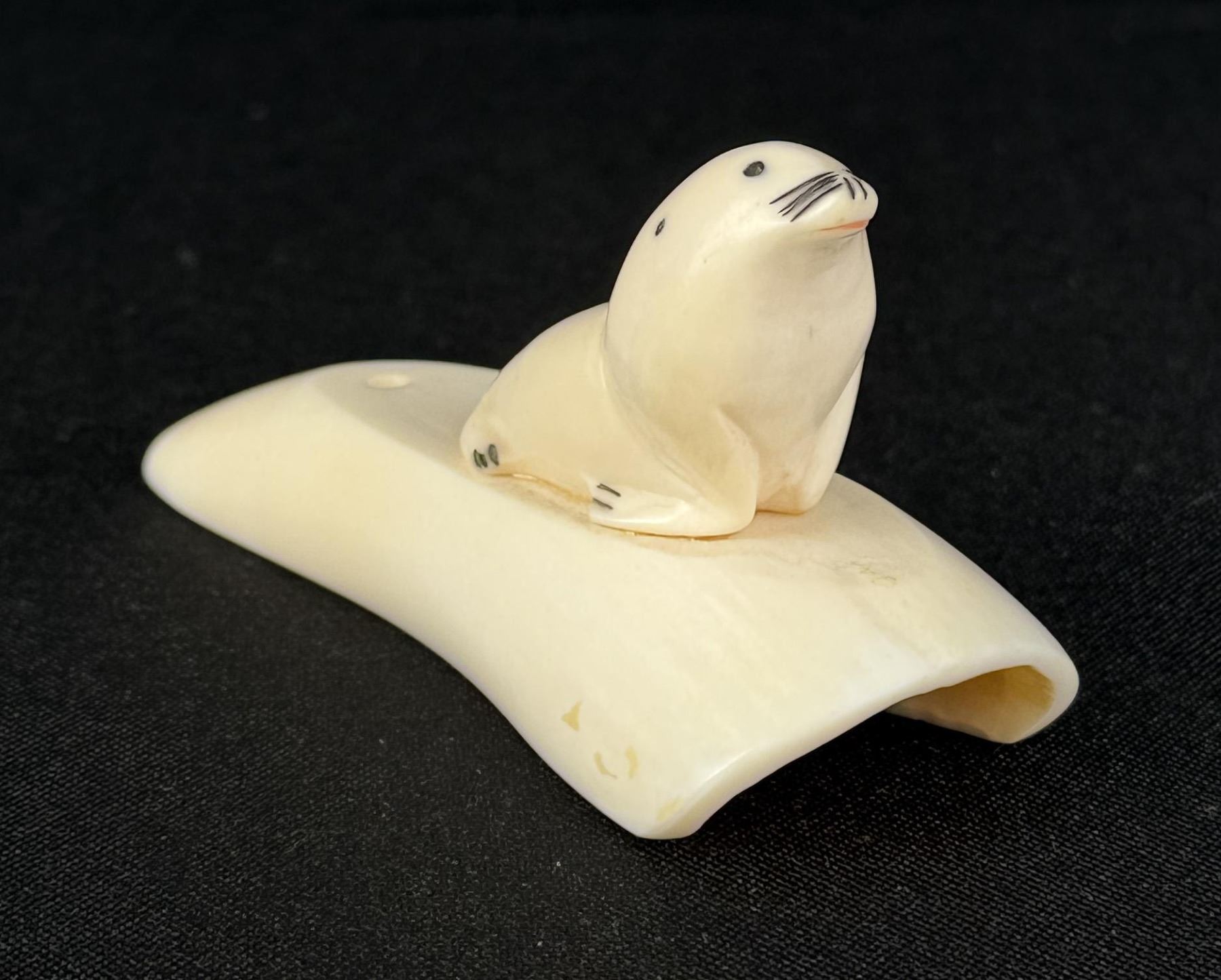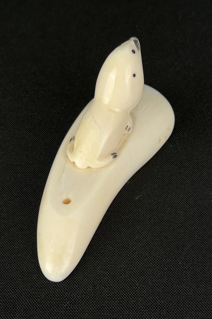 4 1/8" by 2" by 1 5/8". Carved Walrus Ivory. Native made prior to 1972. This item cannot be shipped to Oregon, California, Hawaii, New York, New Jersey, Internationally, or any other state that prohibits.