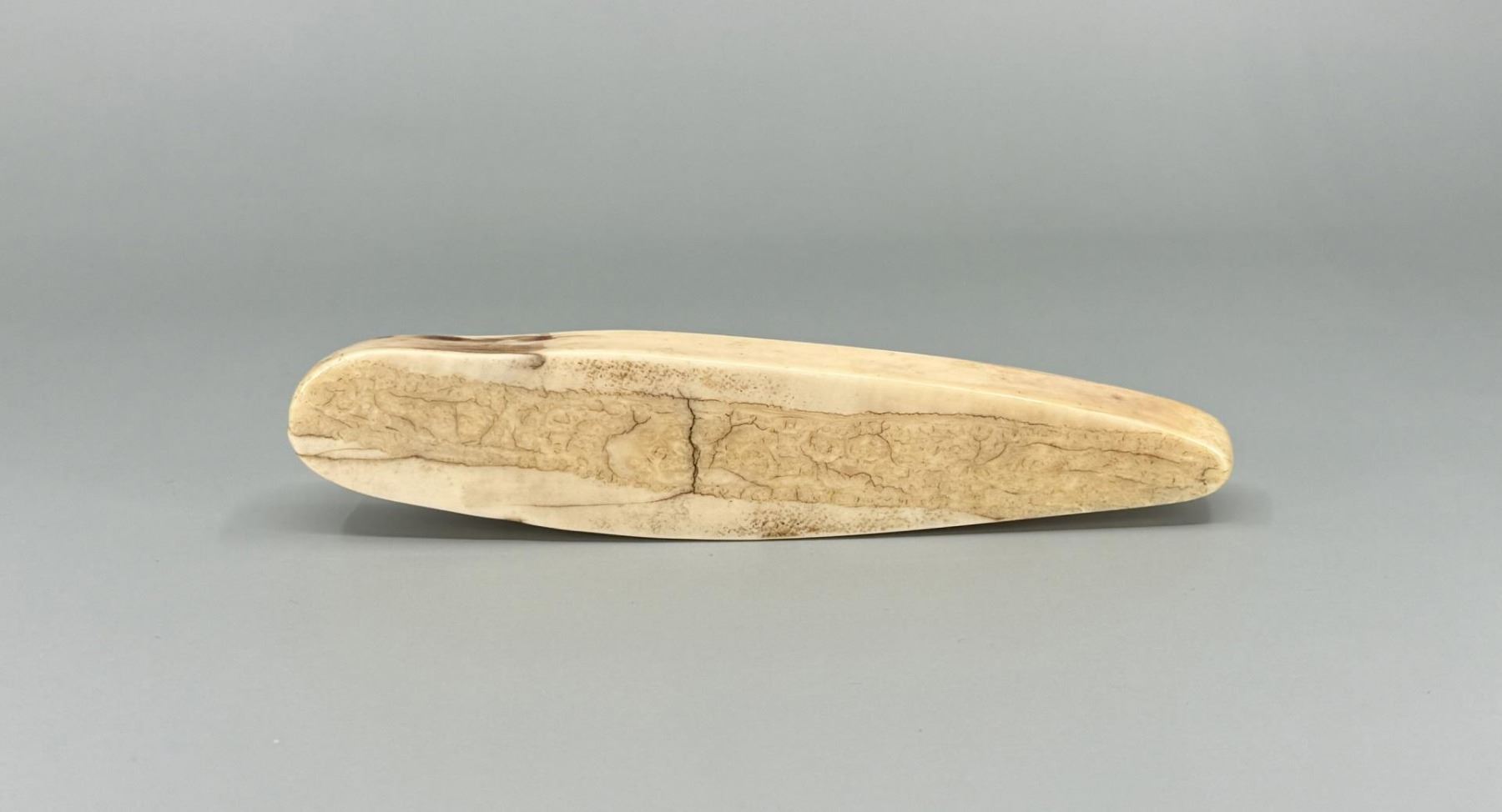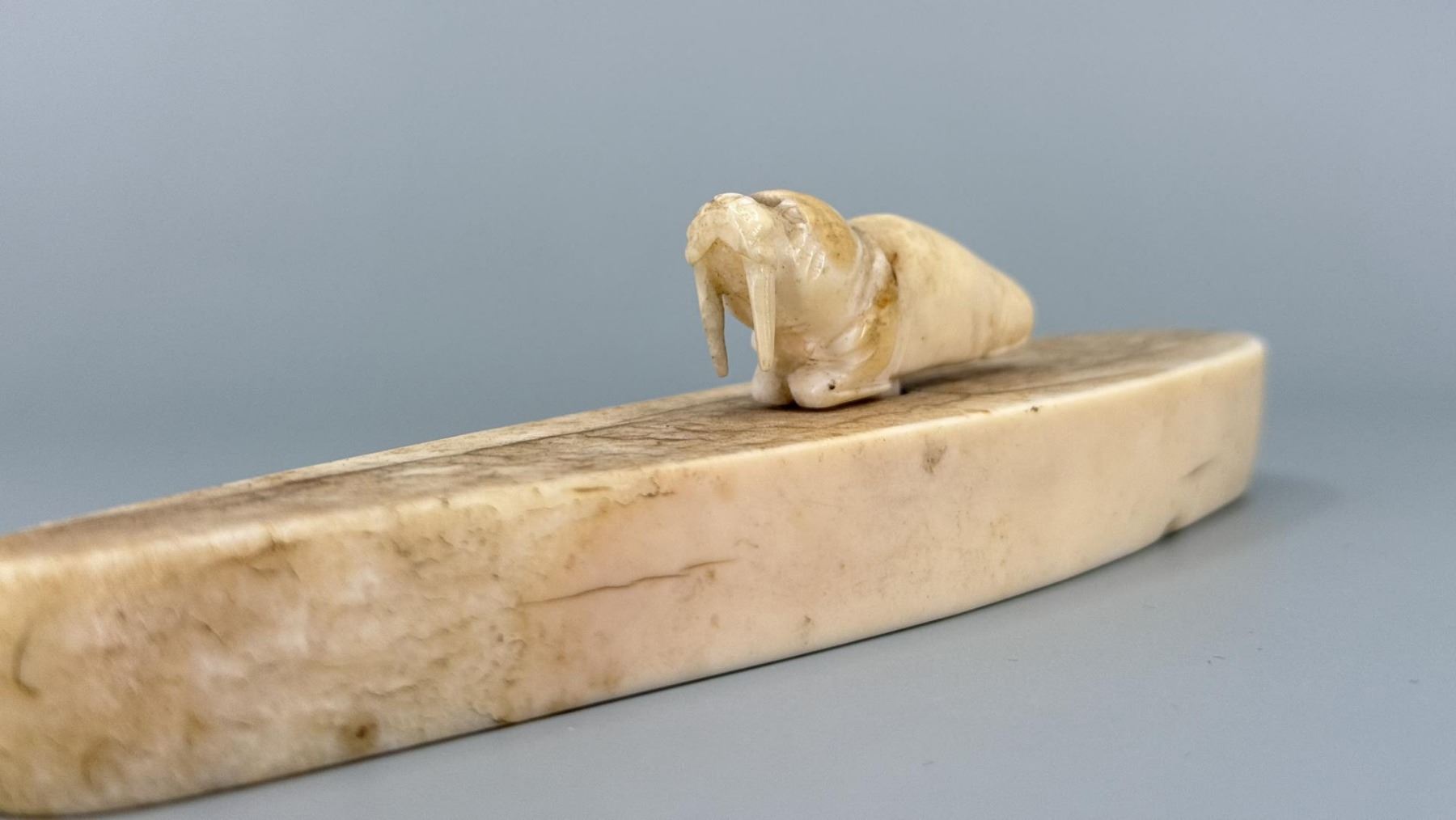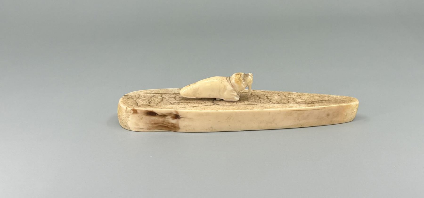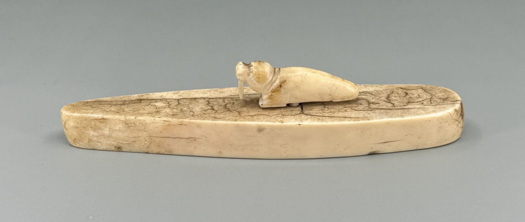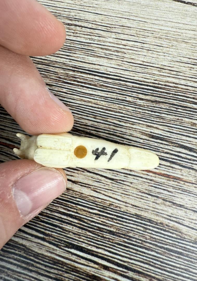 6" by 1 1/4" by 1 1/4". Carved walrus material. Native made prior to 1972. This item cannot be shipped to Oregon, California, Hawaii, New York, New Jersey, Internationally, or any other state that prohibits.