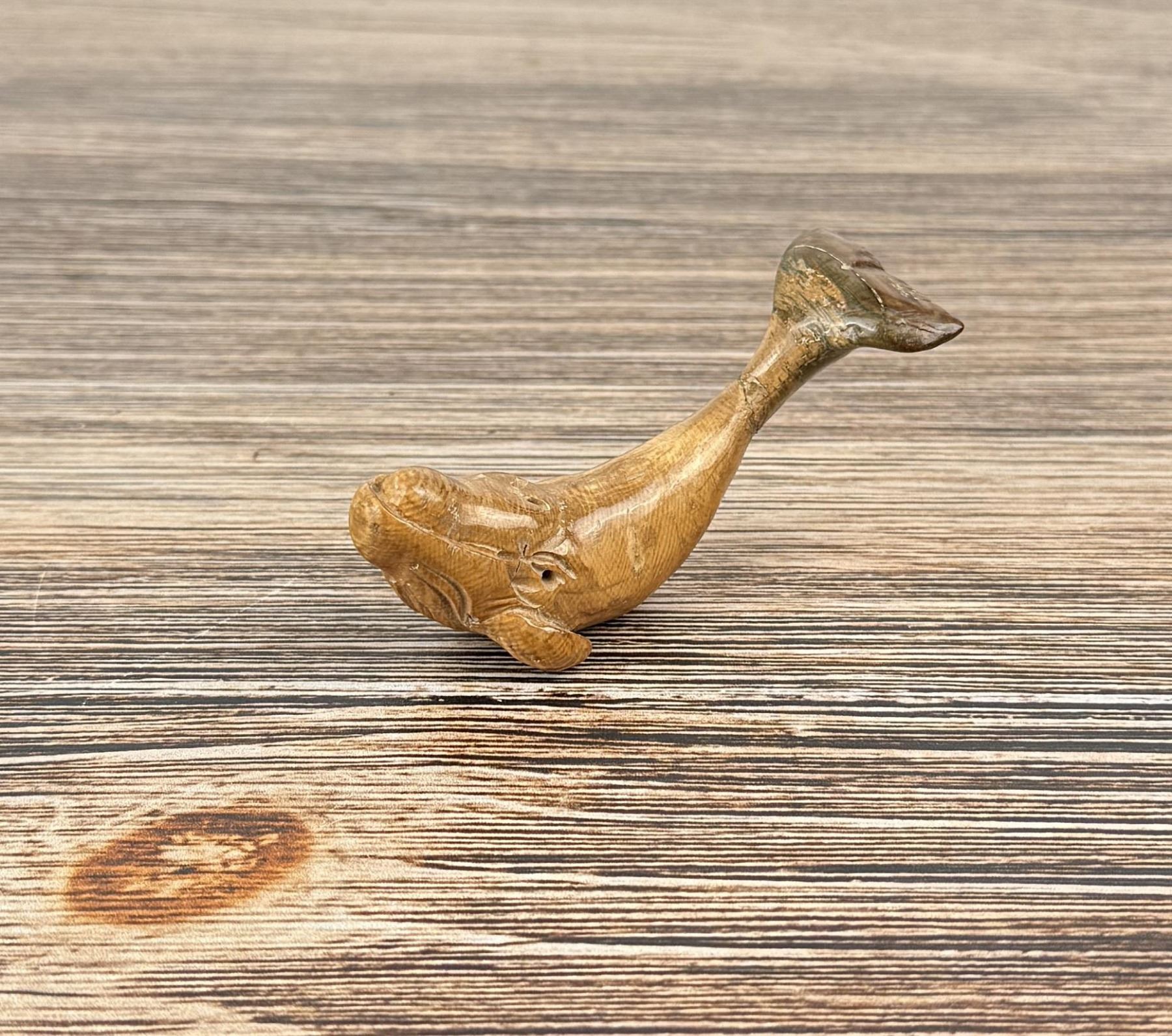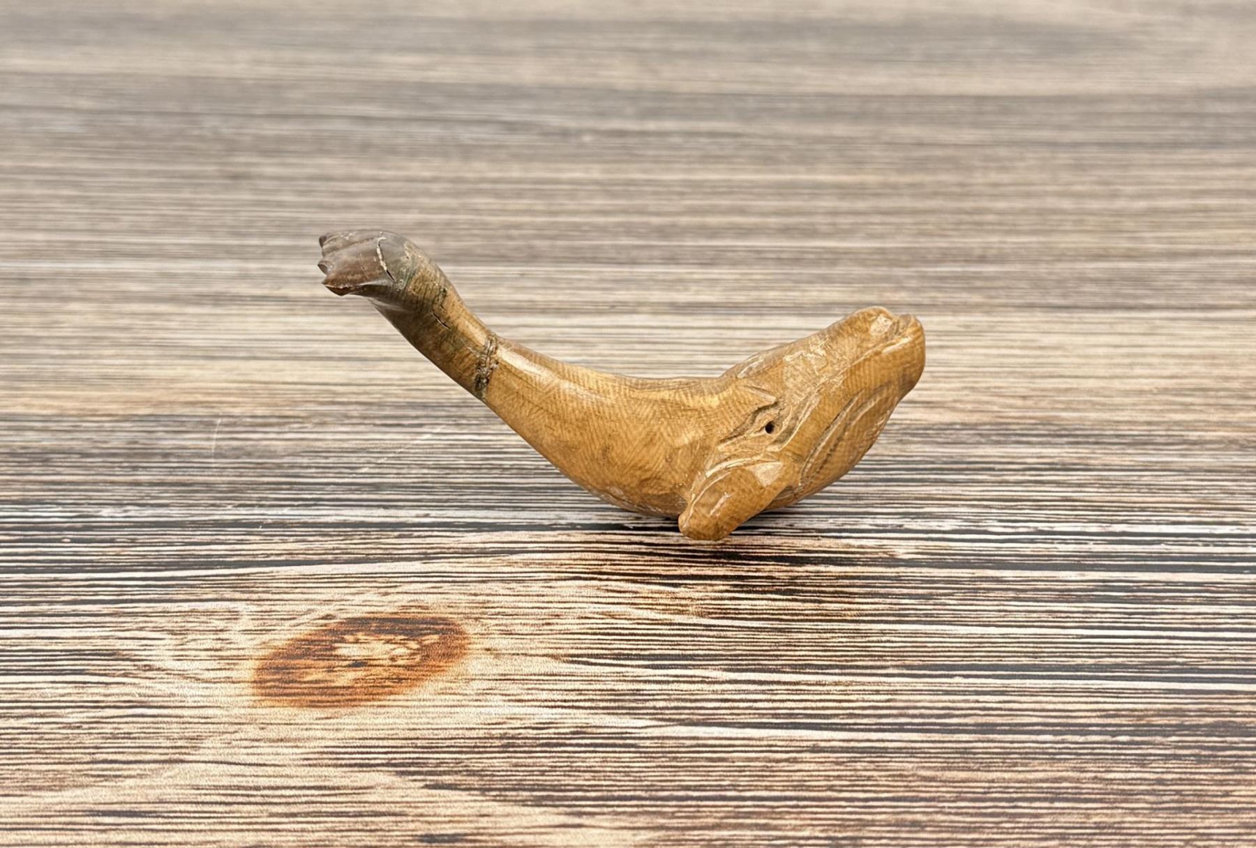3 1/8" by 1 1/2" by 1 1/2". Tail has been broken and repaired. Carved walrus material. Native made prior to 1972. This item cannot be shipped to Oregon, California, Hawaii, New York, New Jersey, Internationally, or any other state that prohibits.