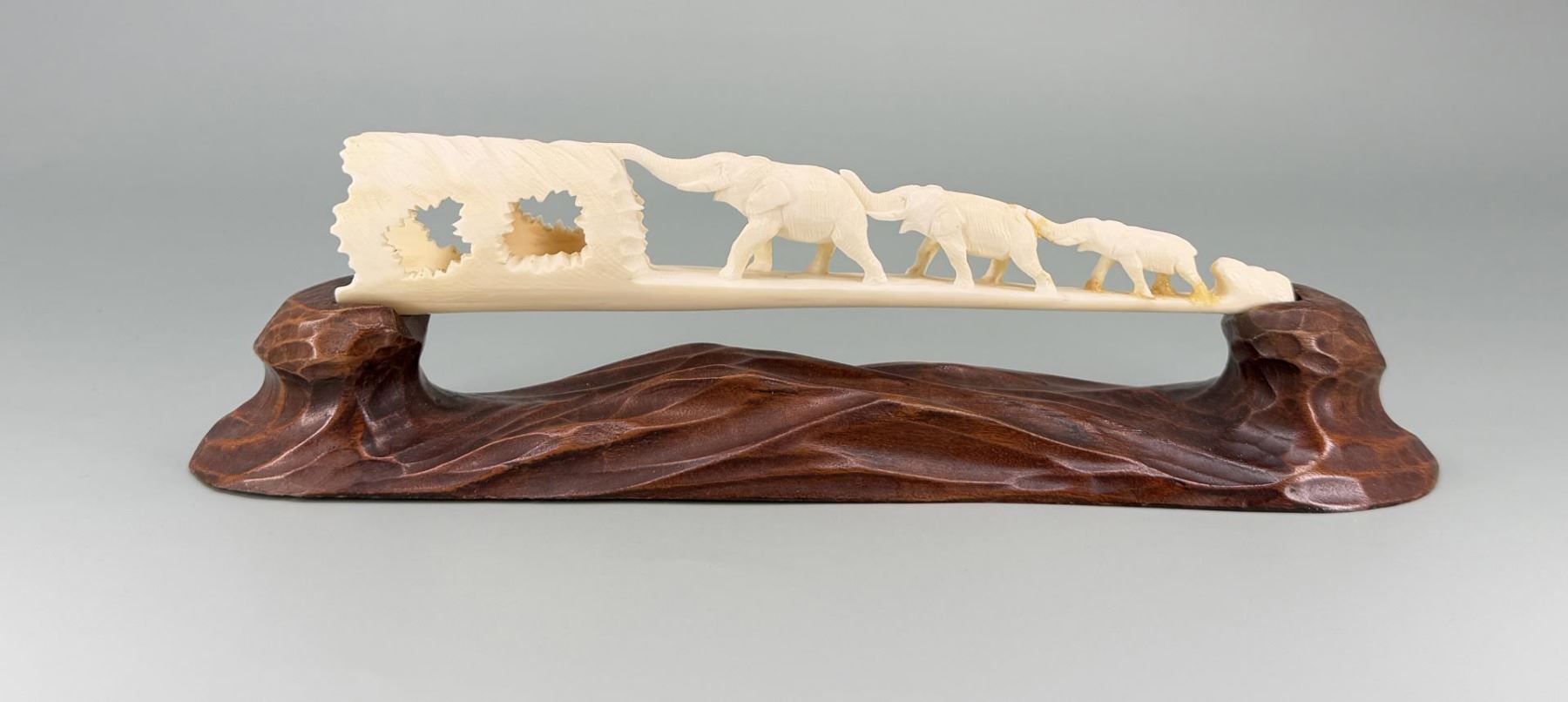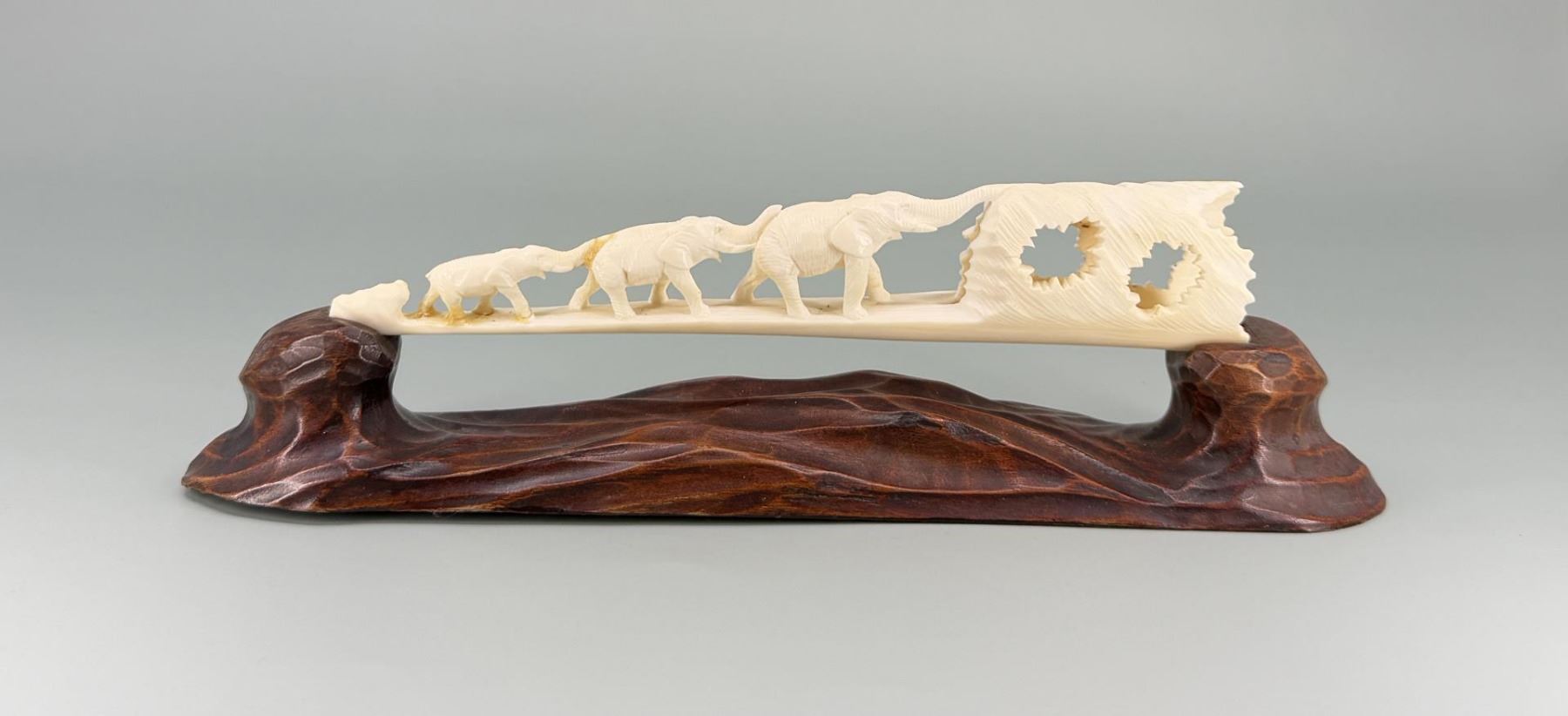 9 1/8" by 2 1/2" by 1 3/4" on stand. Carved walrus material. Native made prior to 1972. This item cannot be shipped to Oregon, California, Hawaii, New York, New Jersey, Internationally, or any other state that prohibits.