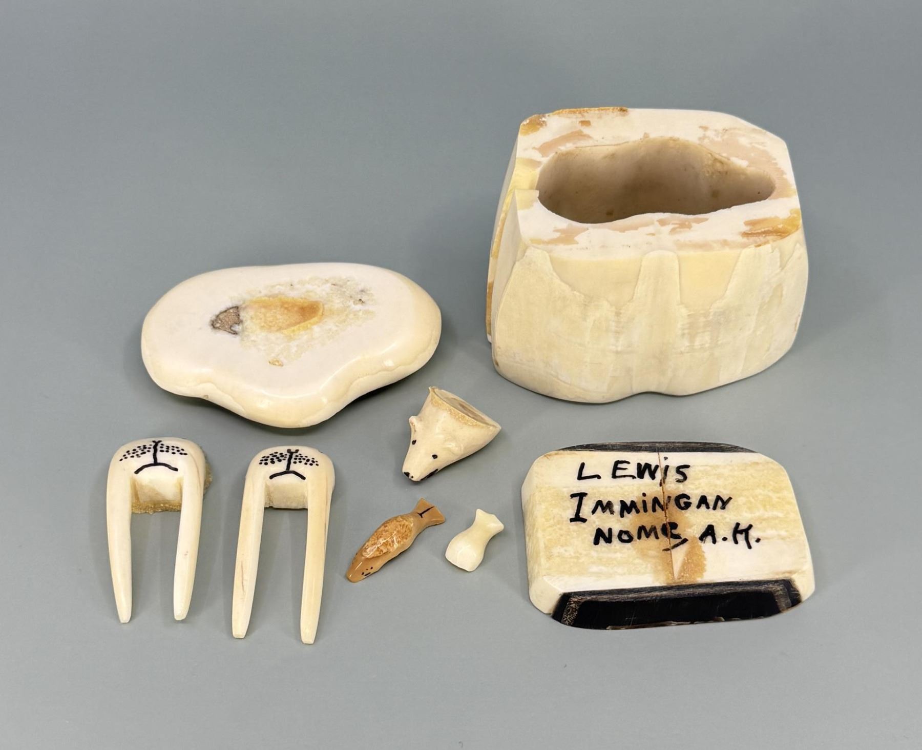 Largest is 2 7/8" by 2" by 2". Carved walrus material. Native made prior to 1972. This item cannot be shipped to Oregon, California, Hawaii, New York, New Jersey, Internationally, or any other state that prohibits.
