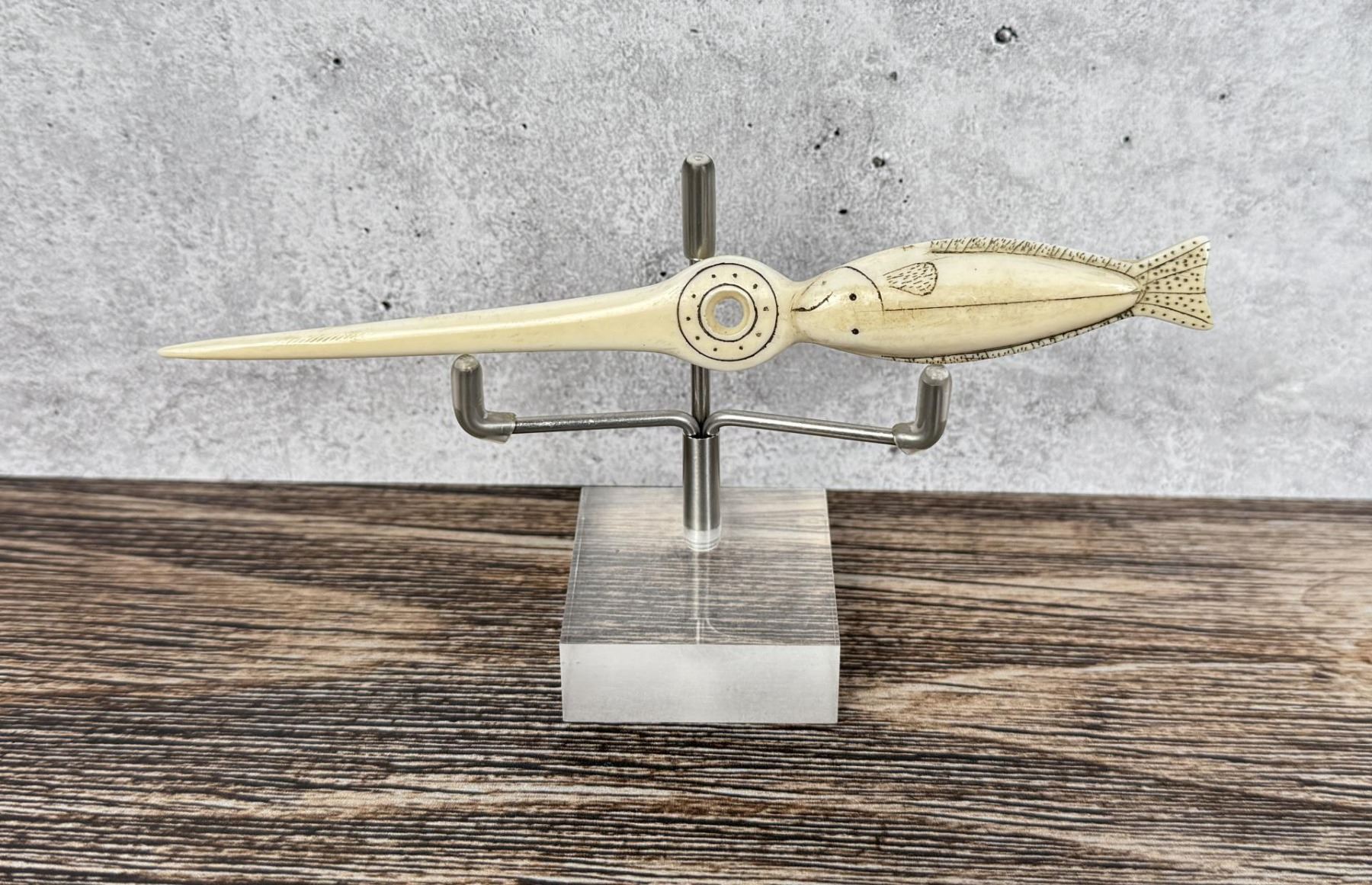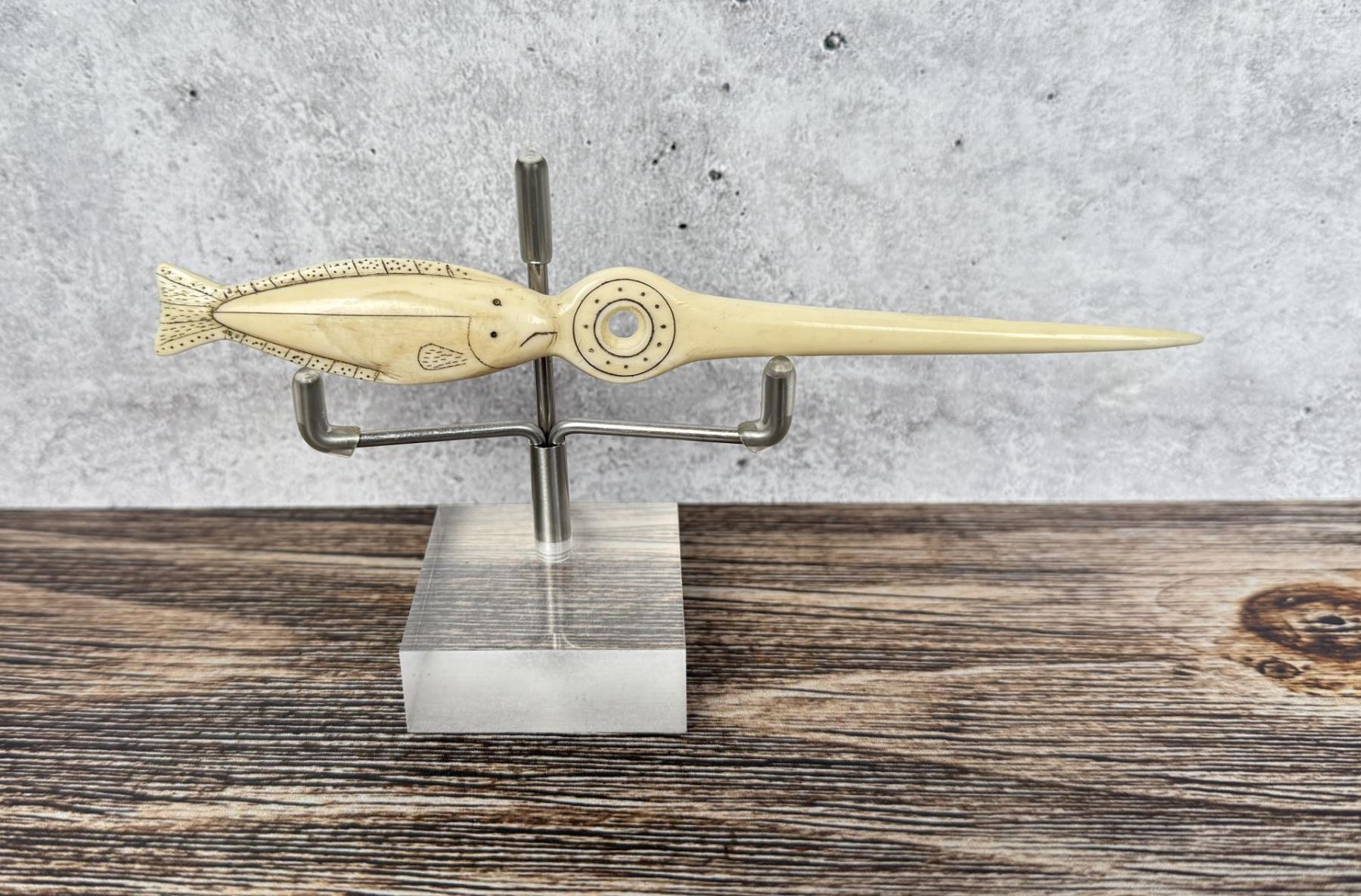 6" long. Carved walrus material. Native made prior to 1972. This item cannot be shipped to Oregon, California, Hawaii, New York, New Jersey, Internationally, or any other state that prohibits.