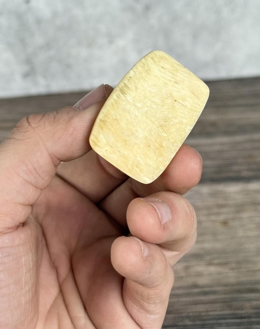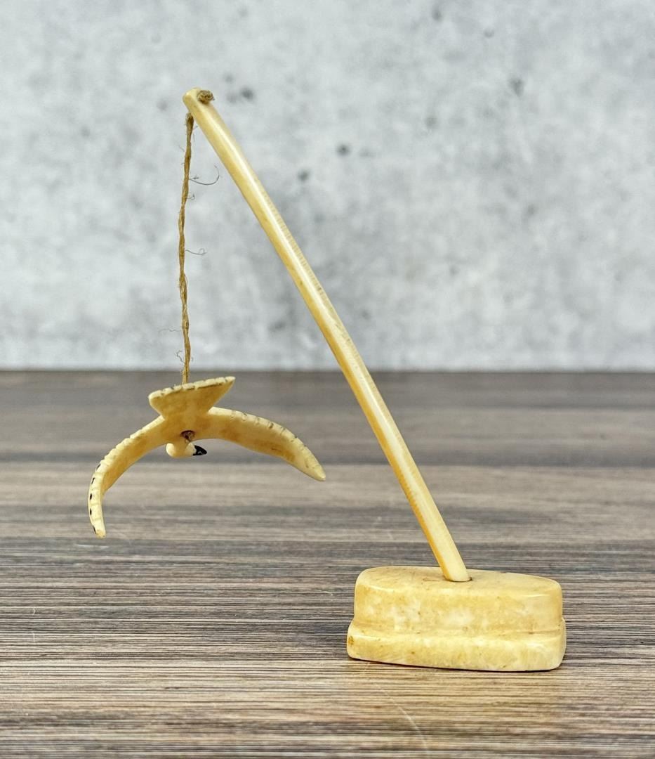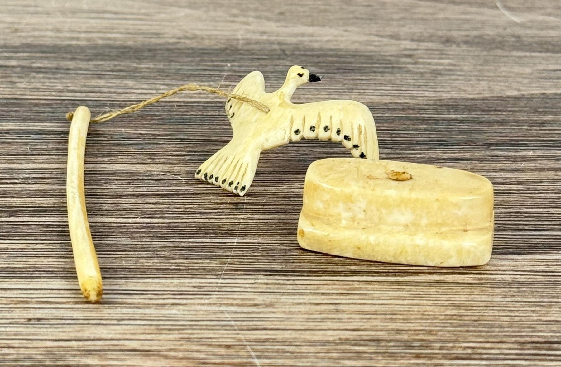 4" by 3 3/4" by 1 3/4". Carved Walrus Ivory. Native made prior to 1972. This item cannot be shipped to Oregon, California, Hawaii, New York, New Jersey, Internationally, or any other state that prohibits.