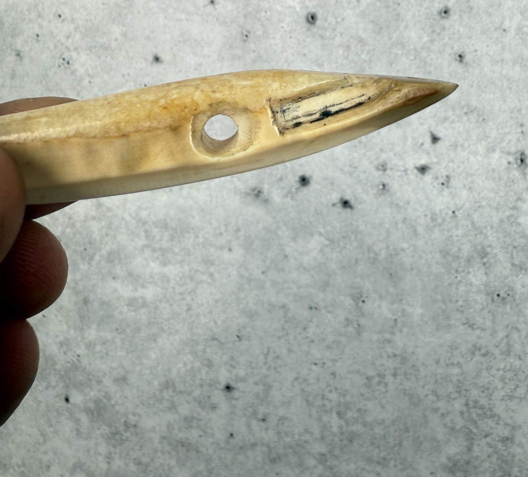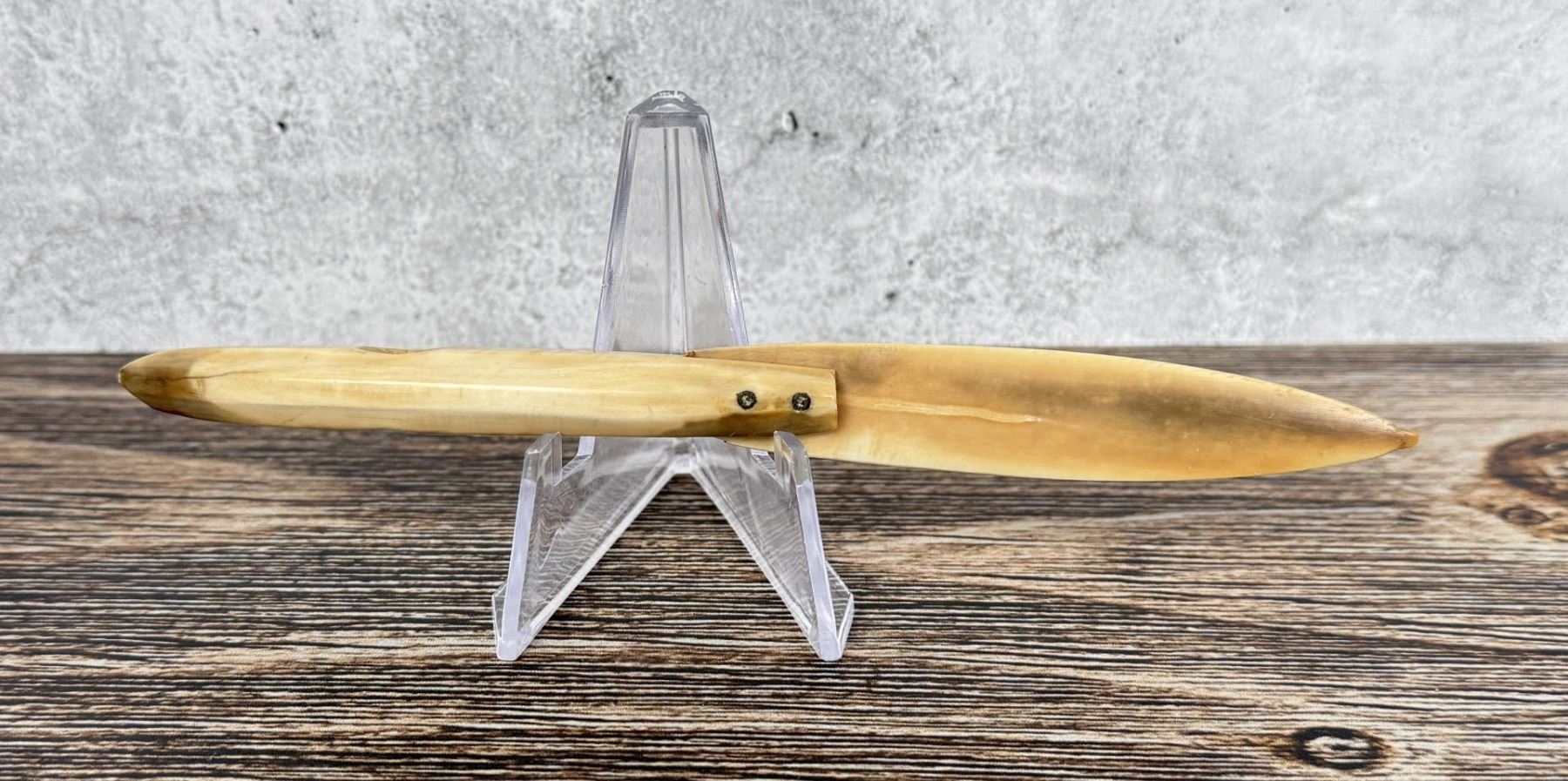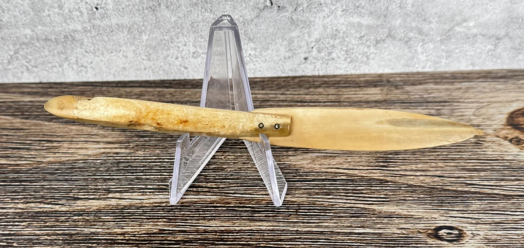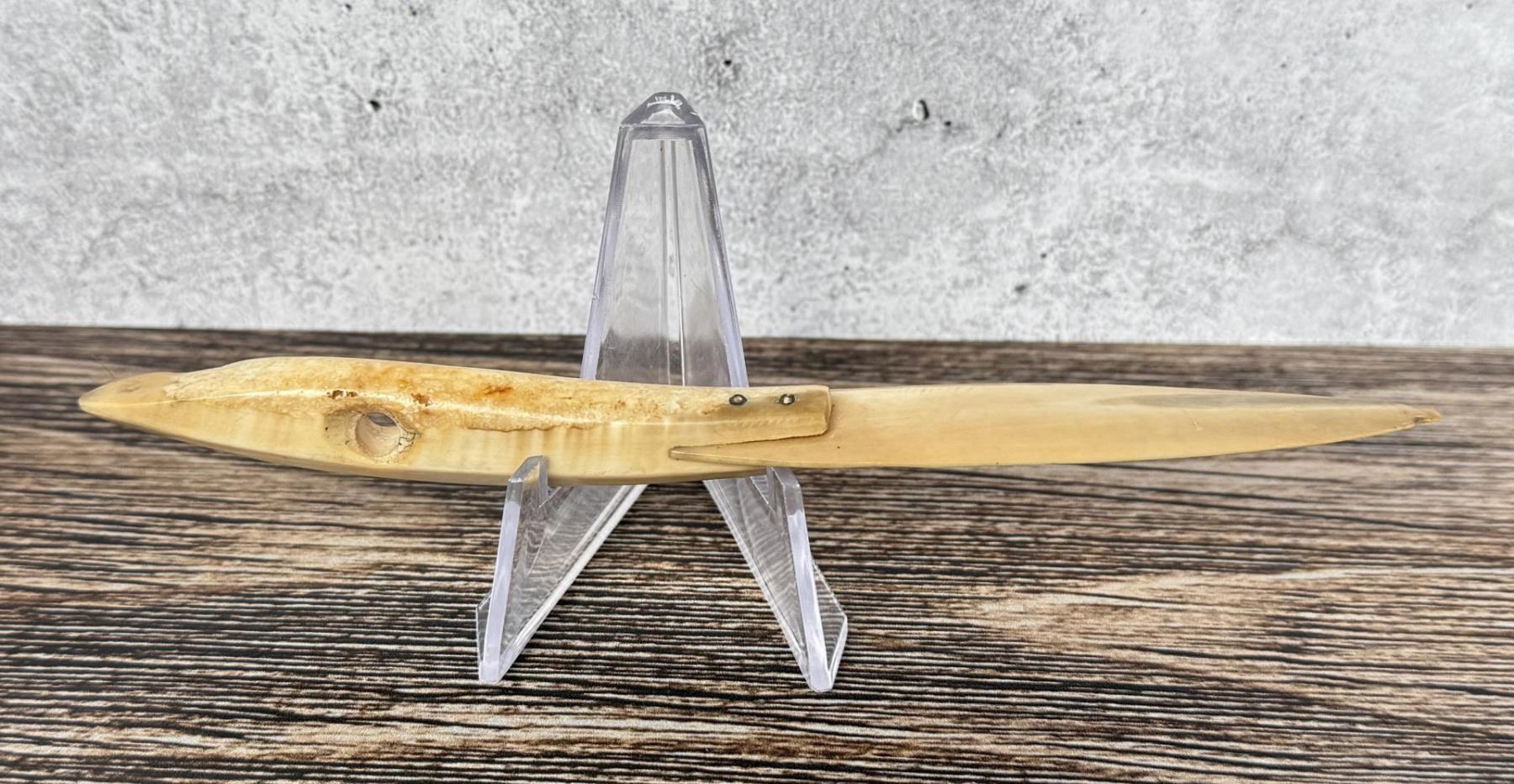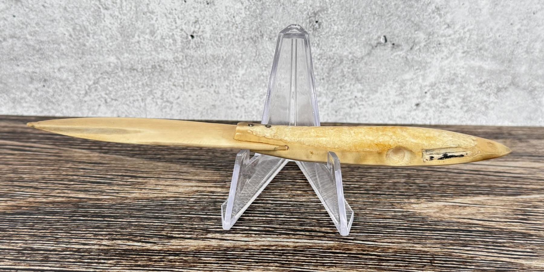5 3/4" long. Carved walrus material. Native made prior to 1972. This item cannot be shipped to Oregon, California, Hawaii, New York, New Jersey, Internationally, or any other state that prohibits.