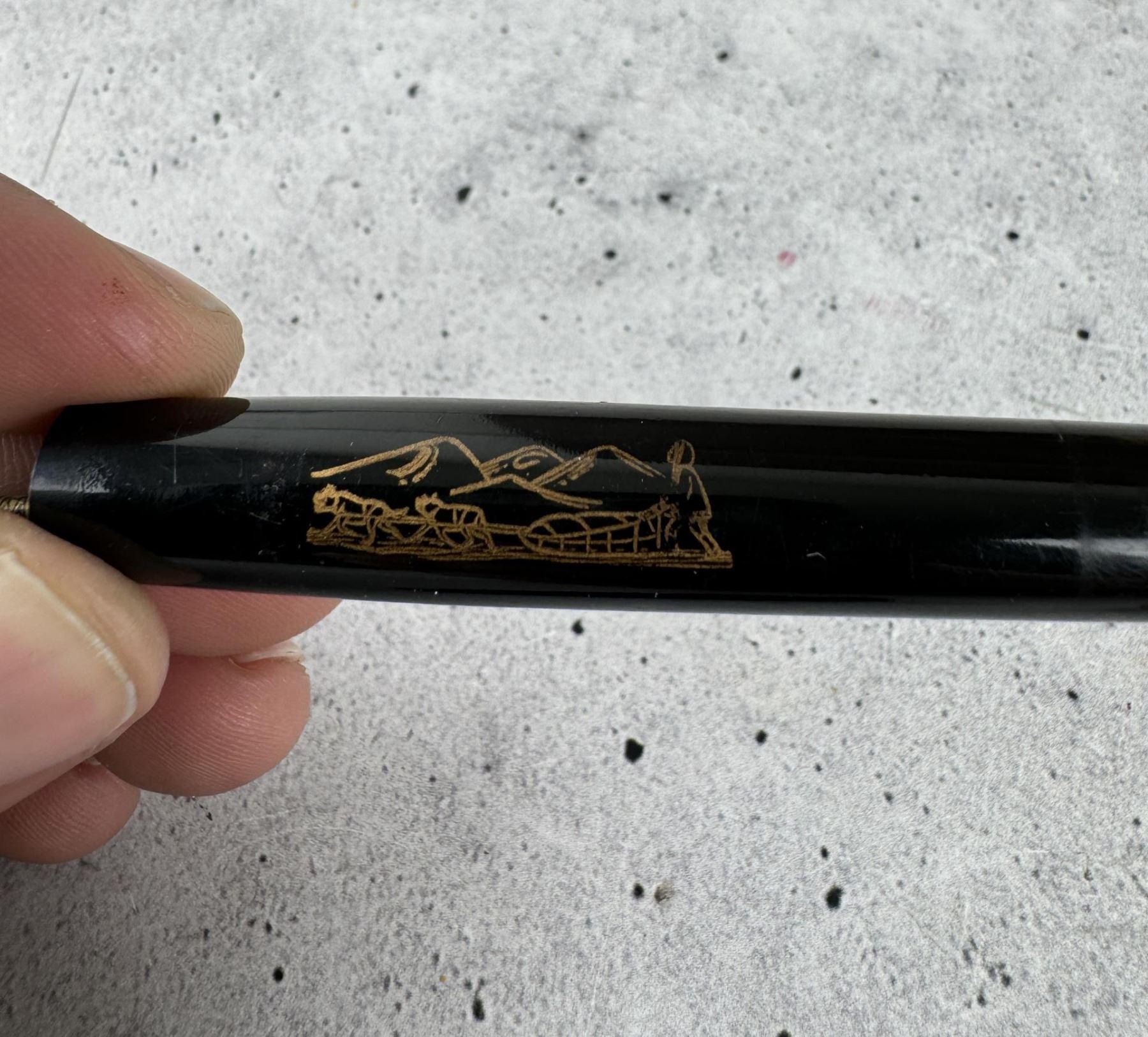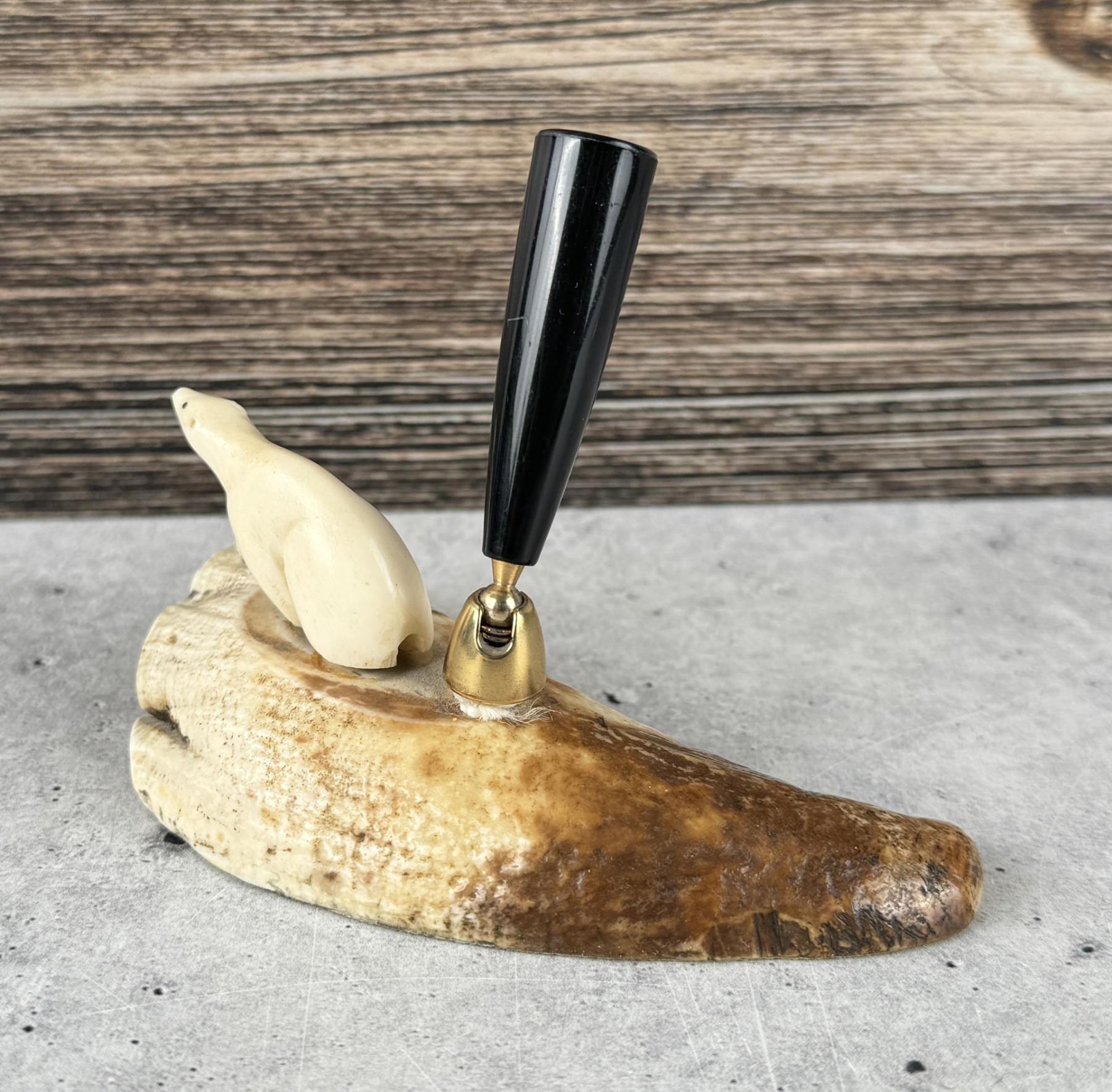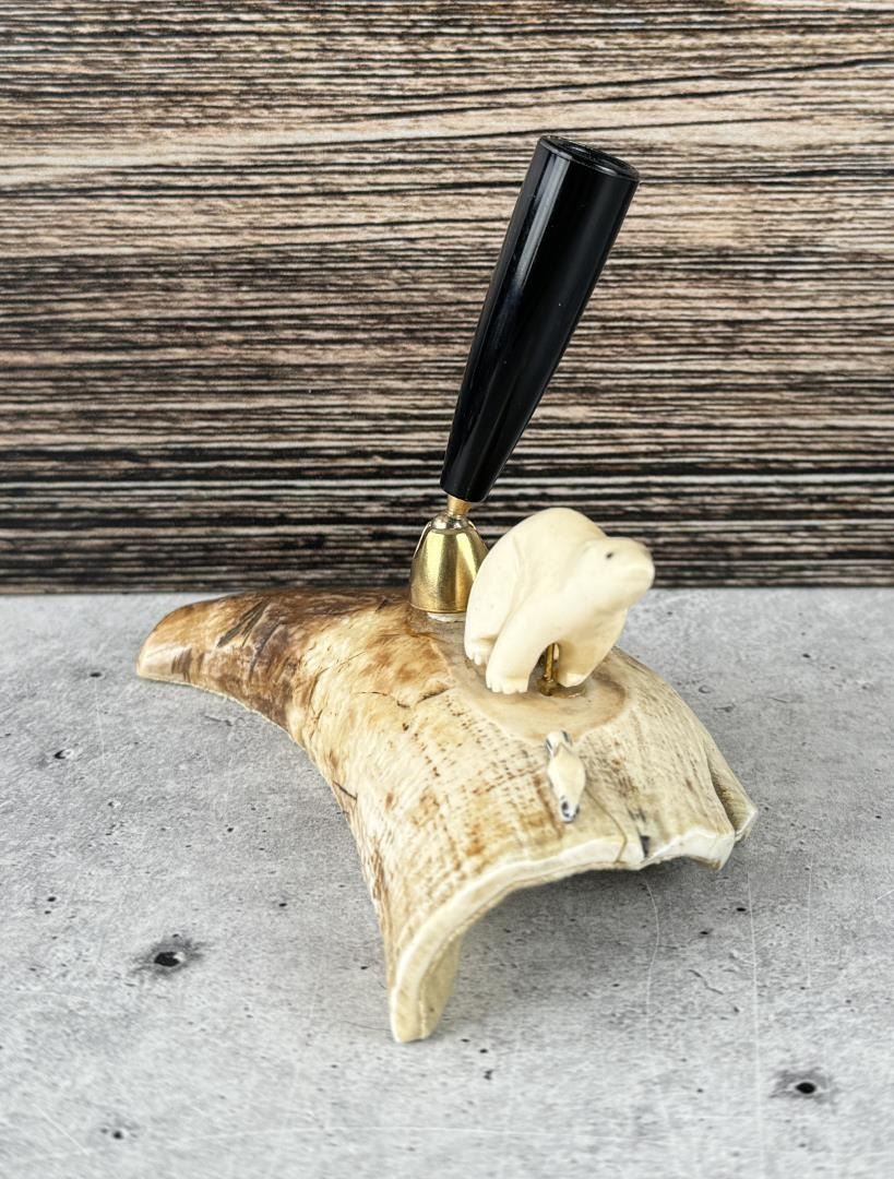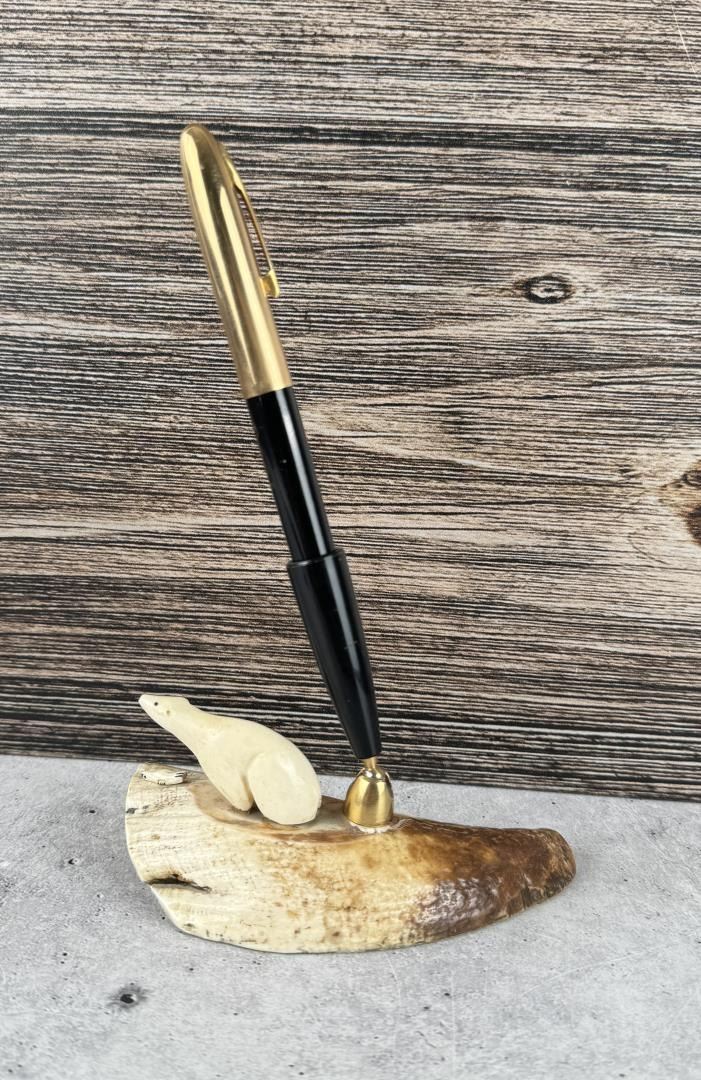 Carved Walrus Material. Fountain Pen is an Eversharp and has a sled dog scene on it. 4 5/8" by 2 3/8" by 1 7/8"