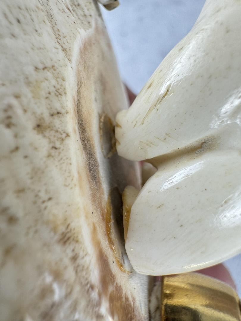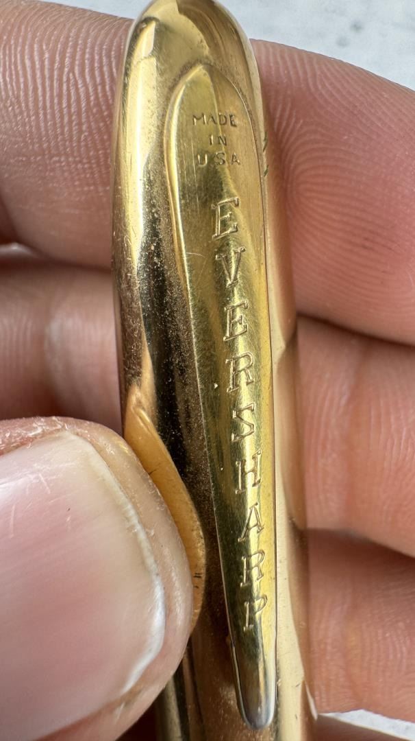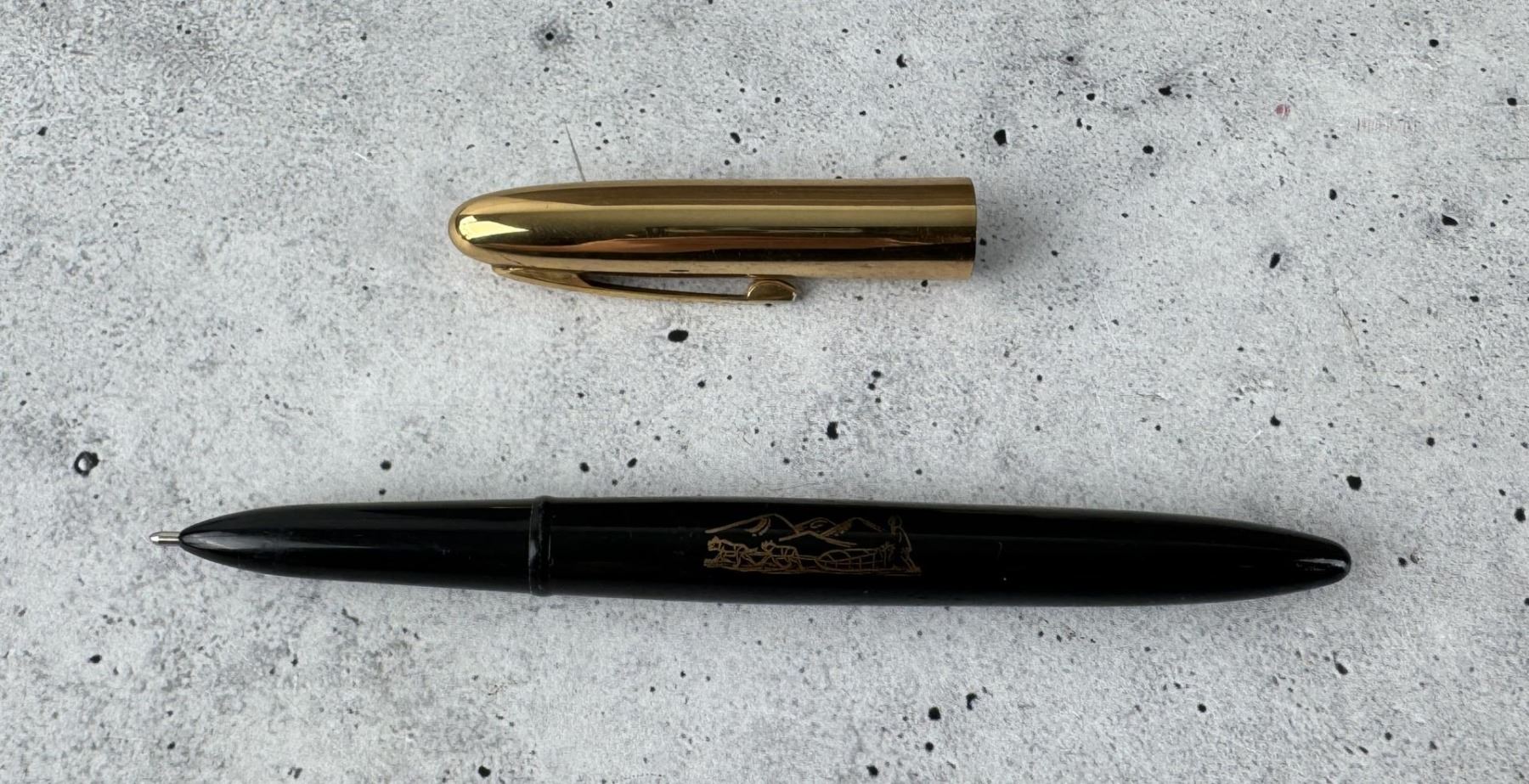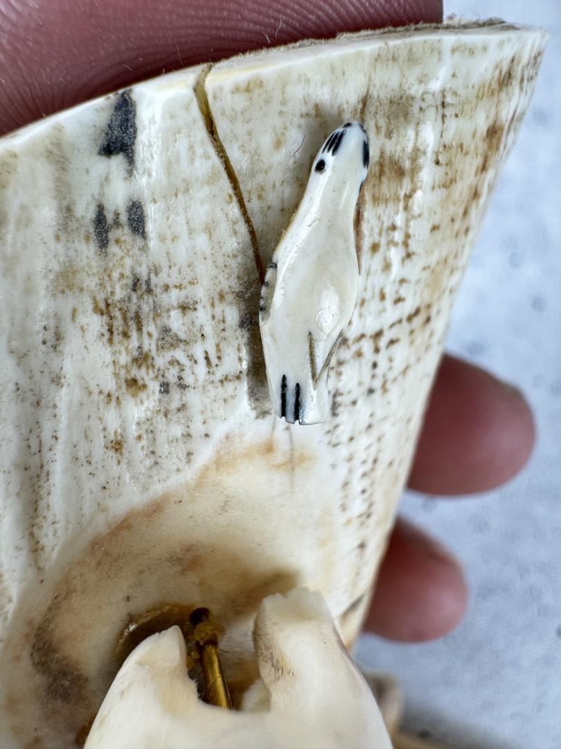 Carved Walrus Material. Fountain Pen is an Eversharp and has a sled dog scene on it. 4 5/8" by 2 3/8" by 1 7/8"