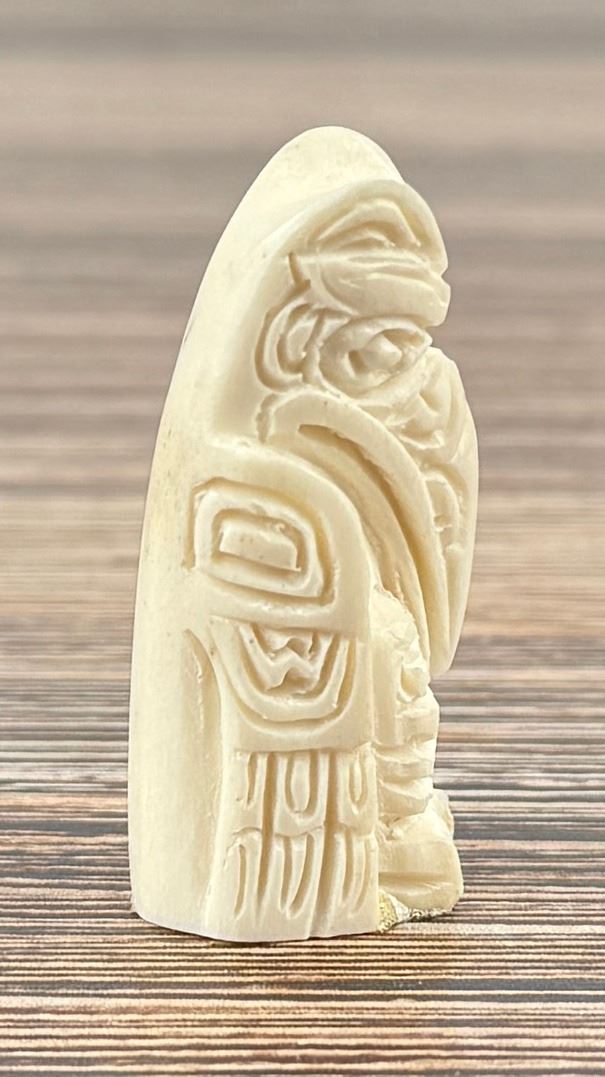 1 5/8" tall. Carved walrus material. Native made prior to 1972. This item cannot be shipped to Oregon, California, Hawaii, New York, New Jersey, Internationally, or any other state that prohibits.