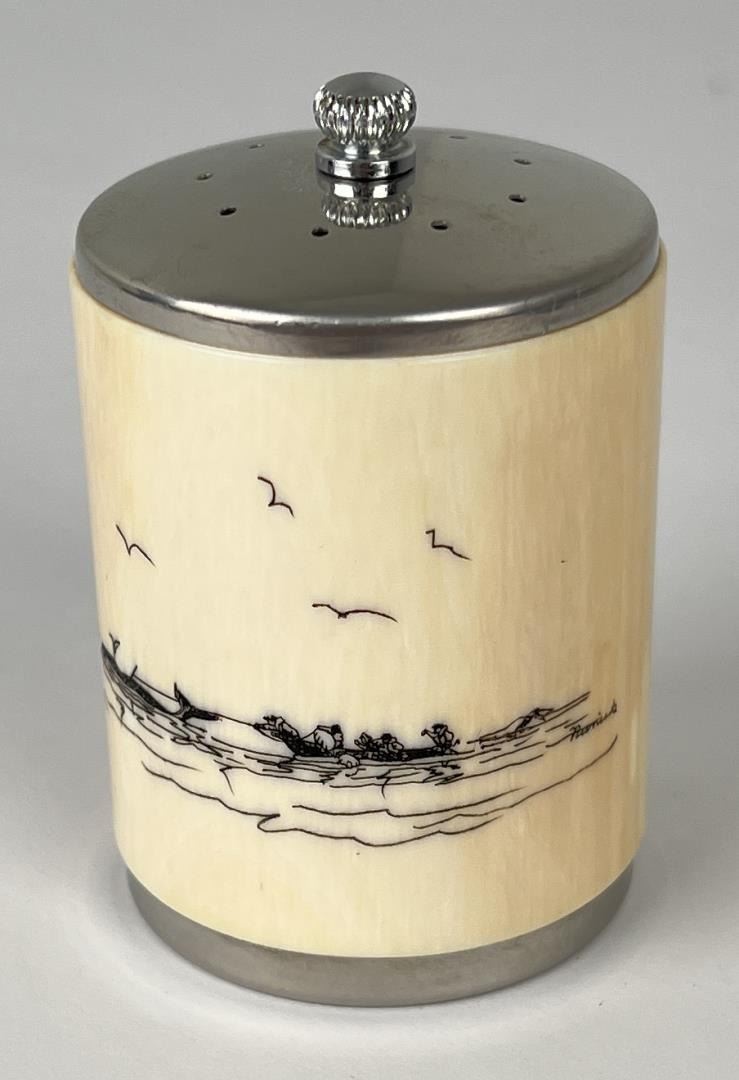 Very nice scrimshawed salt shaker. 3 1/4" tall.