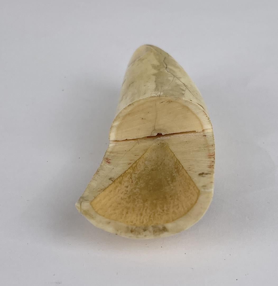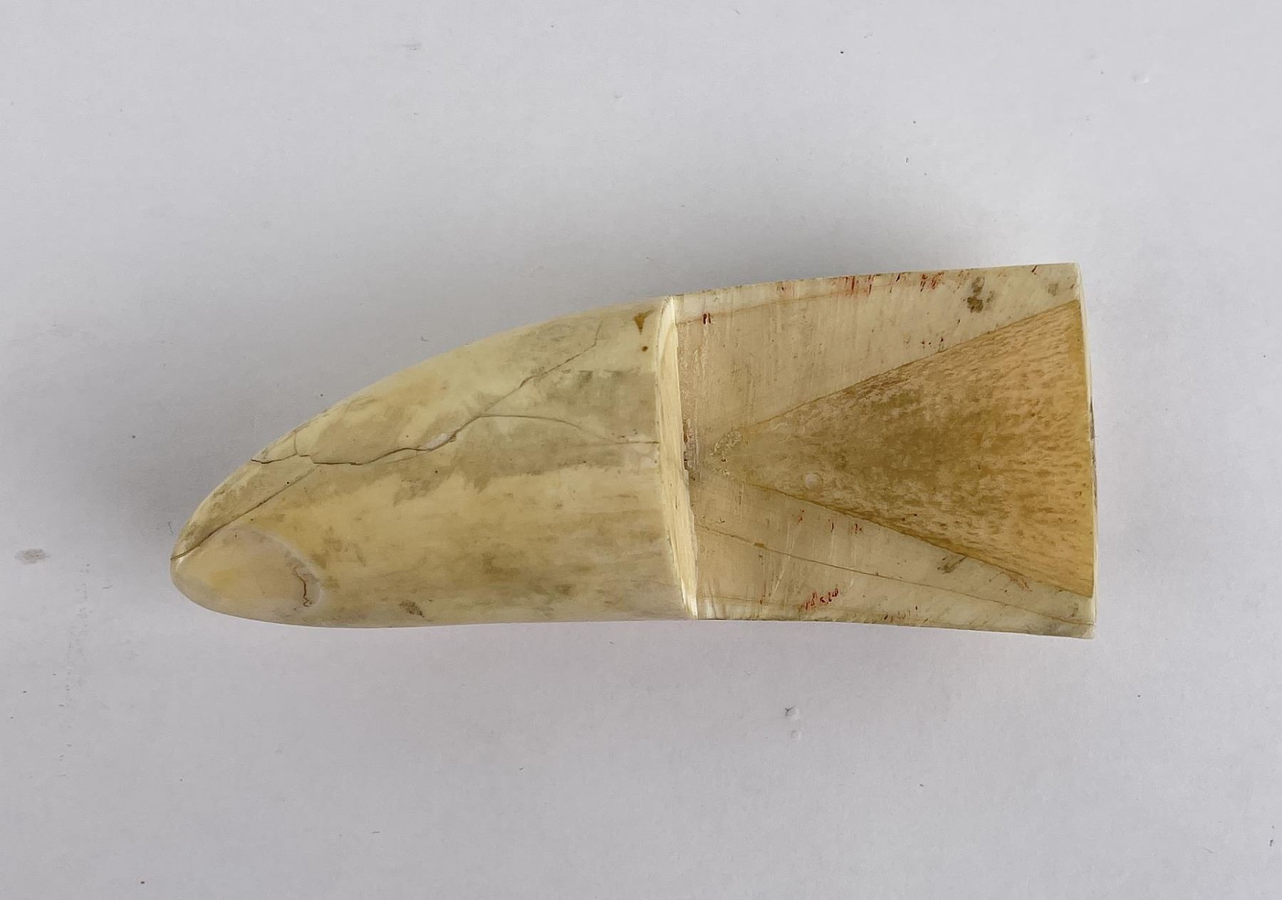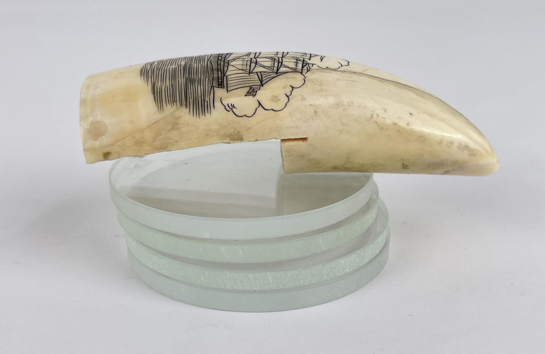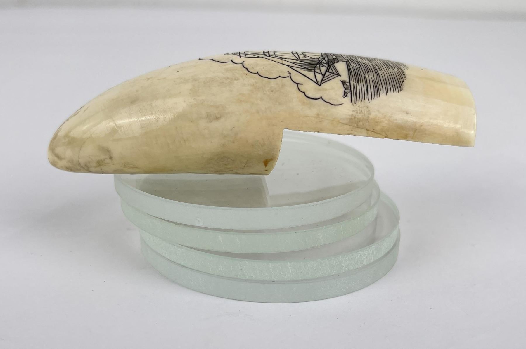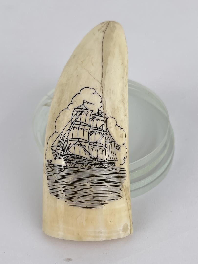 Nice piece. Scrimshawed with a cutter ship as shown. 4" long.