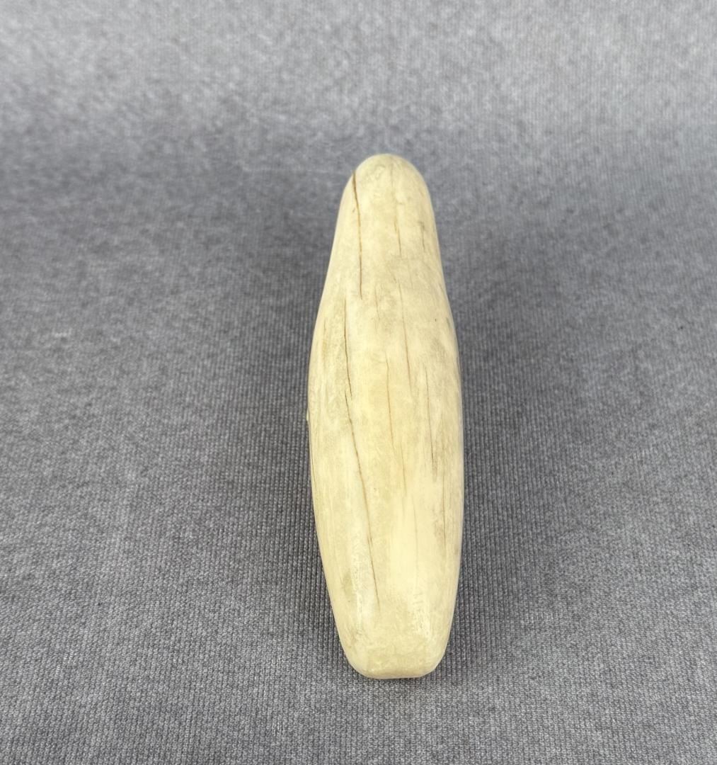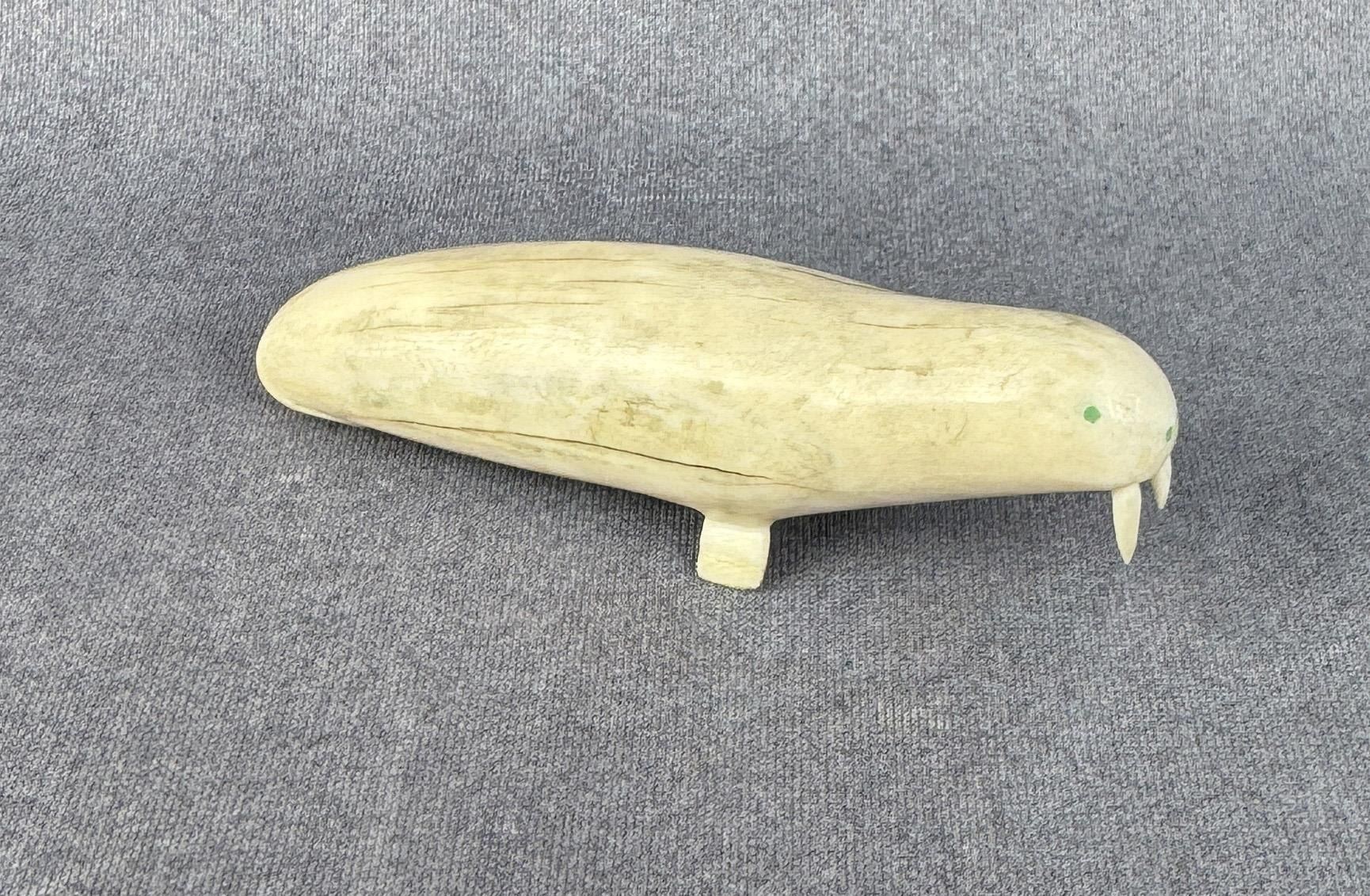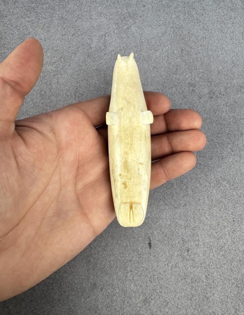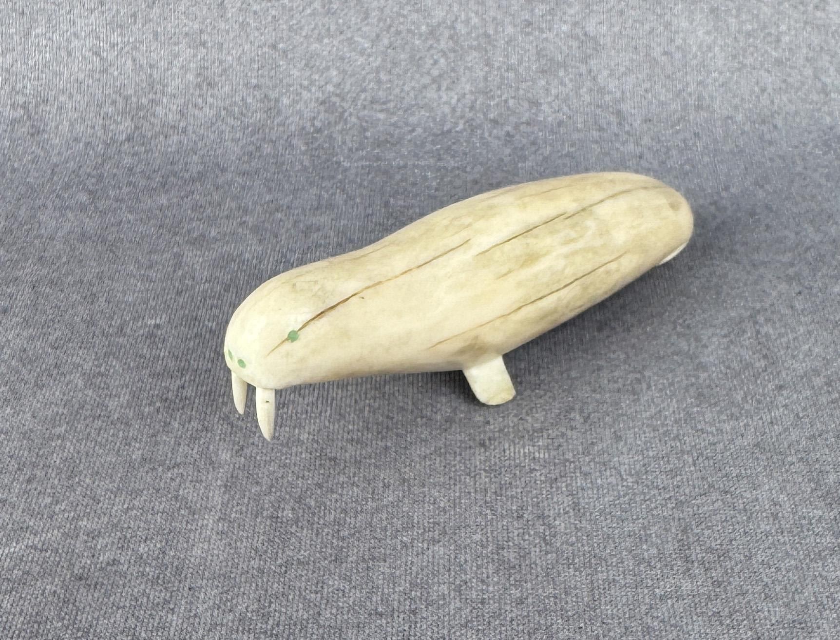 4 3/8" by 1 3/8" by 1 1/8". Carved walrus material. Native made prior to 1972. This item cannot be shipped to Oregon, California, Hawaii, New York, New Jersey, Internationally, or any other state that prohibits.
