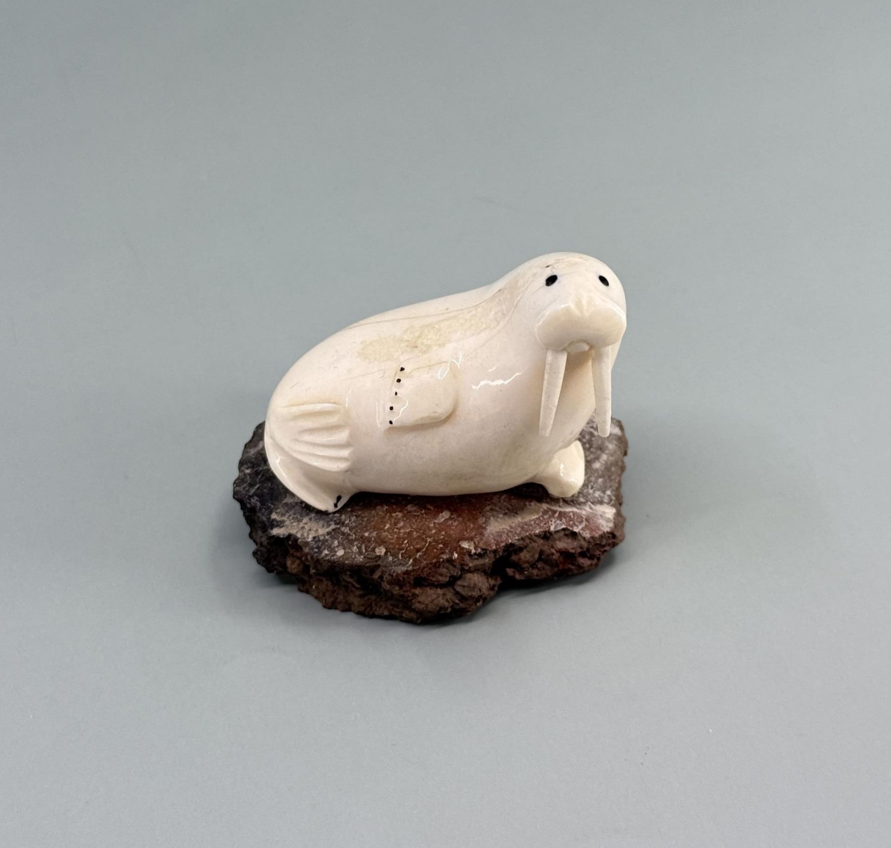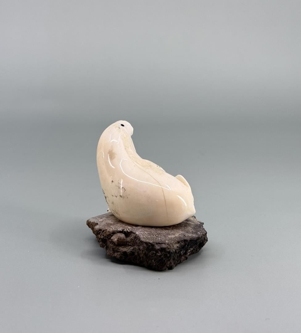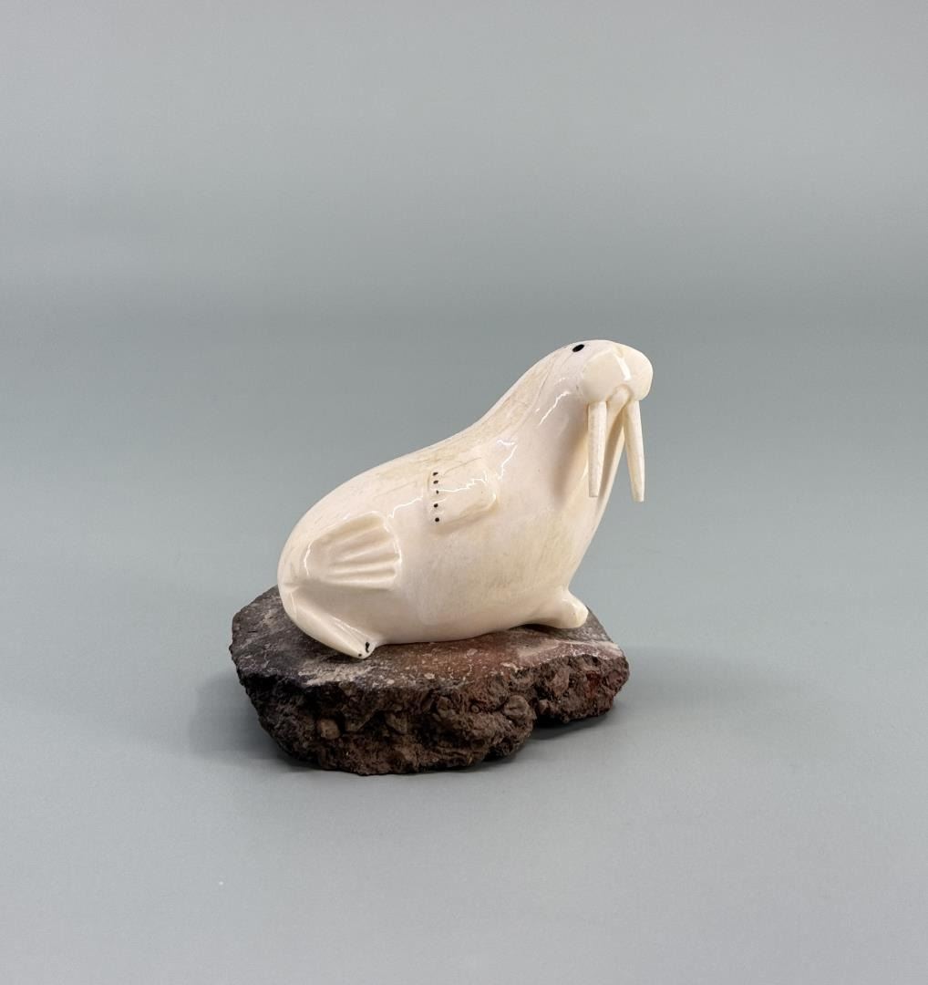 2 1/8" by 2" by 1 5/8". Carved walrus material. Native made prior to 1972. This item cannot be shipped to Oregon, California, Hawaii, New York, New Jersey, Internationally, or any other state that prohibits.