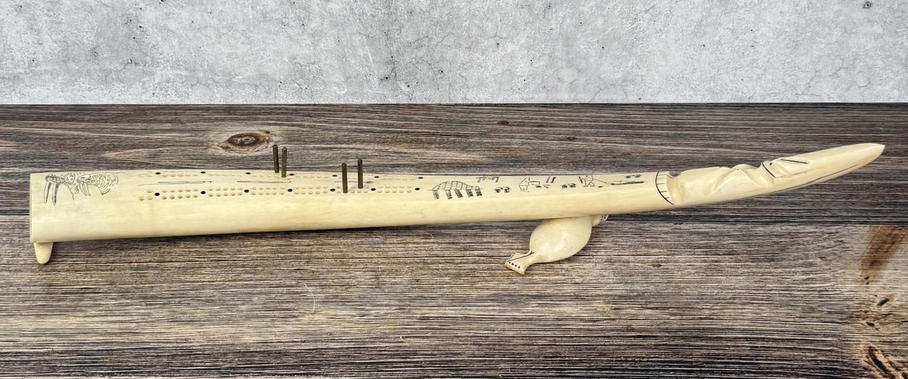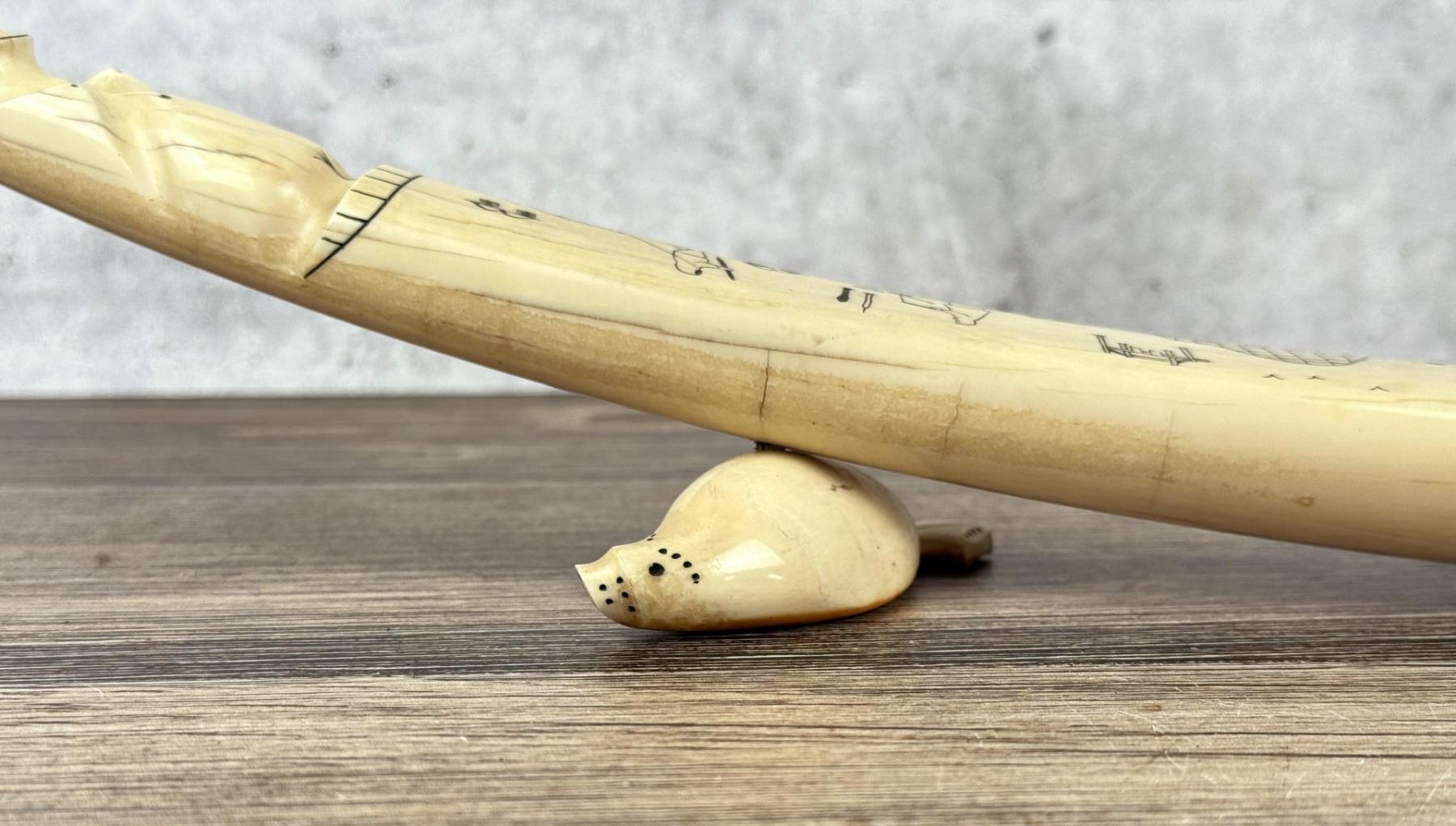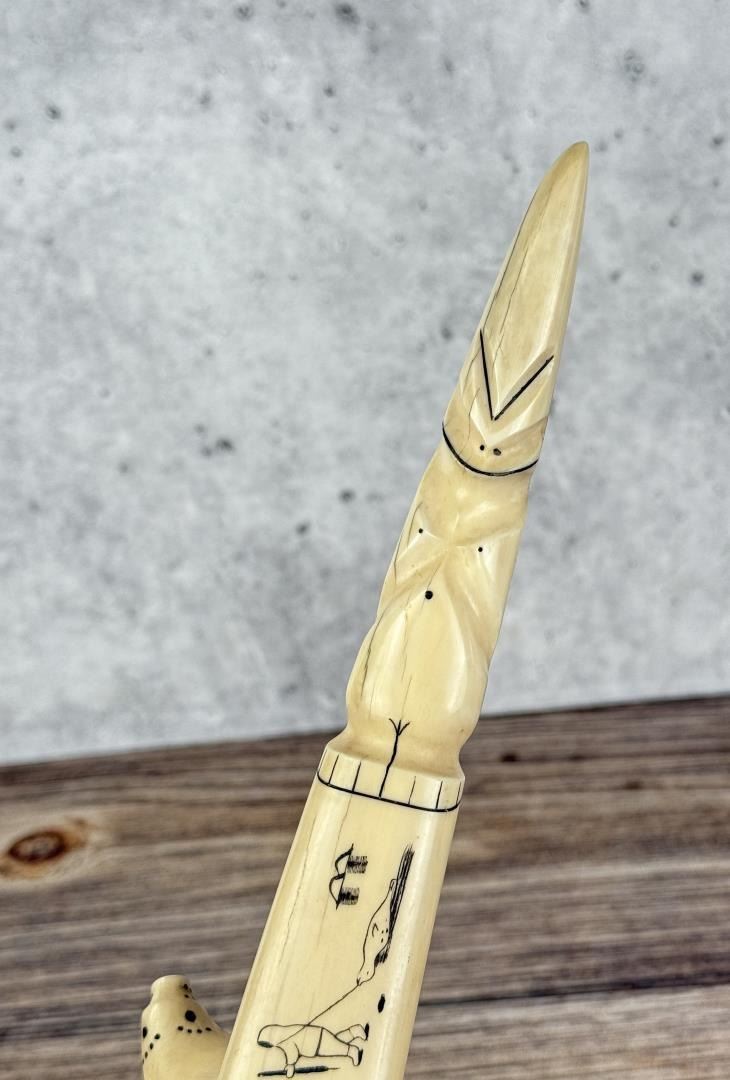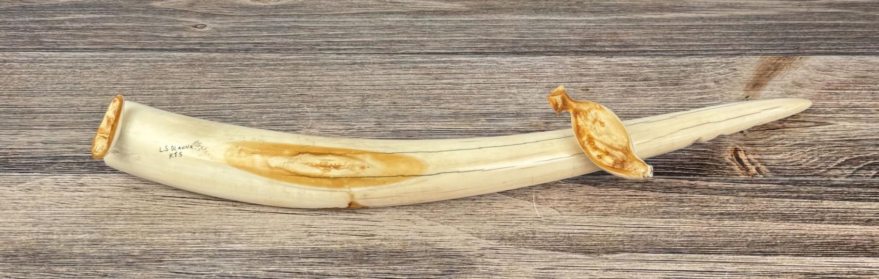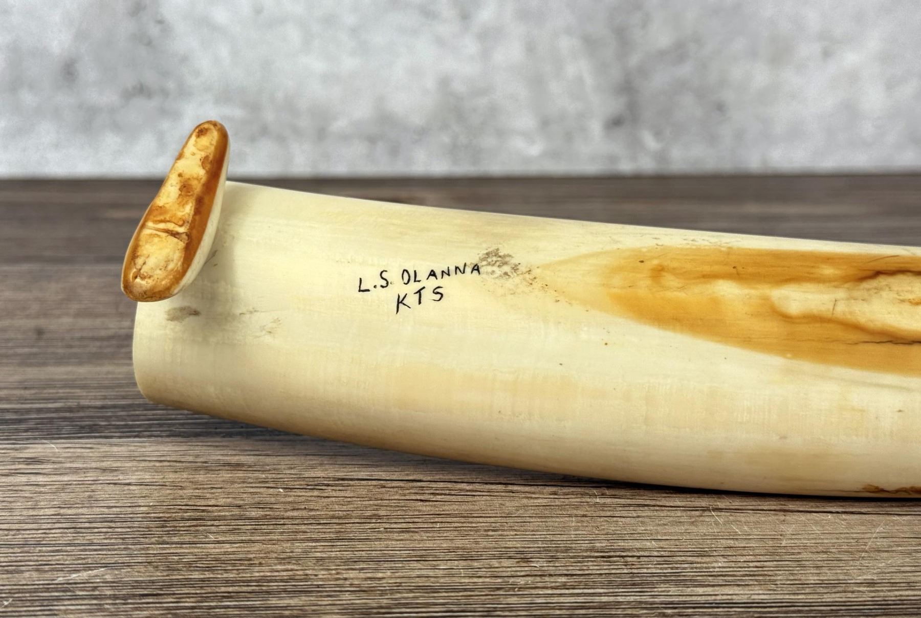 Signed L.S. Olanna. 20" by 4" by 3 1/4". Carved Walrus Ivory. Native made prior to 1972. This item cannot be shipped to Oregon, California, Hawaii, New York, New Jersey, Internationally, or any other state that prohibits.