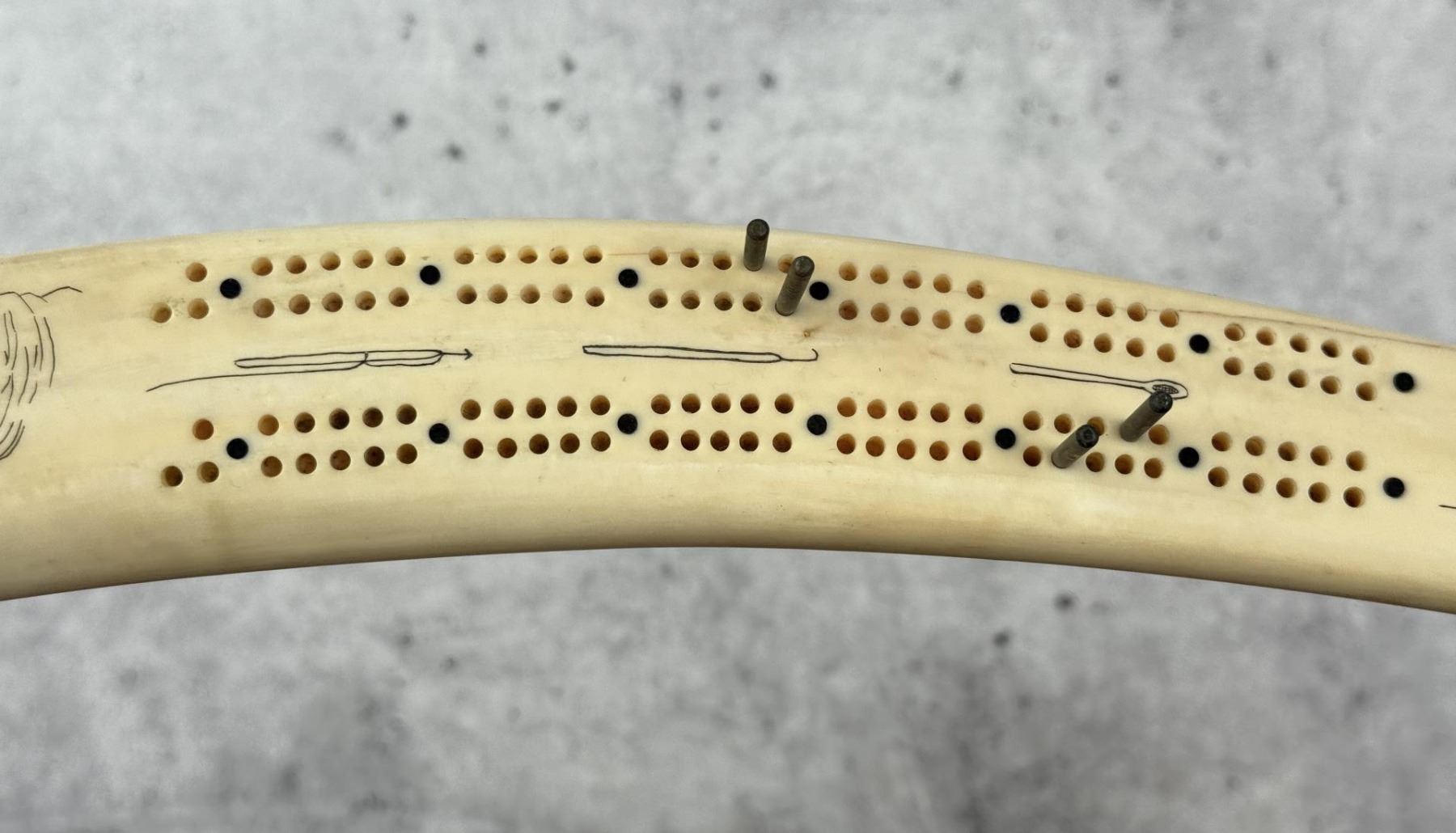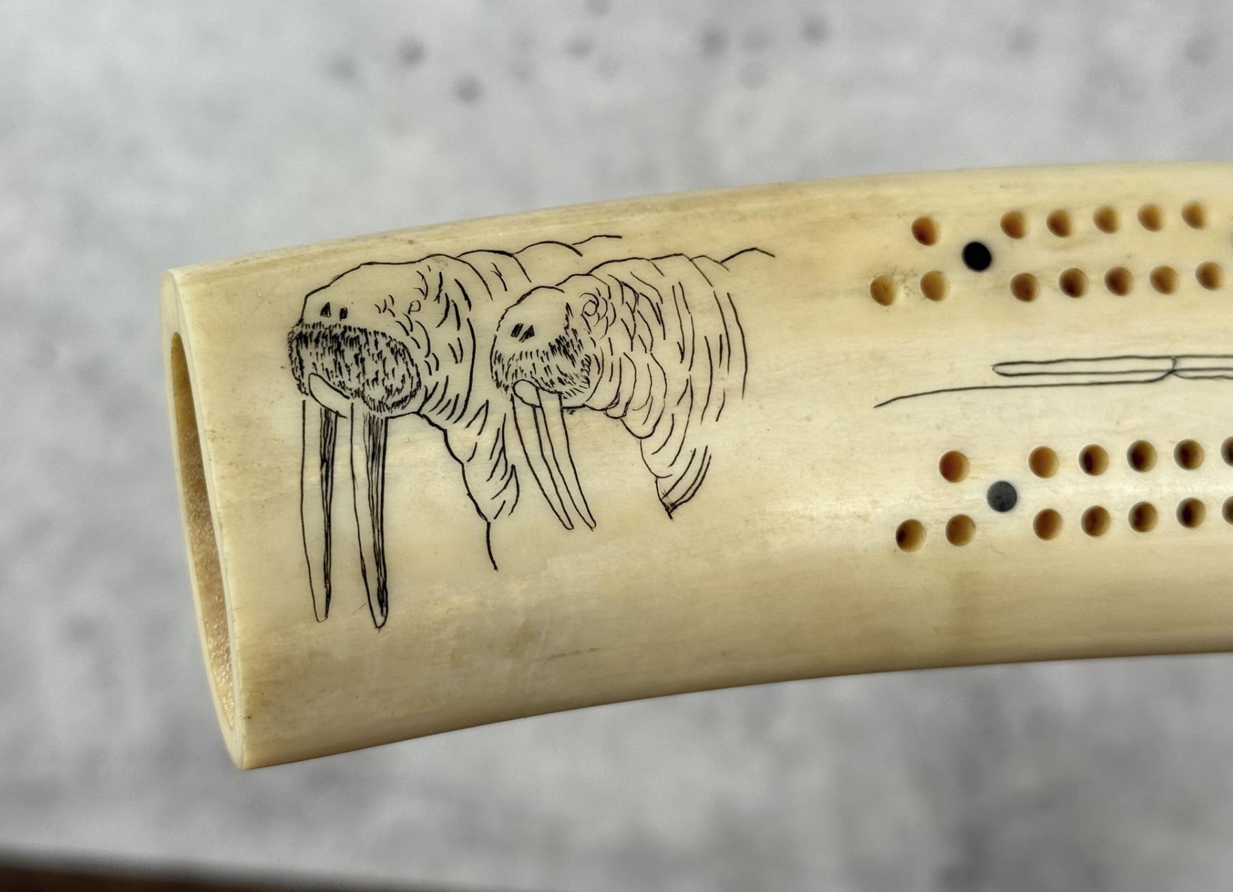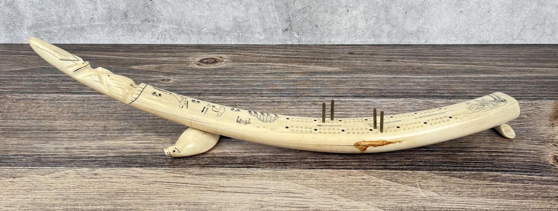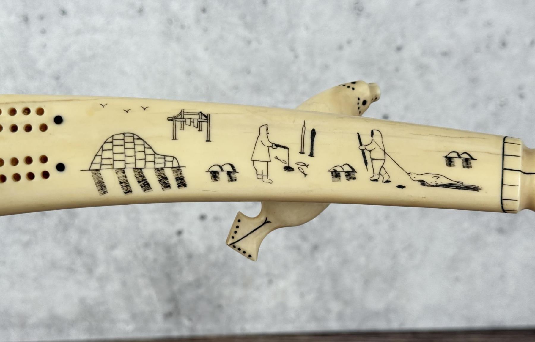 Signed L.S. Olanna. 20" by 4" by 3 1/4". Carved Walrus Ivory. Native made prior to 1972. This item cannot be shipped to Oregon, California, Hawaii, New York, New Jersey, Internationally, or any other state that prohibits.