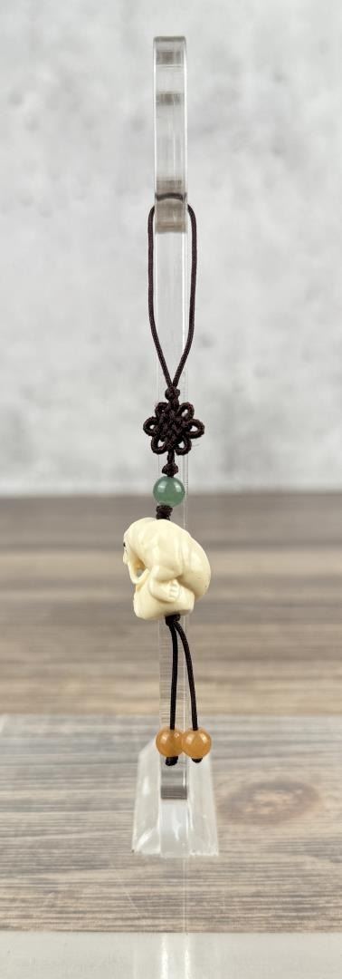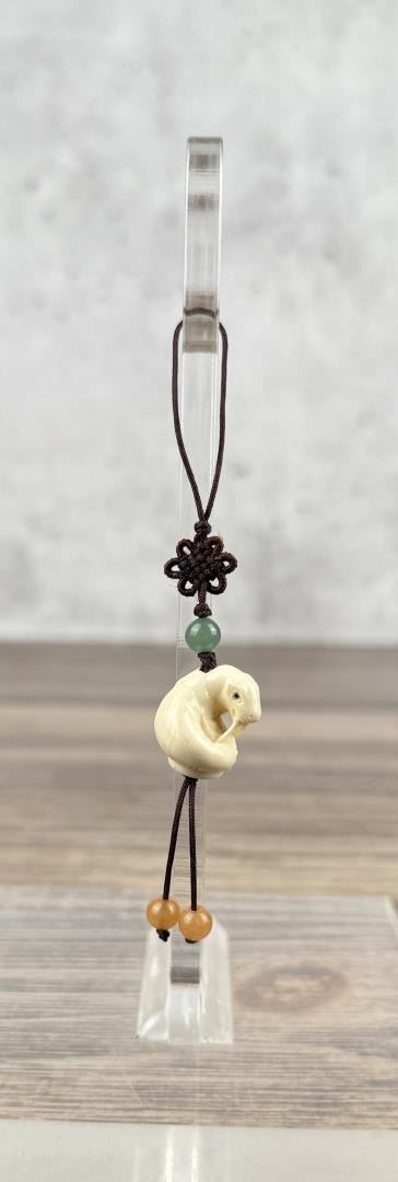 4" long on string. Carved walrus material. Native made prior to 1972. This item cannot be shipped to Oregon, California, Hawaii, New York, New Jersey, Internationally, or any other state that prohibits.