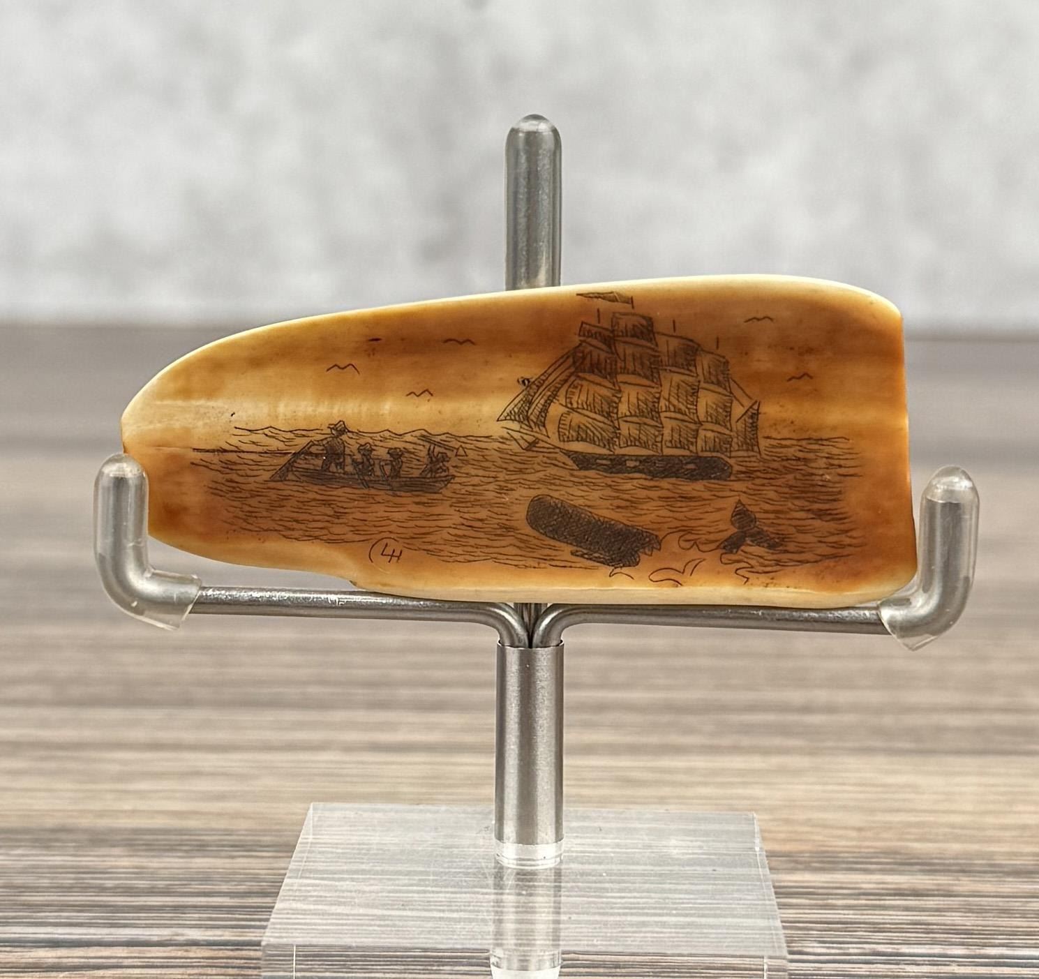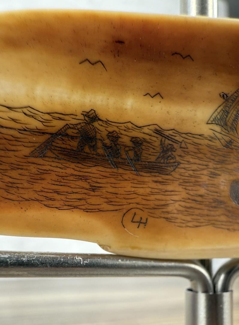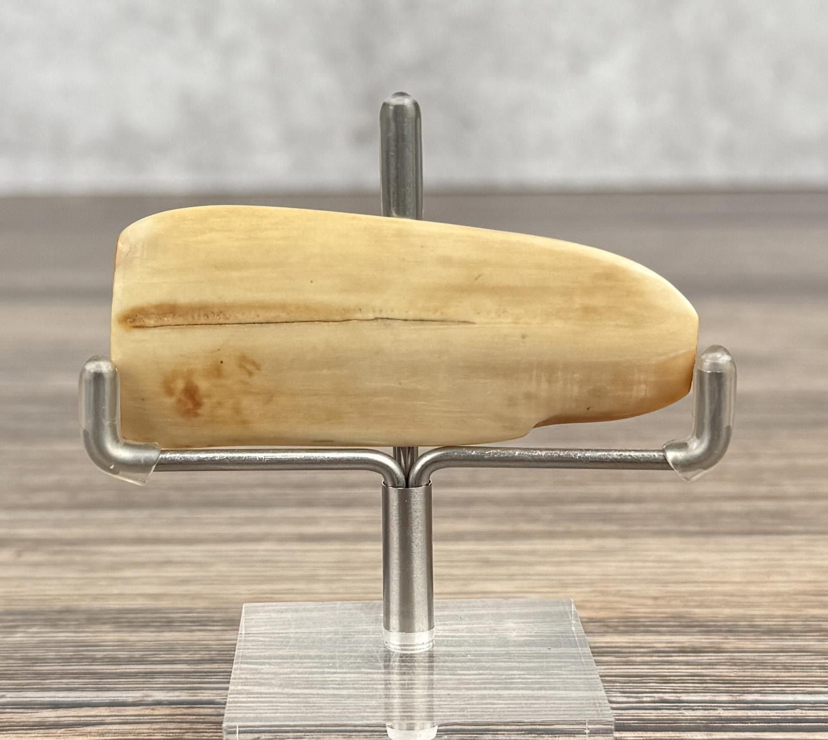 2 5/8" by 1". Carved walrus material. Native made prior to 1972. This item cannot be shipped to Oregon, California, Hawaii, New York, New Jersey, Internationally, or any other state that prohibits.