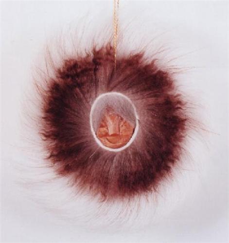 These cottonwood mask ornaments are made by David Hendren in Alaska. The artist is a card-carrying member of the Cherokee Nation (status number 1833) who moved to Alaska to work on the pipeline and stayed. The ornaments are trimmed with real beaver and fox fur.