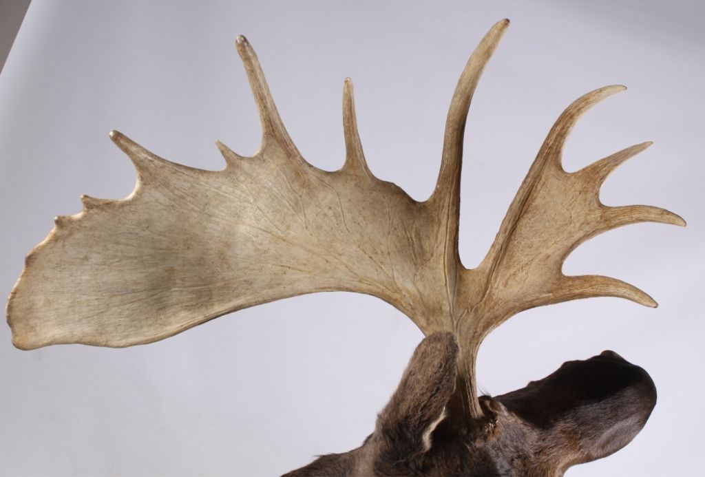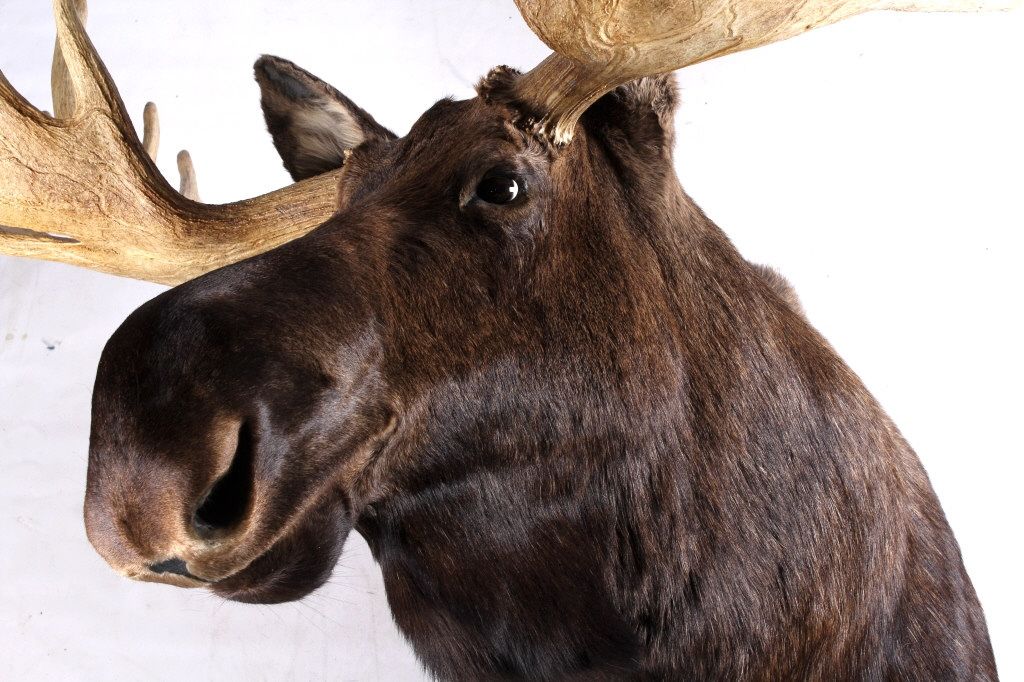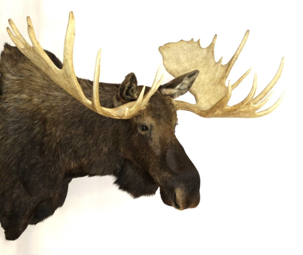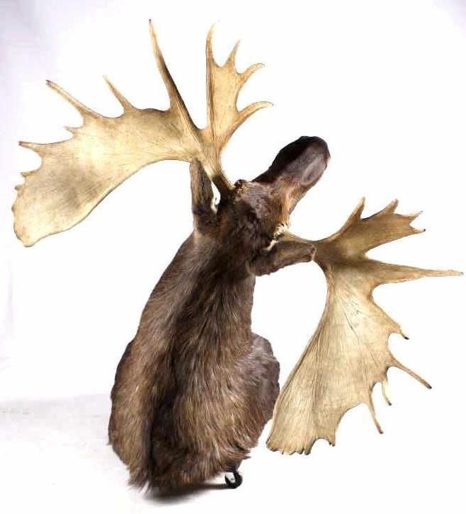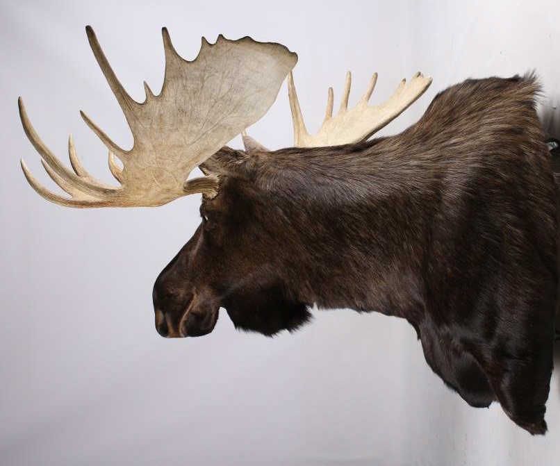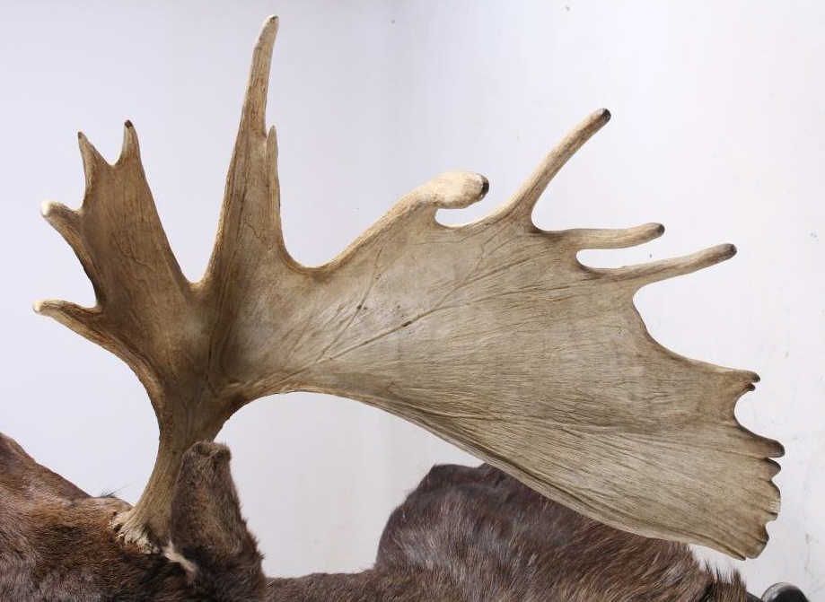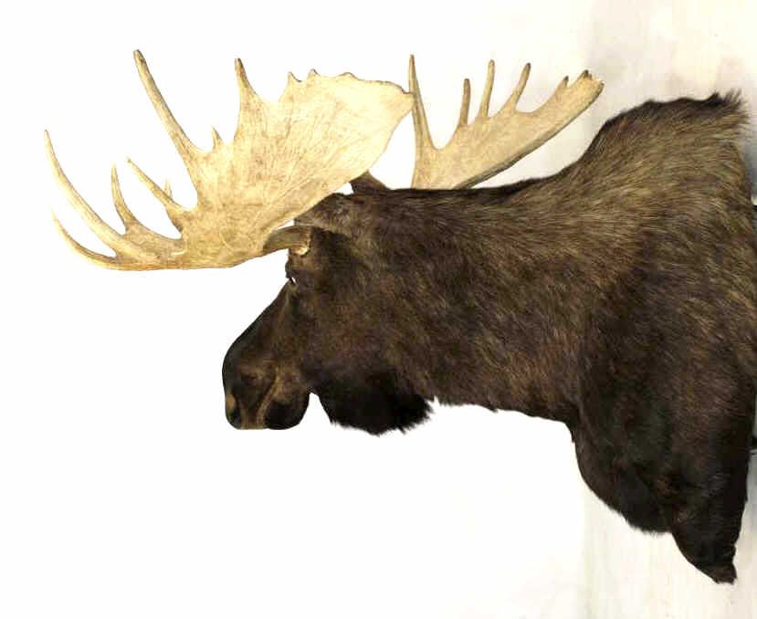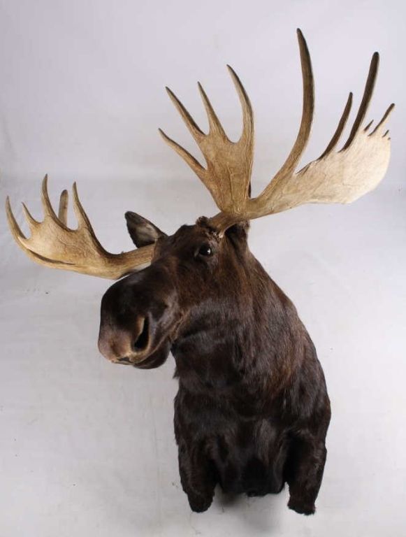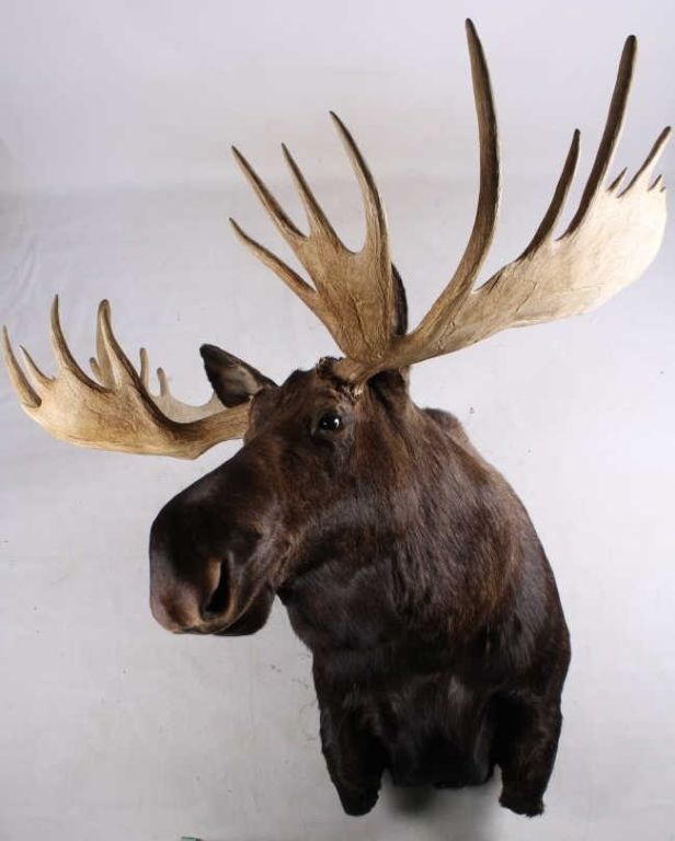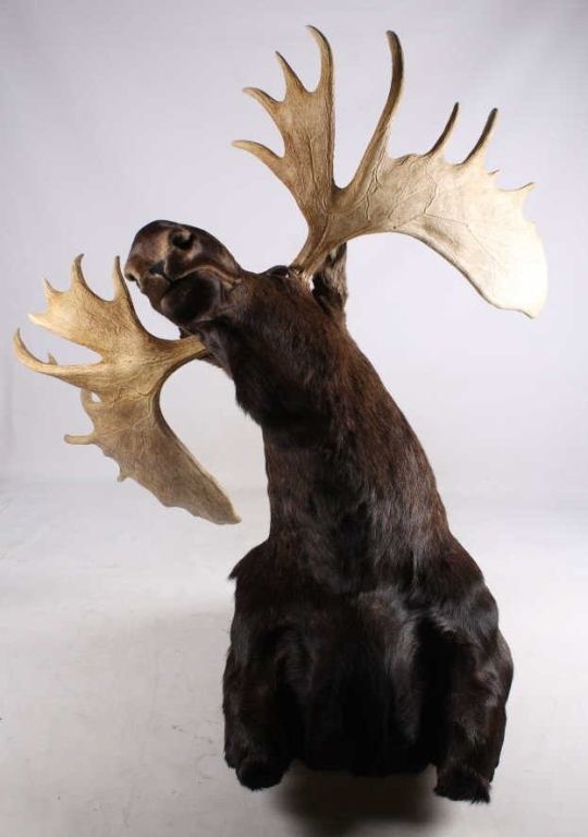 This is a large record trophy size Alaskan Yukon Moose shoulder mount. Boone & Crocket scored Alaska-Yukon Moose scoring 212-1/8 entered by Robert Bowers III Manhattan, Mt 24th North American Big Game Awards, 1998-2000 on Jan. 30, 2001. This has the framed signed certificate from B&C. This is a massive shoulder mount showing great colored large antlers with a 64" spread. The mount is one of the largest on the market. Shipping Crate will be 74"x66"x55" total shipping weight 400lbs Packaging $270 (22)