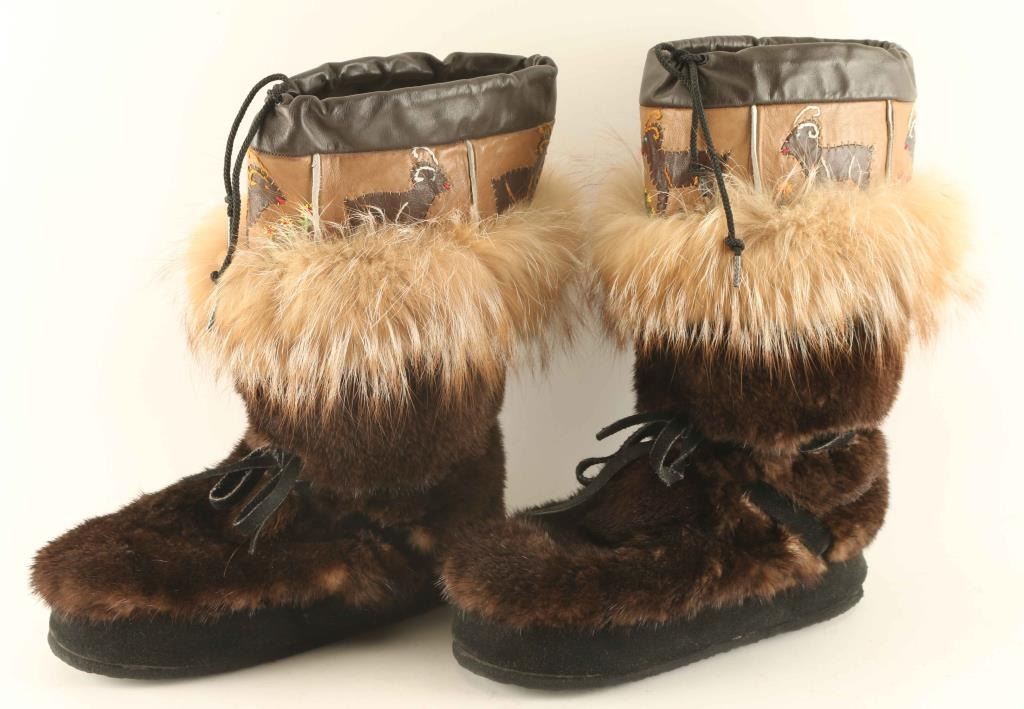 Suede and fur lower with rubber soles. Tops have an embroidered leather goat and floral motif..