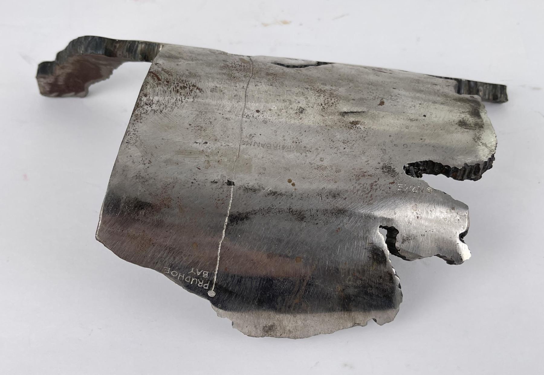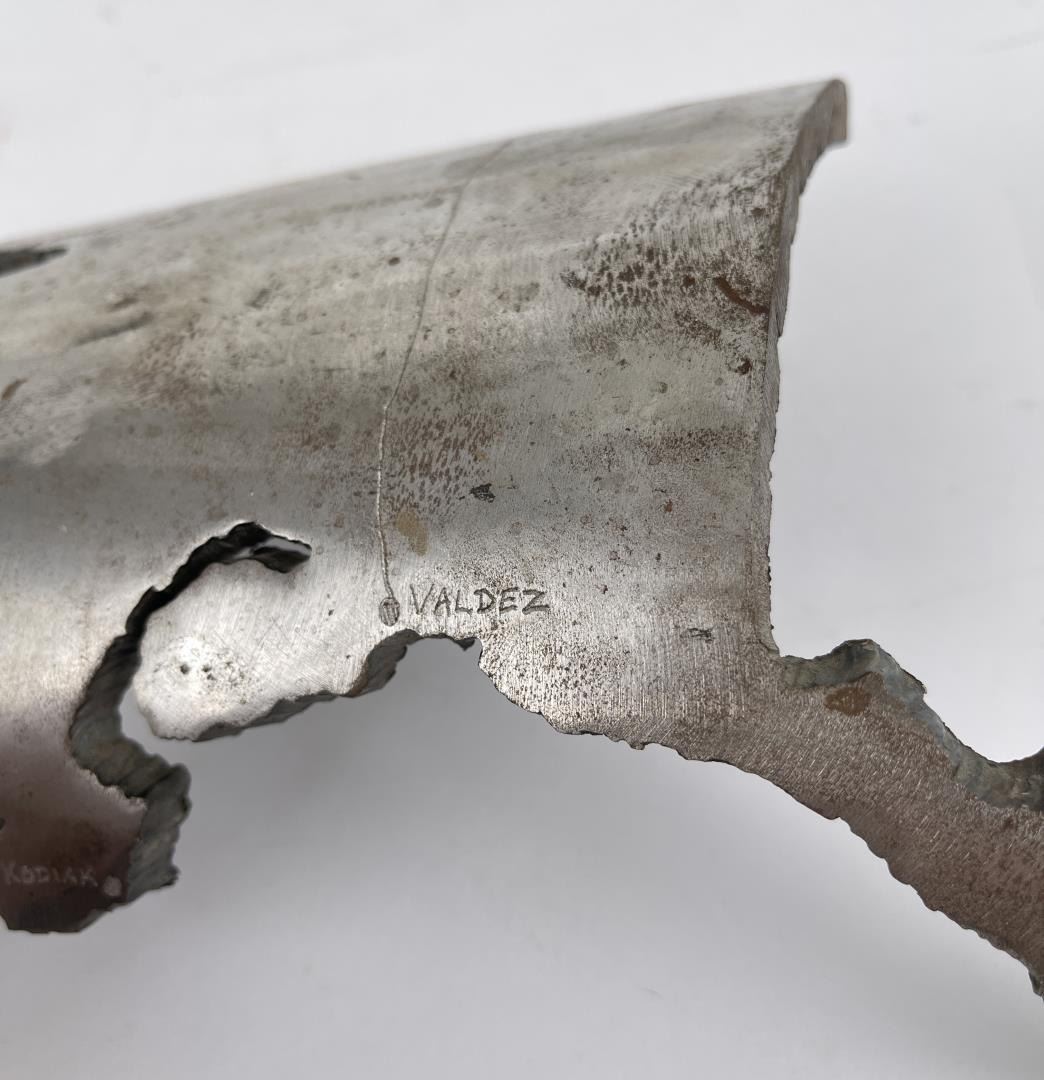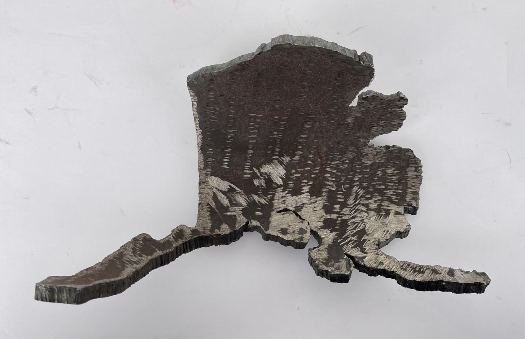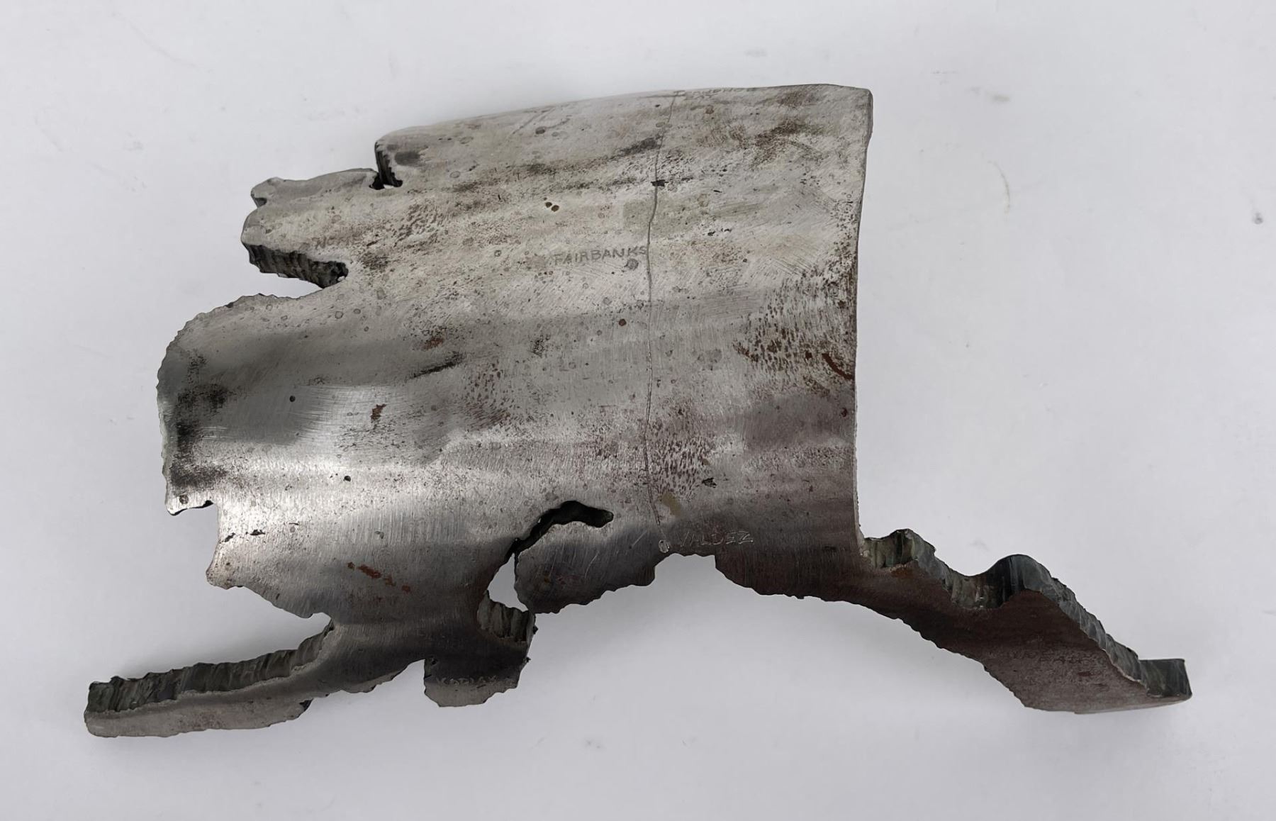 Very neat sculpture. Made from part of the Alaskan Oil Pipeline. Engraved with the route and the cities. 9 1/4" long, 5" tall.