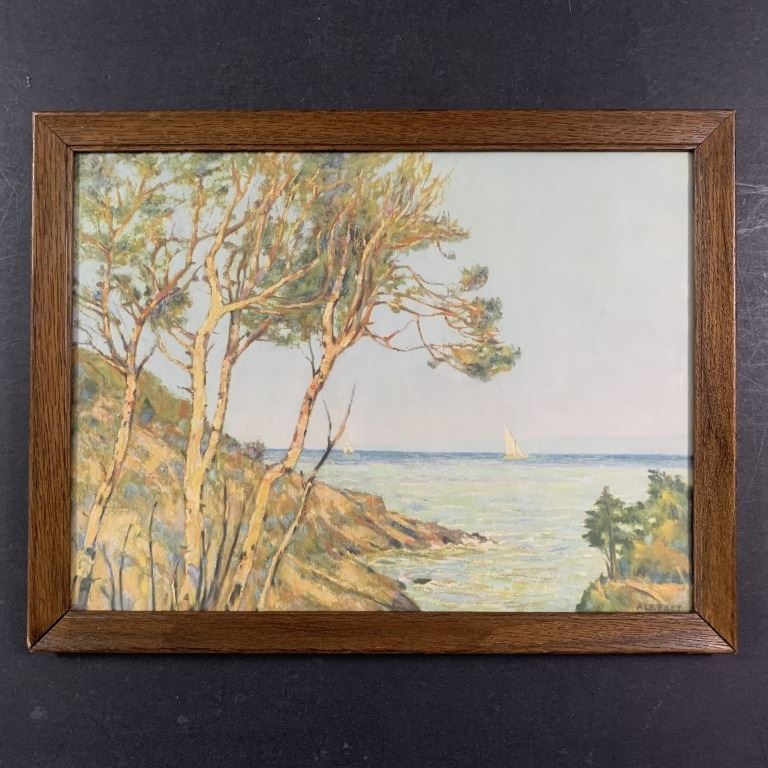 An Alb. Frey original pastel on paper painting, signed lower right. This piece is a waterscape with a rocky shoal and a few trees in the foreground, and a large body of water with a few sailboats off in the distance, underneath a bright blue sky. This piece is in excellent condition.