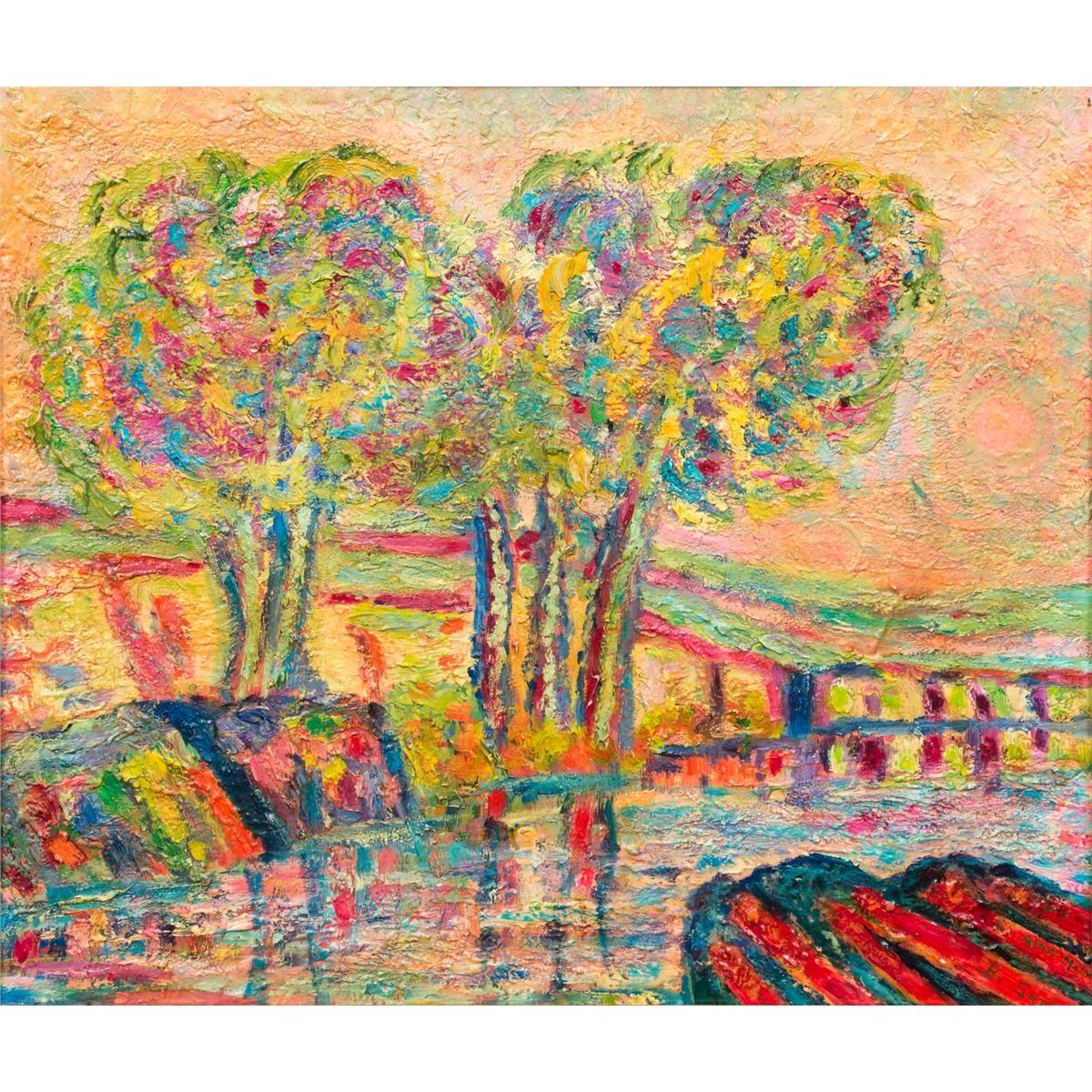 Alba Malm Almquist (1897 - 1986) and Birger Sandzen (1871 - 1954). Smoky River Bank. 22" x 26" oil on board. Signed lower right: Alba Malm B. Sandzen. Almquist was a Sandzen student and received a Bachelor of Arts degree from Bethany College.