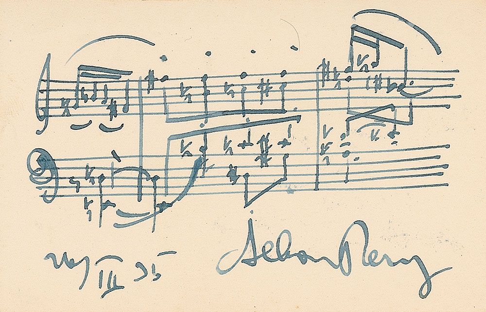 Austrian composer (1885–1935). AMQS on an off-white 3.75 x 2.5 card. Berg pens three intricate double bars from an unidentified work, signing at the bottom, “Alban Berg,” and dating it March 26, 1935. In fine condition.