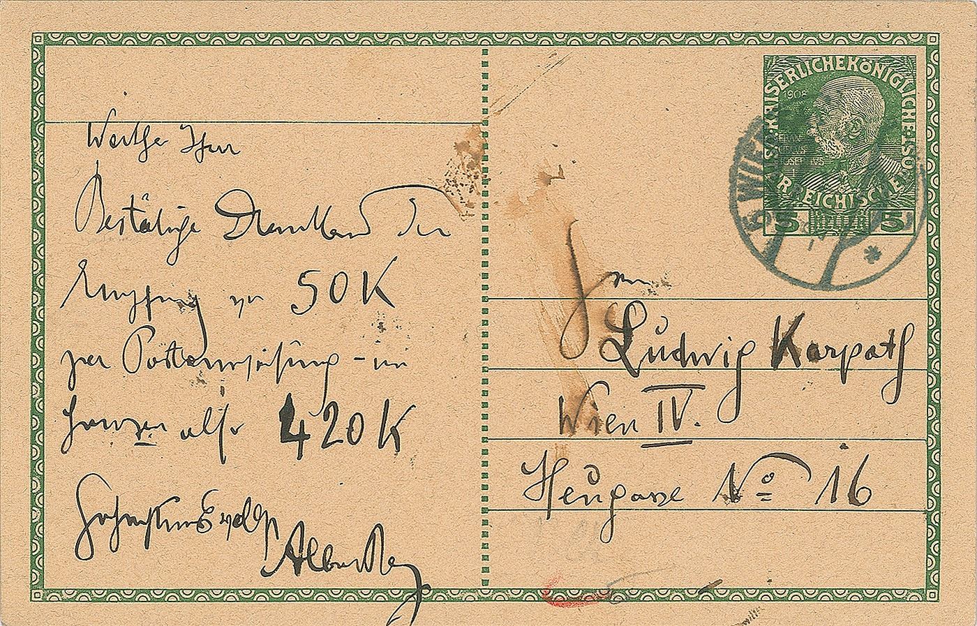 Austrian composer (1885–1935) who produced compositions that combined Mahlerian Romanticism with a personal adaptation of Schoenberg's twelve-tone technique. Untranslated ALS in German, one page on a 5.5 x 3.5 postcard, postmarked October 2, 1911. In fine condition, with a smudge to the address area.