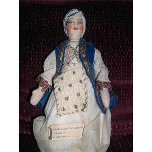 Here is a doll that has a tag Near East Industries made in Athens, Greece (this label is sewn into the bakc of the vest. She is 8" tall and is made of cloth. She has a tag on the front that says Near East Industries My Name is Perihan