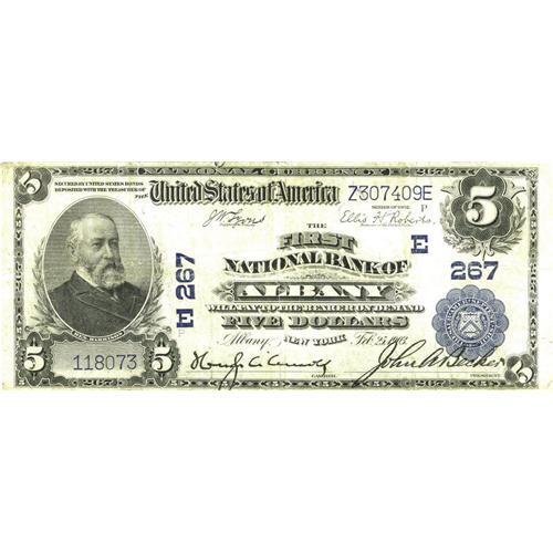<B>Albany, NY</B></I> - $5 1902 Plain Back Fr. 598 <B>The First NB</B></I> Ch. #(E)267<BR>This was the first of the nine issuing banks located here to gain its federal charter. Located at the head of navigation on the Hudson River, Albany was settled in the mid 17th century by the Dutch West India Company and was originally known as Beverwyck. A complete type set from here would consist of 20 different types and denominations. Tonight's offering is a very presentable <B>Fine-Very Fine</B></I> with darkly stamped signatures. State capital collecting has always been a popular theme within the National Bank Note fraternity and this would be an attractive yet quite affordable addition to whatever collection it enters with the fall of the hammer tonight.
