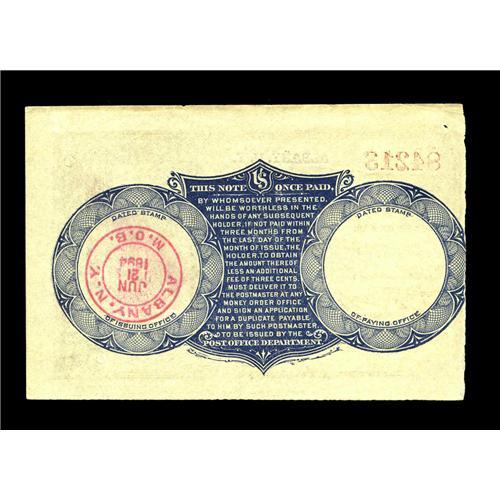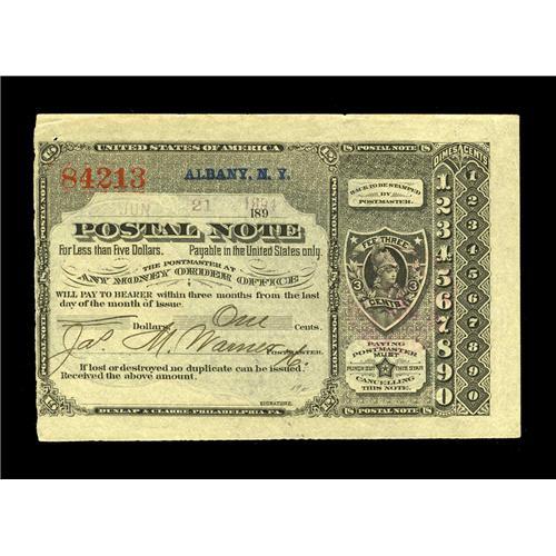 <B>Albany, NY Postal Note</B></I><BR>Another exceptional piece from the Slabaugh collection, as this is clearly another example obtained for preservation rather than commerce. It's issued in the amount of 1¢, but that number has not been punched out and the note is pristine and still fully embossed. This is the fourth type issued, which is printed by Dunlap & Clarke of Philadelphia. <B>Crisp Uncirculated.</B></I>