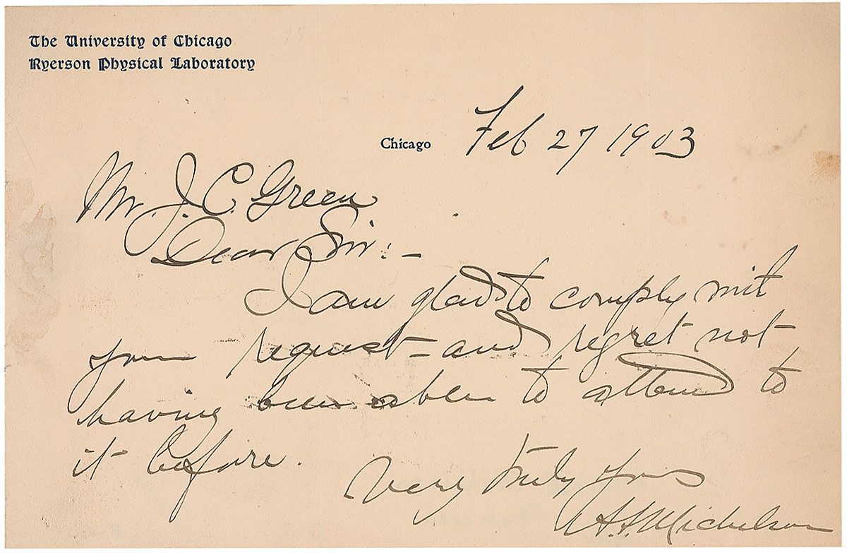 Physicist (1852–1931) who was the first American scientist to win a Nobel Prize in 1907. ALS signed “A. A. Michelson,” one page, 8.25 x 5.5, University of Chicago Ryerson Physical Laboratory letterhead, February 27, 1903. Letter to an admirer. In full: “I am glad to comply with your request and regret not having been able to attend to it before.” In very good condition, with two vertical folds, one through a single letter of signature, uniform toning, and some scattered soiling.