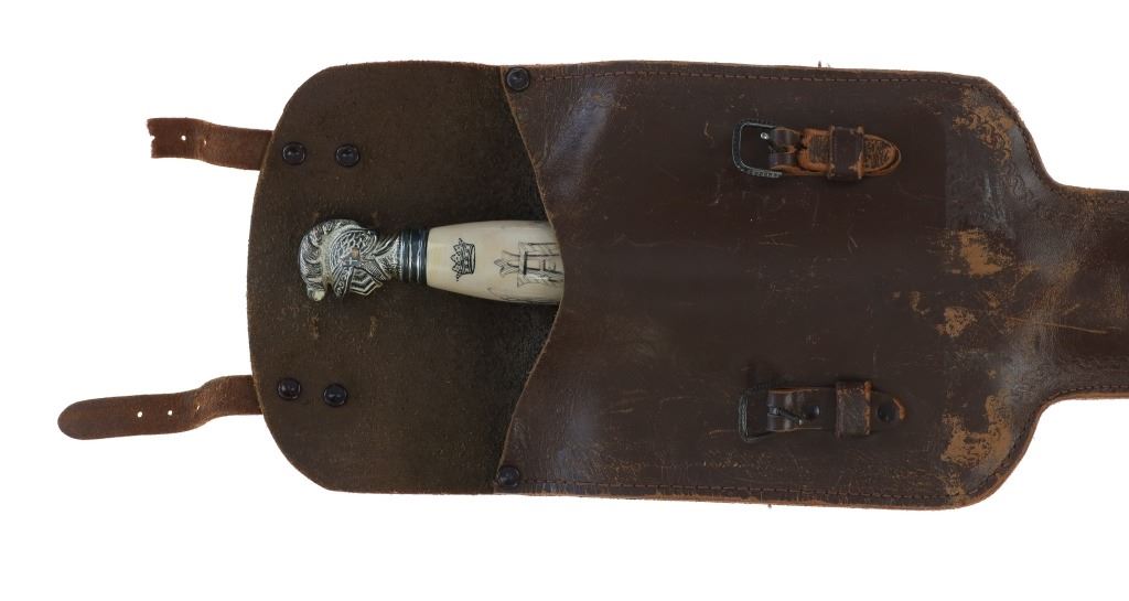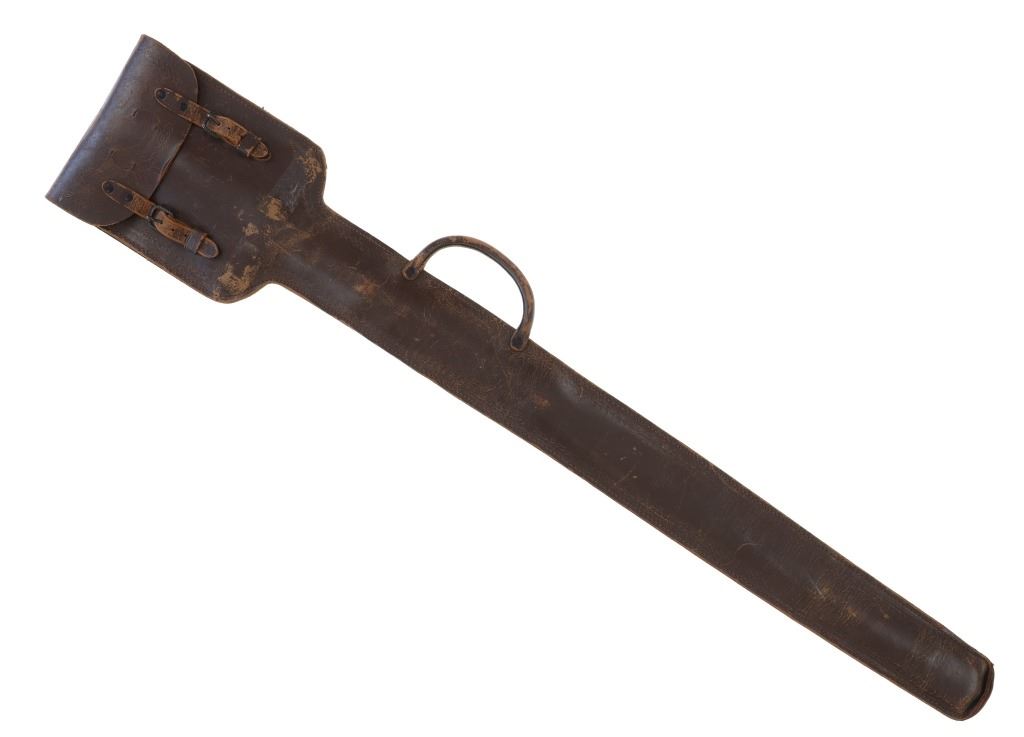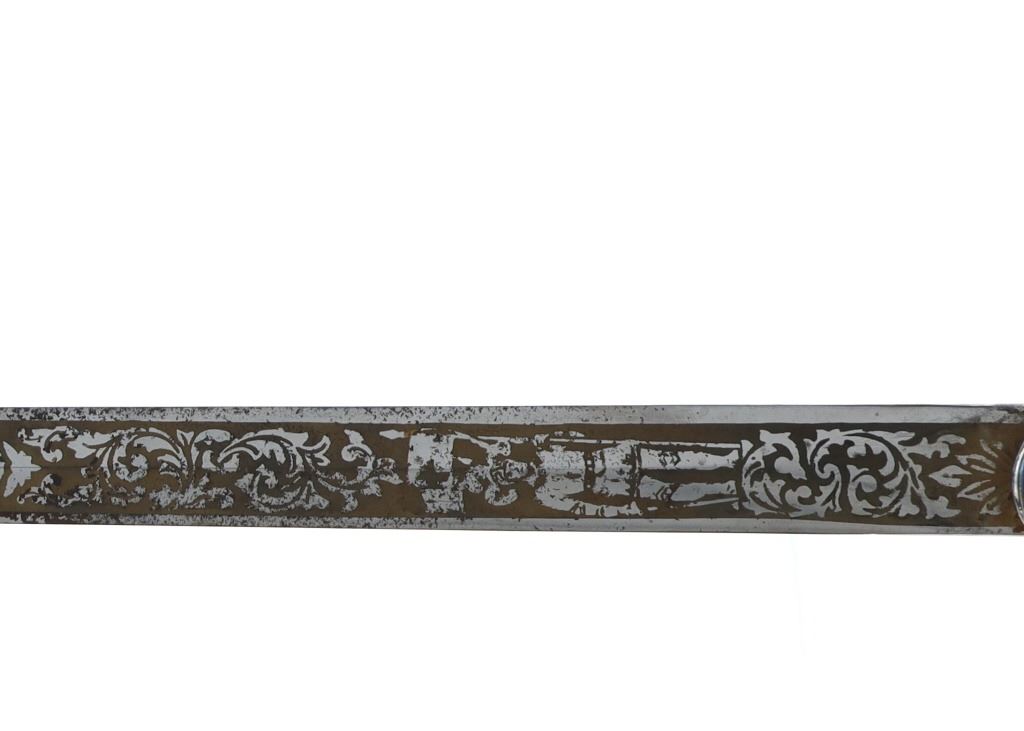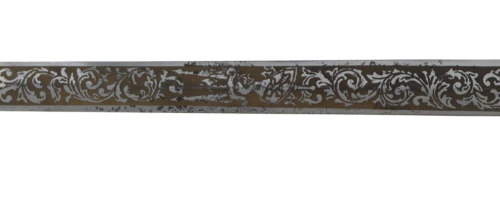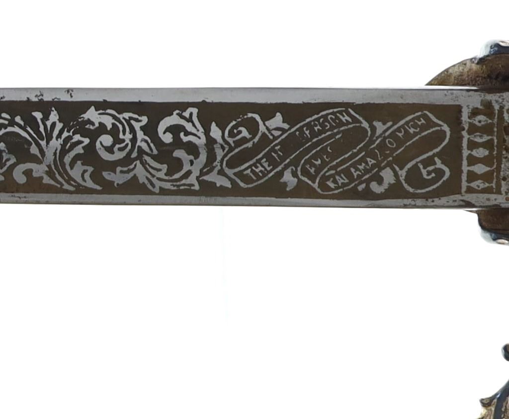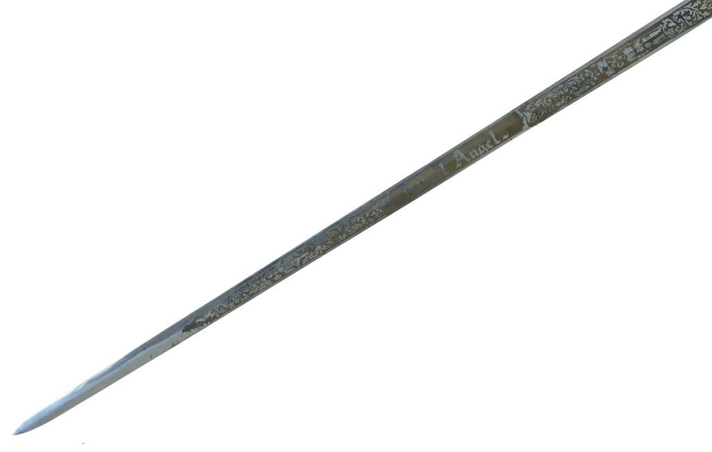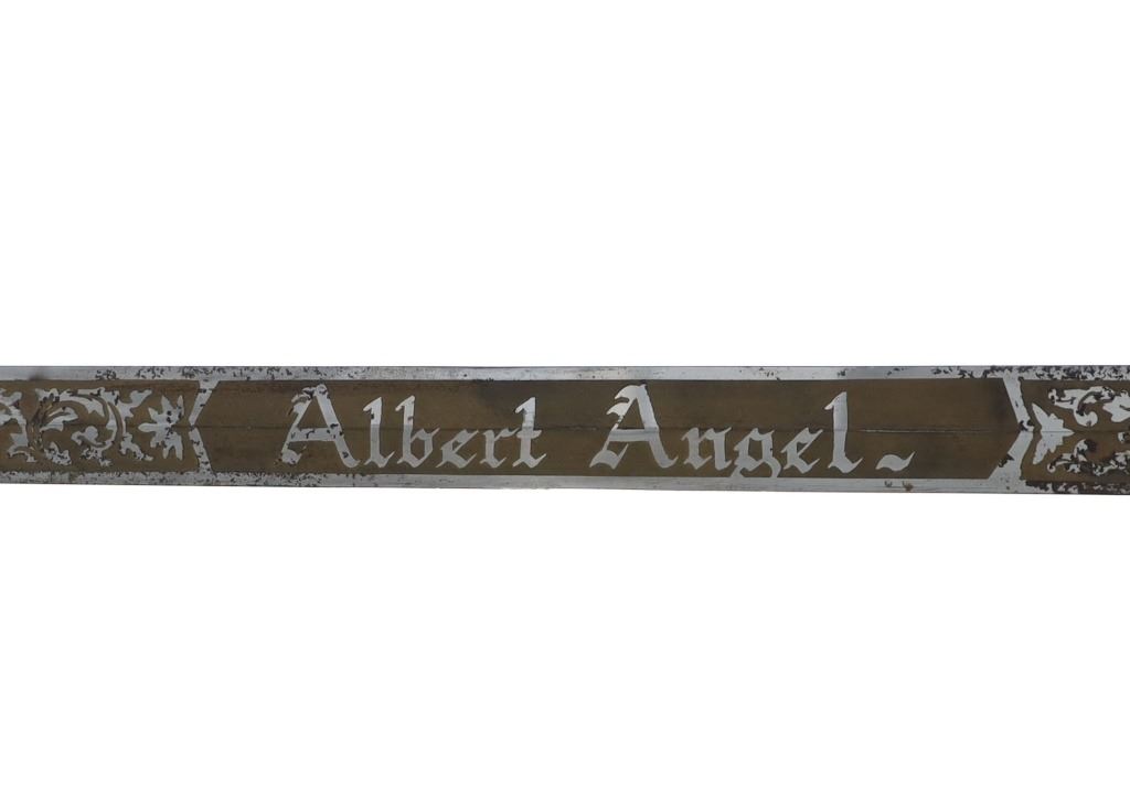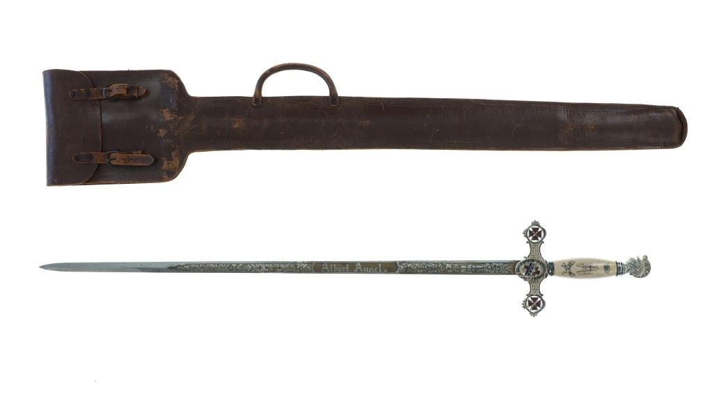 Featured in this lot is this Albert Angel gilt ornate Masonic ceremonial sword circa 1940's. The sword features a wonderfully and professionally crafted stainless steel brass and bone construction that features a huge amount of Masonic theatrical decoration from the knight helmet on the to the painted on gilt crosses along with a judges chair with a crown overhead and a wreath below it on the handle. The hilt is shows independence crosses and a central burning cross center piece. The sheath is marked with 'Albert Angel' and is also marked this to the sword. The condition of this Masonic sword is good with no obvious signs of damage and shows good overall condition. The measurements of this sword case 36 1/2" x 6 3/4" x 3/4", and the sword itself measures 36" x 5 1/4 x 1".