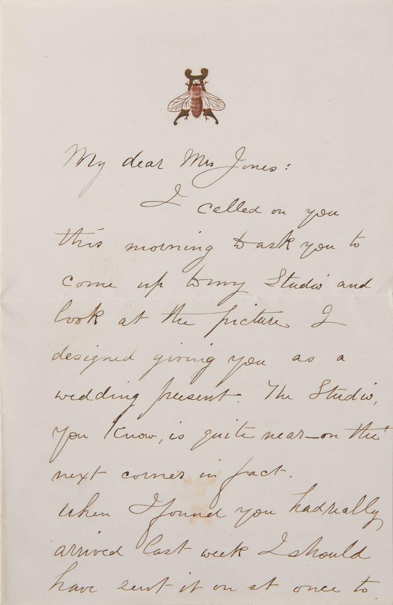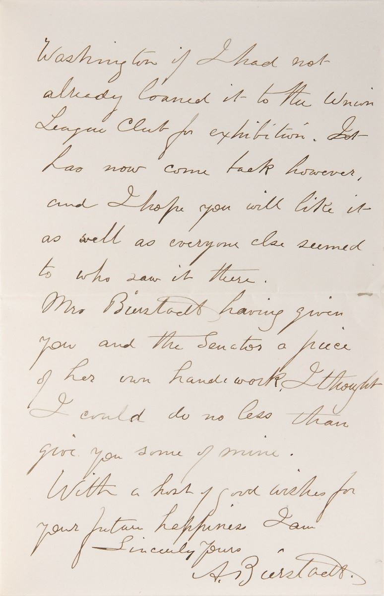 German-American painter (1830–1902) best known for his large landscapes of the American West during the 19th century. ALS signed “A. Bierstadt,” two pages on two adjoining sheets, 4.5 x 6.75, personal letterhead, no date. Letter to Mrs. Jones, in full: “I called on you this morning to ask you to come out to my Studio and look at the picture I designed giving you as a wedding present. The Studio, you know, is quite near—on the next corner in fact. When I found you had really arrived last week I should have sent it on at once to Washington if I had not already loaned it to the Union League Club for exhibition. It has now come back however, and I hope you will like it as well as everyone else seemed to who saw it there. Mrs. Bierstadt having given you and the Senator a piece of her own handiwork, I thought I could no less than give you some of mine.” In fine condition.