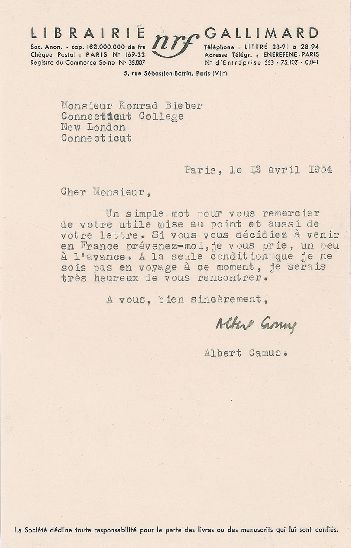 TLS in French, one page, 5.5 x 8.5, Librarie Gallimard letterhead, April 12, 1954. Letter to Konrad Bieber, in full (translated): "Just a brief word to thank you for the explanation. Should you decide to come to France, let me know in advance. Unless I am away travelling at that moment, I would be very glad to make your acquaintance." In fine condition, with staple holes to the top.