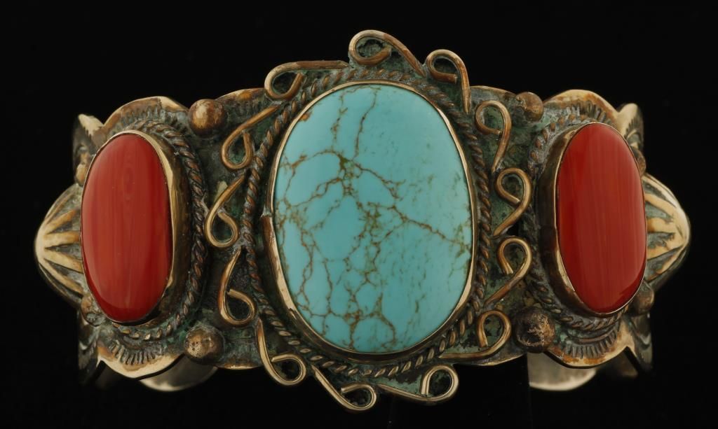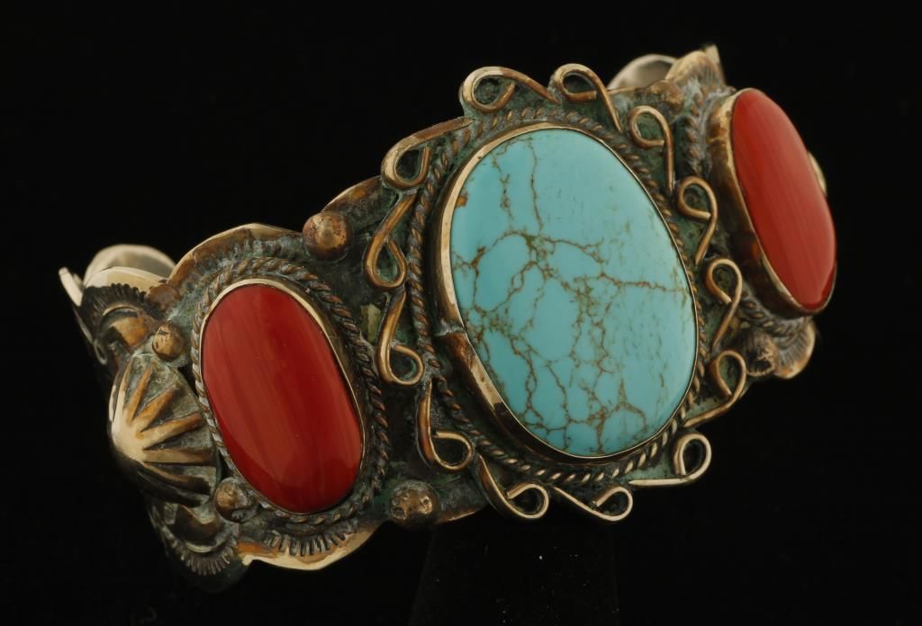 Turquoise & red coral cuff by Navajo artist Albert Cleveland. Albert does silversmithing in the 1940's curio style. The piece is in nickel silver and has a turquoise stone in the center which measures 1-3/8" in length. This center stone is accented by 2 large red coral pieces on the sides. The cuff features rope detail, scroll, and bead work along with the stamp work. The piece measures 1-3/4" wide, has an inside measurement of 5-5/8" with a gap of 1-3/8". It is hallmarked "AC" on the inside. The cuff weighs 82.5 grams.