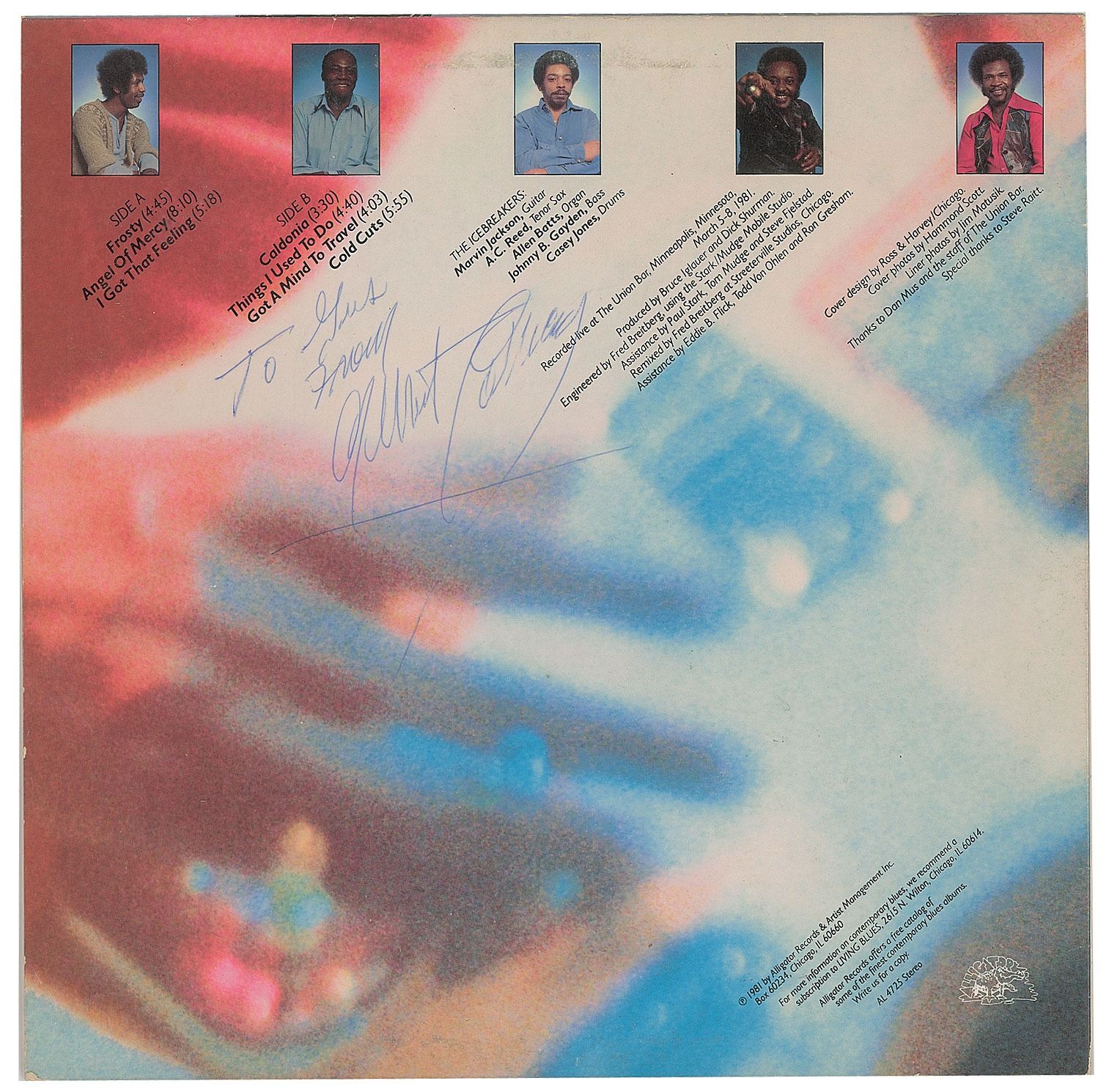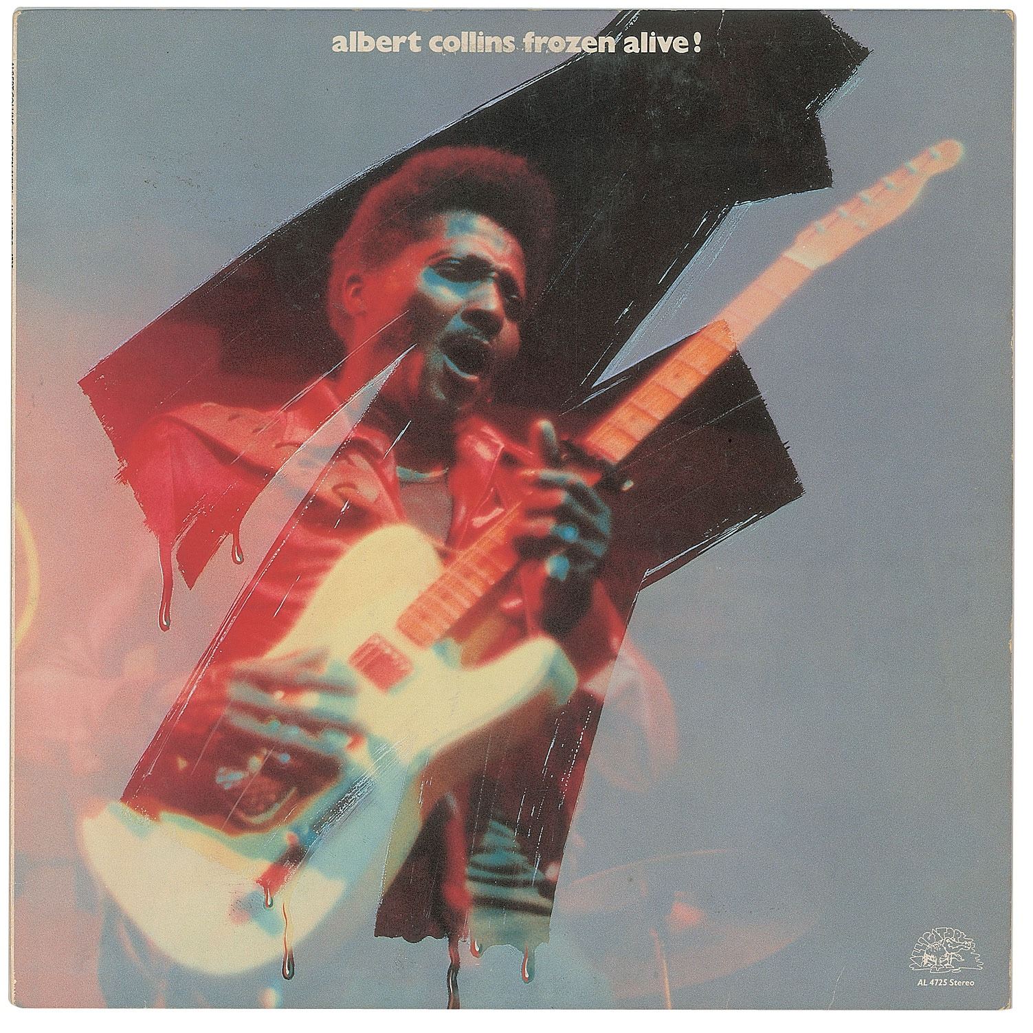American electric blues guitarist and singer (1932–1993) whose long association with the Fender Telecaster led to his title as 'The Master of the Telecaster.' Frozen Alive! album signed and inscribed on the back cover in blue ballpoint, "To Gus, from, Albert Collins." In fine condition. The record is included.