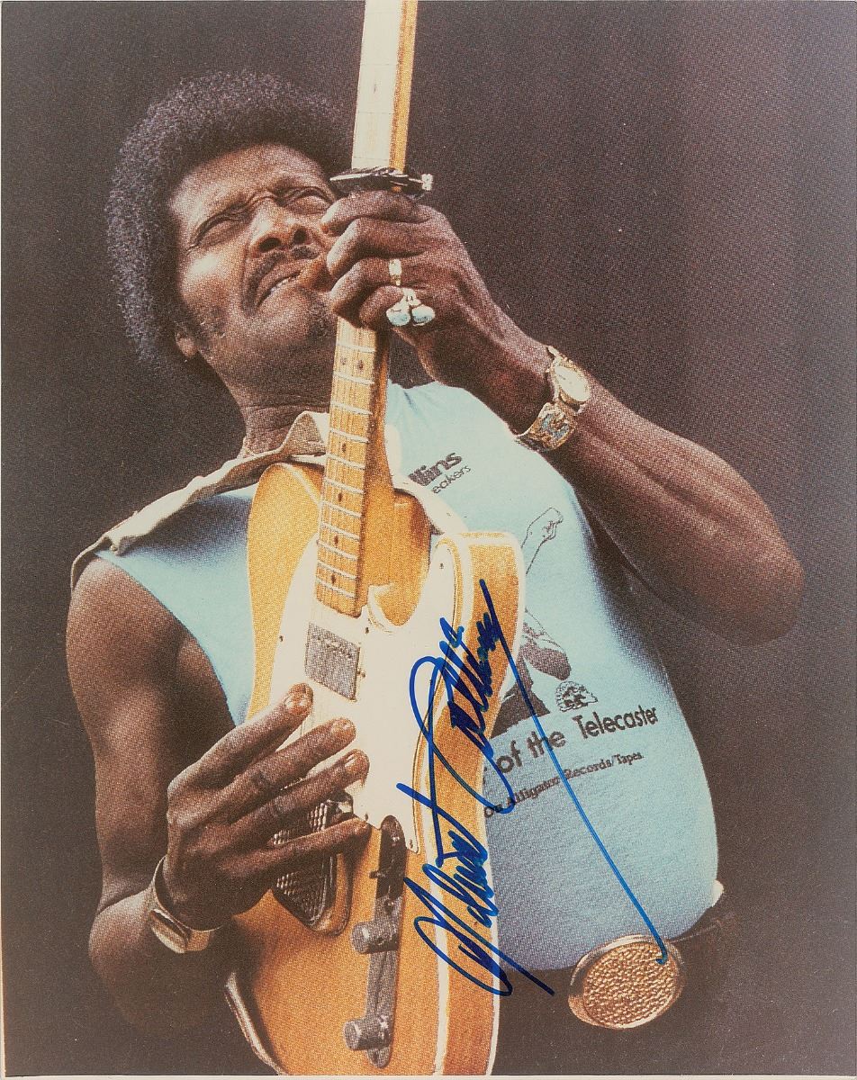 Color glossy 8 x 10 photo of Collins wailing on a Telecaster, signed in person in blue felt tip. In fine condition. Originally obtained by in-person specialist Mike Wehrmann.