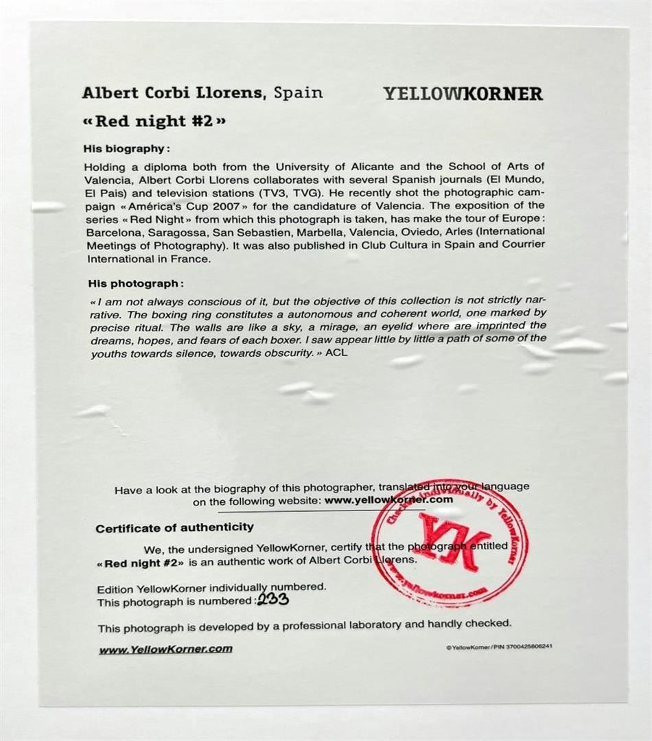 Albert Corbi Llorens Spain Red Night #2 Boxing YellowKorner Certified Photograph. Certificate of Authenticity from YellowKorner affixed to the back. Matted Dimensions 16"x20". Protected with Clear Mylar Sleeve.
