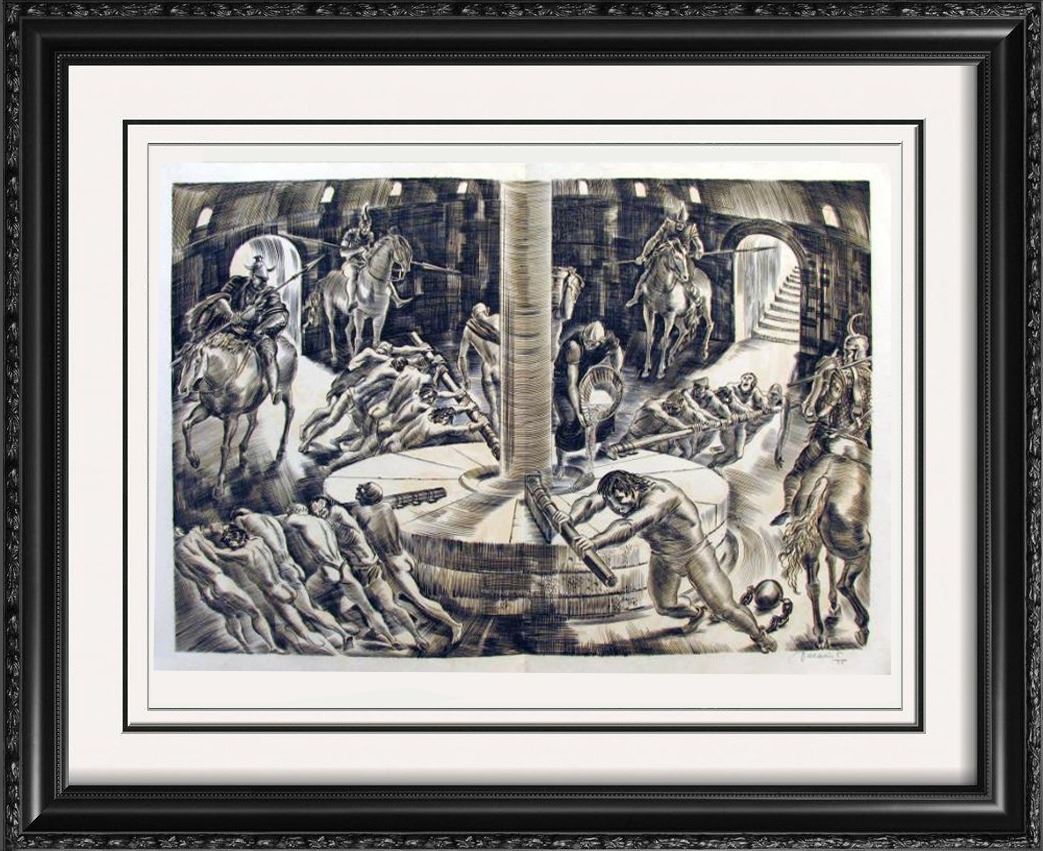 Albert Decaris | Title of Art: c. 1939 From the Samson Agonistes Suite | Medium: Hand Signed by the Artist Engraving on Paper | Edition #: 5/55 | Unframed Size: 15 x 22 inches | Offered Unframed | Value: $ 1950 | Art For Sale presents limited edition engravings by Albert Decaris from Samson Agonistes by poet John Milton. Drawing on the story of Samson from the Old Testament, Judges 13–16, each engraving is a dramatization of the story starting at Judges 16:23. The drama starts as Samson has been captured by the Philistines, had his hair, the container of his strength, cut off and his eyes cut out. Samson is "Blind among enemies, O worse than chains" (line 66).Samson undergoes despair when he loses God’s favor in the form of his strength. Milton’s dramatic poem, however, begins the story of Samson after his downfall—after he has yielded his God-entrusted secret to Dalila (Delilah), suffered blindness, and become a captive of the Philistines. Tormented by anguish over his captivity, Samson is depressed by the realization that he, the prospective liberator of the Israelites, is now a prisoner, blind and powerless in the hands of his enemies. The focus of Milton’s dramatic poem is ultimately on Samson’s regenerative process, an inner struggle beset by torment, by the anxiety that God has rejected him, and by his failure as the would-be liberator of his people. Samson’s discourse manifests an upward trajectory, through atonement and toward regeneration, which culminates in the climactic action at the temple of Dagon where Samson, again chosen by God, vindicates himself. In his searching for a way to return to being true to God and to serve his will, Samson is restored and again is in God’s grace and able to serve God. | Albert Decaris (1901-1988): One of France’s foremost engravers of the twentieth century, Albert Decaris is born in Normandy in Sotteville-les-Rouen in 1901. He began his formal art studies at the age of fourteen at the Ecole Estienne. Four years later he was accepted into the Ecole des Beaux-Arts (School of Fine Arts), Paris, and studied in the studios of Carmon and Laguillermie. Within six months Decaris had won the Premier Grand Prix de Rome of engraving (1919) and became the youngest student ever to win this prestigious honor for his work ‘Eve before the sin’. Decaris thus journeyed to Rome where he worked and lived at the Villa Medici. Unfortunately he contacted malaria on a journey to Paestum and was critically ill for a period of one year. Upon his recovery Albert Decaris was ‘rewarded’ with a two year mandatory service in the French military. After this he concluded his fellowship in Rome and then returned to Paris. He first worked upon a series of engravings of Belgian subjects which he submitted to the Paris Salon. These works received the Salon’s Medaille d’Argent (Silver Medal). It was the first time in the Salon’s long history that an artist had received this major medal with his premiere presentation. During the following years Albert Decaris created a major oeuvre of original engravings and etchings, both as individual plates and as illustrations for livres d’artistes. In the first category, he began with big engravings inspired by his classic souvenirs, mythological scenes like Leda and the Swan, The Rape of Europe, Pasiphae, etc. In the latter category he illustrated such magnificent books as Shakespeare’s, Macbeth (1930), Cathlin’s, Le Sommeil d’Endymion (1934), Milton’s, Samson Agonistes (1939), Chenier’s, Eglogues (1945), Henriot’s, Mythologie des Anciens Grecs et Romains (1955), Corneille’s Theater (1955-1961), Emile Henriot, Les Trophees (1967) and Eschyle, Tragedies, under the direction of Mario Vincent (1975-1977). One of Decaris’s greatest illustrated books is Pierre de Ronsard’s, Discours des Miseres de ce Temps, which was published in Paris in 1930. Consisting of three large volumes, Decaris created forty-five engravings which were published in an edition of 359. As well, Decaris selected some of the plates to be printed separately in a limited edition of one hundred signed impressions. Such is the case with Ronsard, which probably served as the frontis-piece to the above named volume. He illustrated around 200 books, especially Ronsard, Shakespeare, La Rochefoucauld, Chateaubriand, Vigny, Montherlant, Claudel, Giono... He collaborated to the Art-Deco International Exhibition of 1937 in Paris where he realized 300 square meters of paintings and to the International Exhibition of New York in 1938 for which he did a huge painting ‘The Plague’. He did huge frescoes for the monumental stairs of the City Hall of Vesoul and for other monuments, churches and chapels. Between 1935 and 1985 Albert Decaris created more than six hundred stamps for France (174) and its territories, Monaco, Andorra, Tunisia, etc. Held in equally high esteem for his architectural, historical, landscape, portrait and figurative engravings, he became a full member of the Academie des Beaux-arts in 1943 and was nominated its President in 1960 an re-elected four times. In 1962 Decaris was named the official painter of the Marine Francaise (Navy). His style, ample, classic and marked with archaism of his engraving work can be also find in the severe disposition of his drawings and paintings.